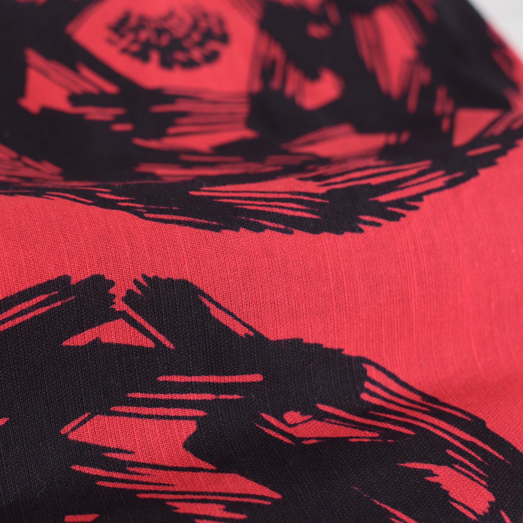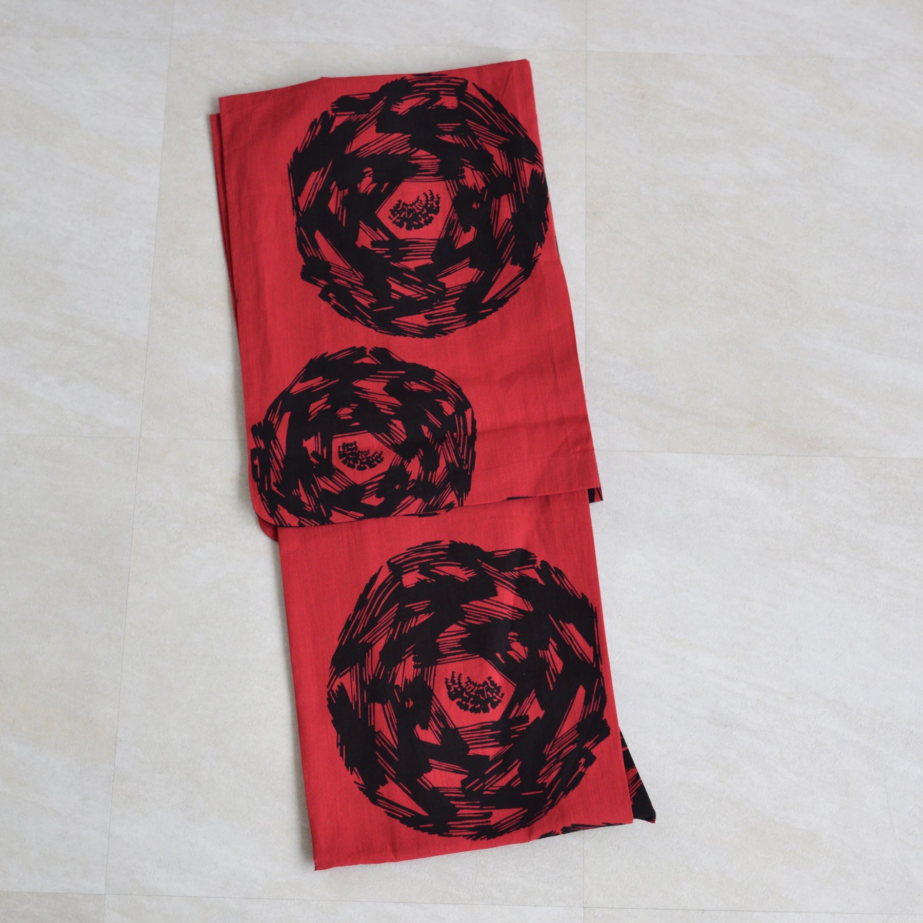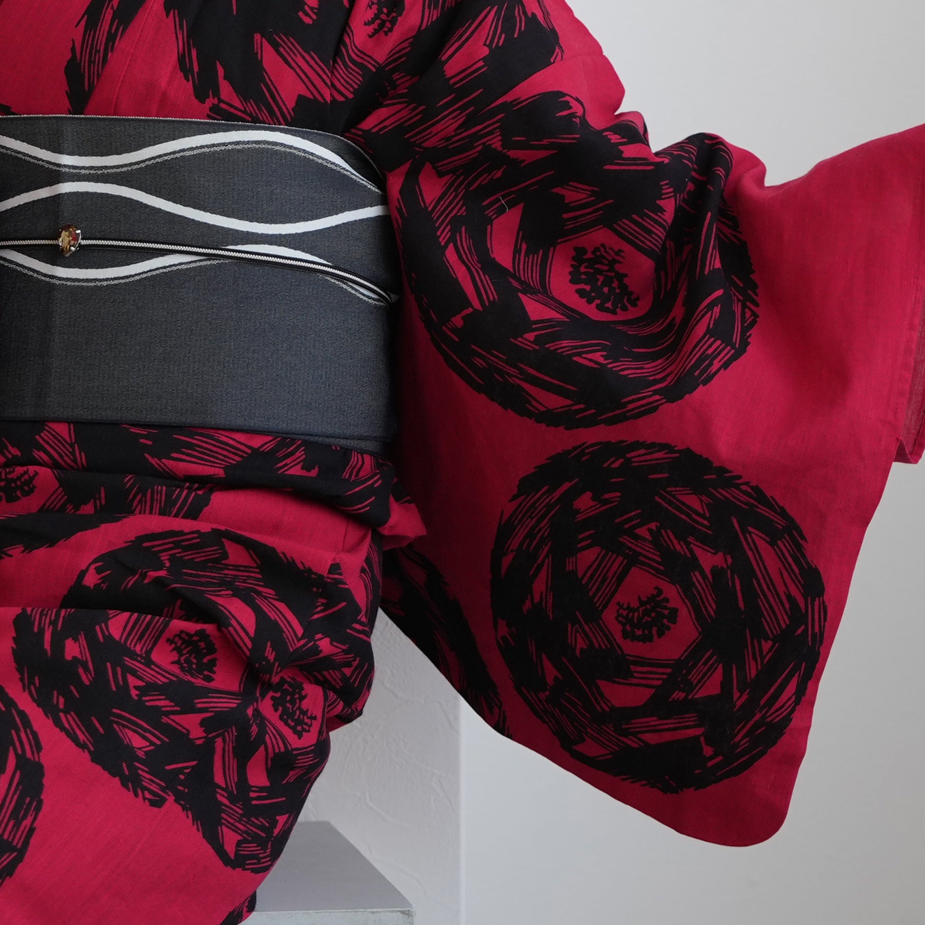 ハッとするほど鮮やかな赤に、力強く描かれた漆黒の輪。伝統とモダンが交差する、utatane最高峰の注染シリーズから特別な一着をお届けします。