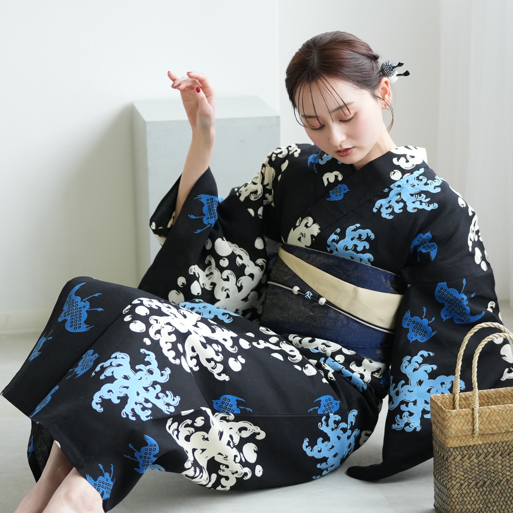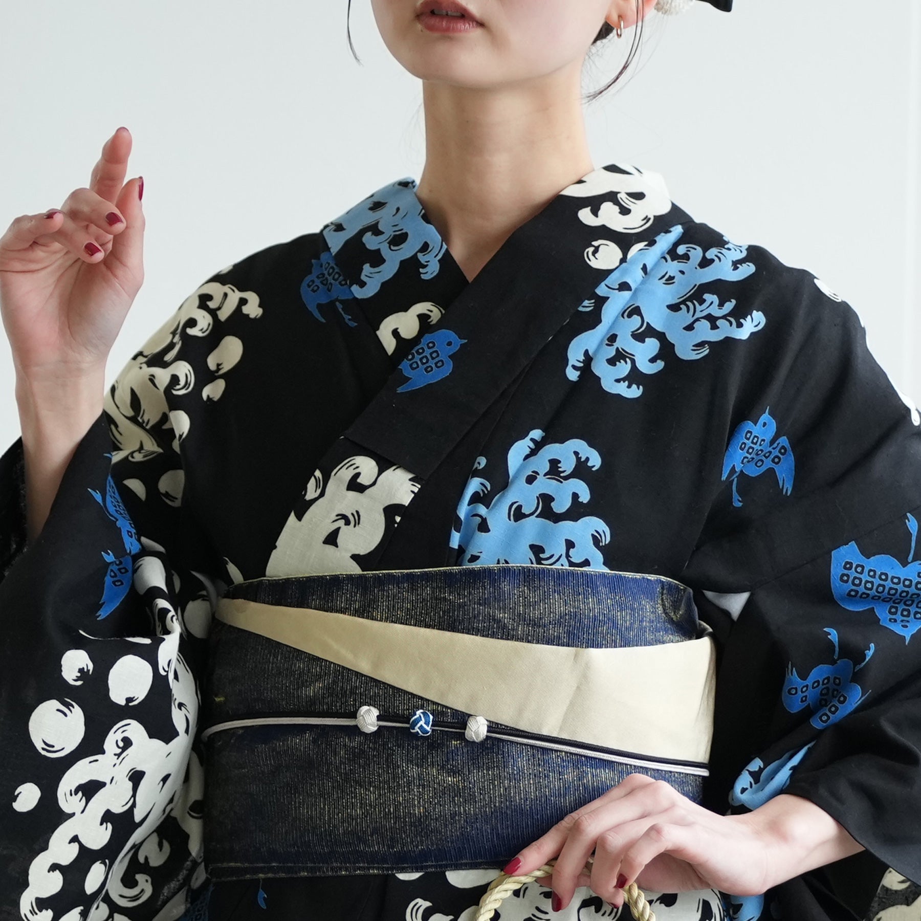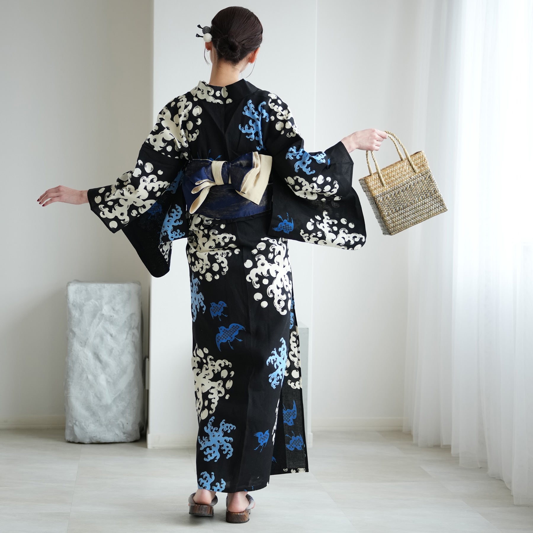 奈良の職人が、伝統的な「注染(ちゅうせん)」技法を用いて染め上げた逸品です。漆黒の地に、パッと弾けるような波の花や水しぶきを思わせる文様。注染特有の「染め際のにじみ」や「ぼかし」が、一つ一つの柄に立体感と呼吸を与えています。赤坂紬のような表情豊かな日本製小幅生地(コットン100%)を使用し、国内縫製で仕立てられたこの浴衣は、袖を通すたびに職人の誇りを感じさせてくれます。