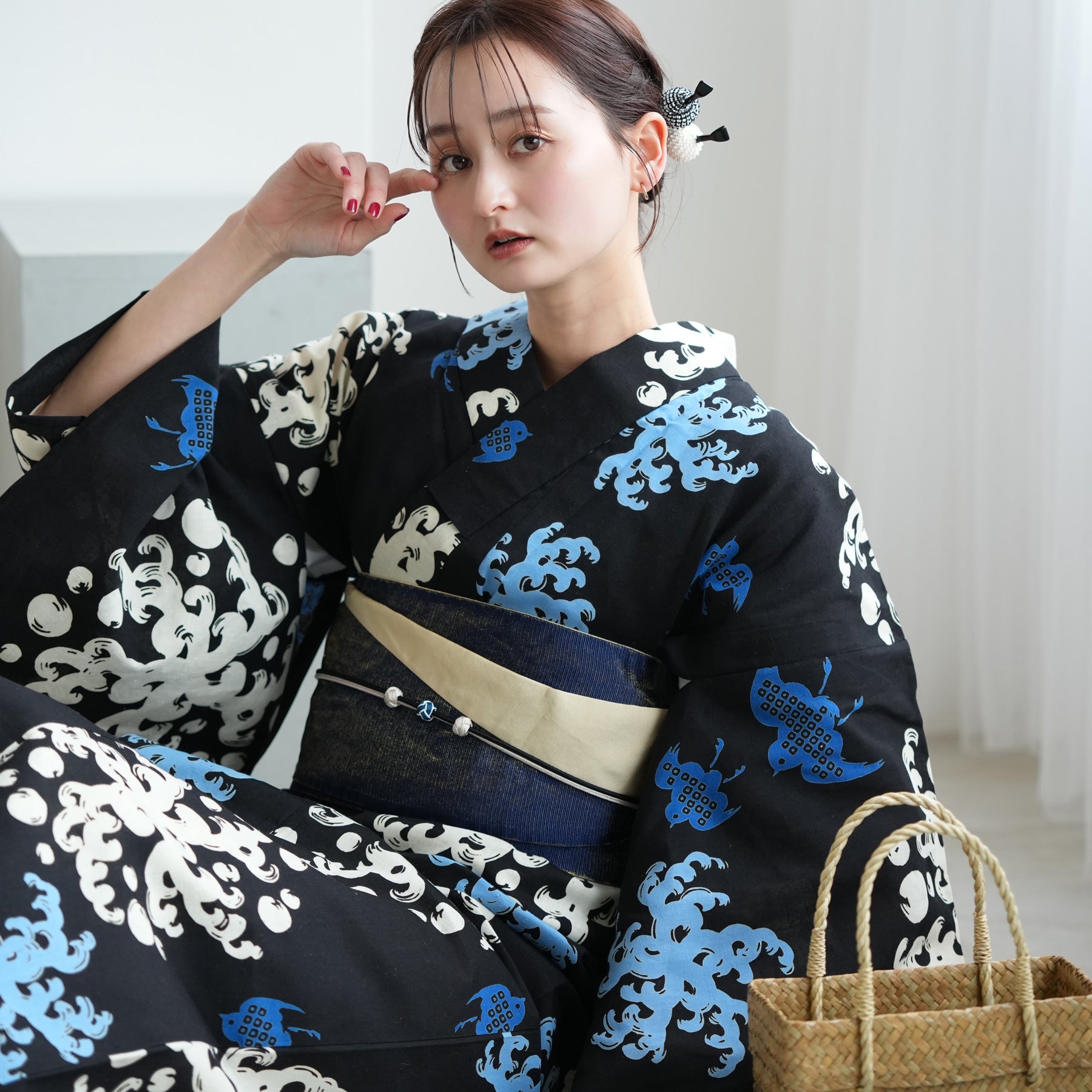 〇帯・小物: セットの帯は、浴衣の柄を引き立てる絶妙な色調。モデル着用のように、少し明るいトーンを挟むことで、全体の印象が重くなりすぎず、洗練された印象になります。