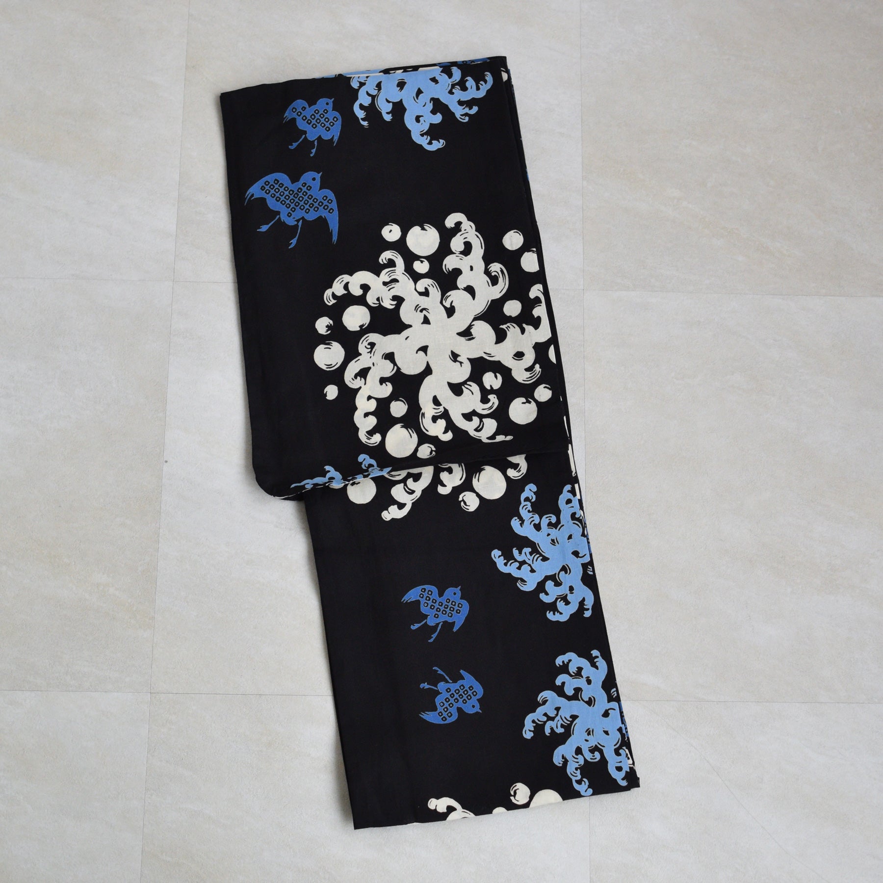 黒地に鮮やかな白と青が躍る、幻想的な一着。