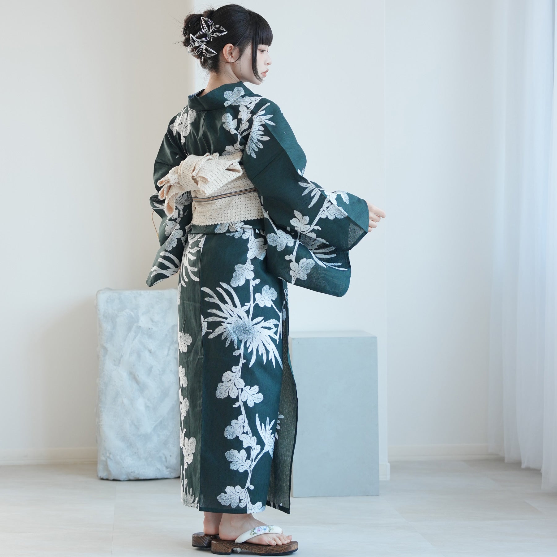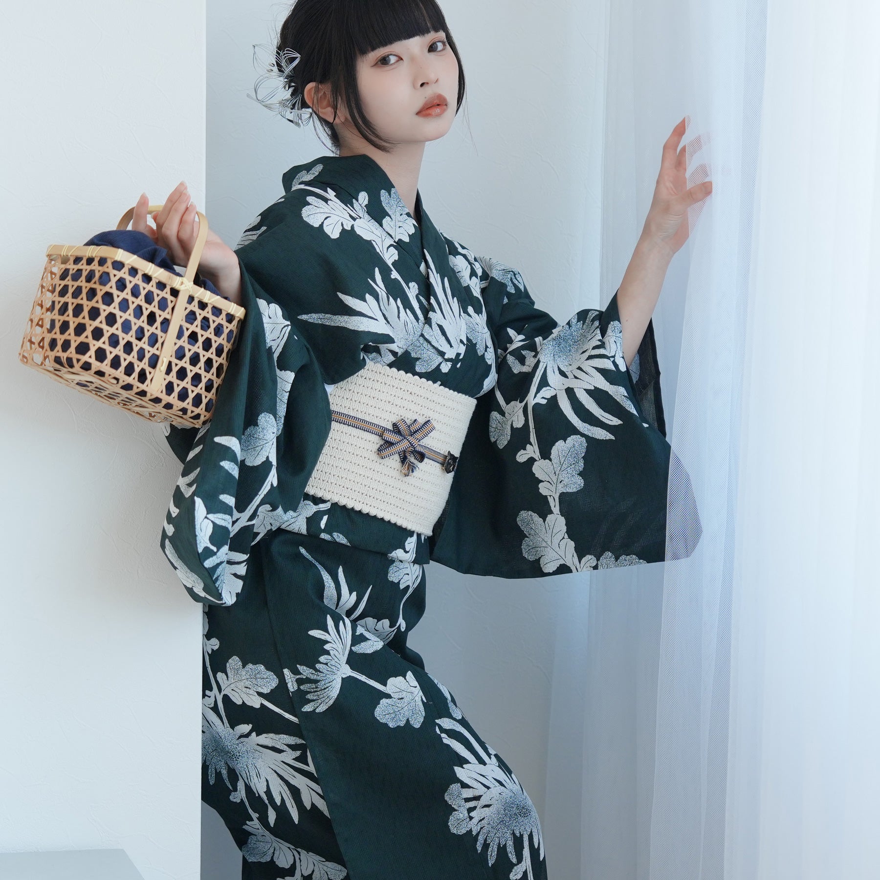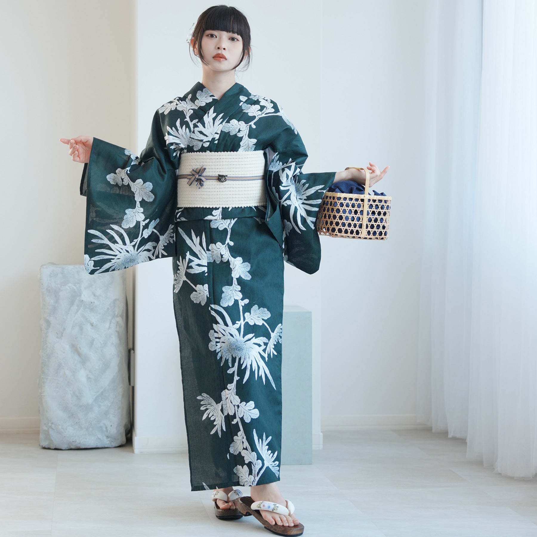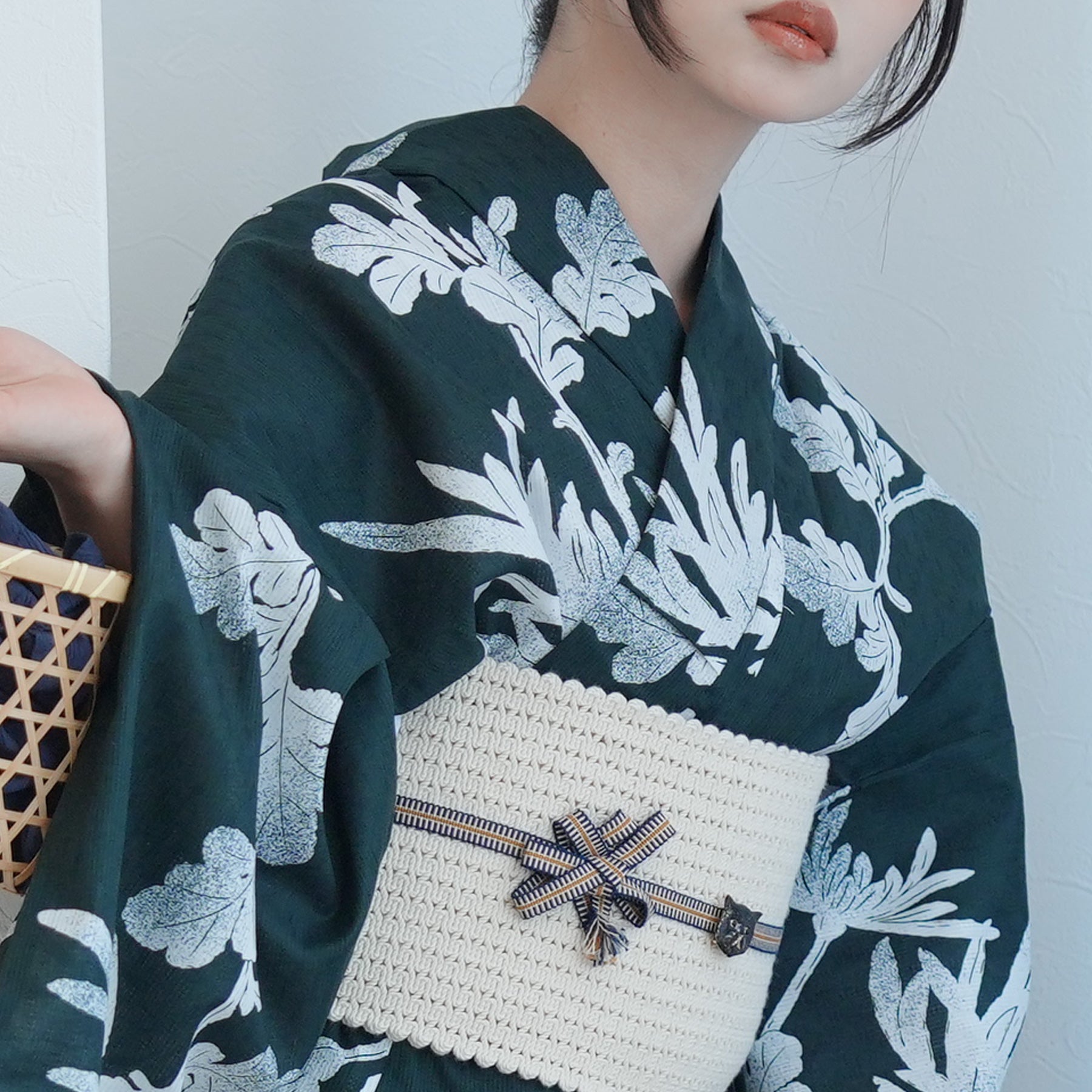 錆緑の渋みと、菊の白が織りなすコントラストは、花火大会や夏祭りだけでなく、