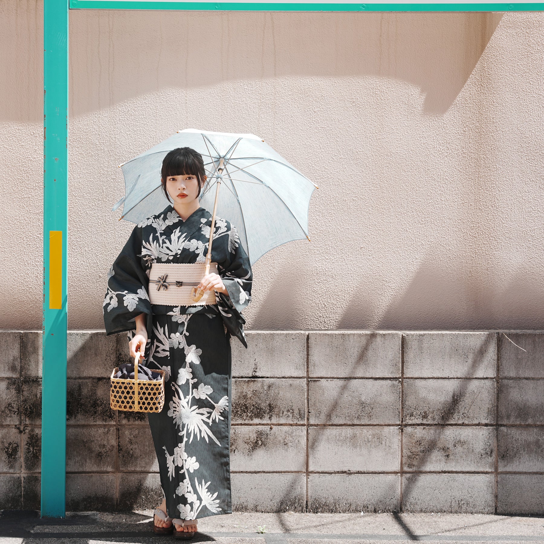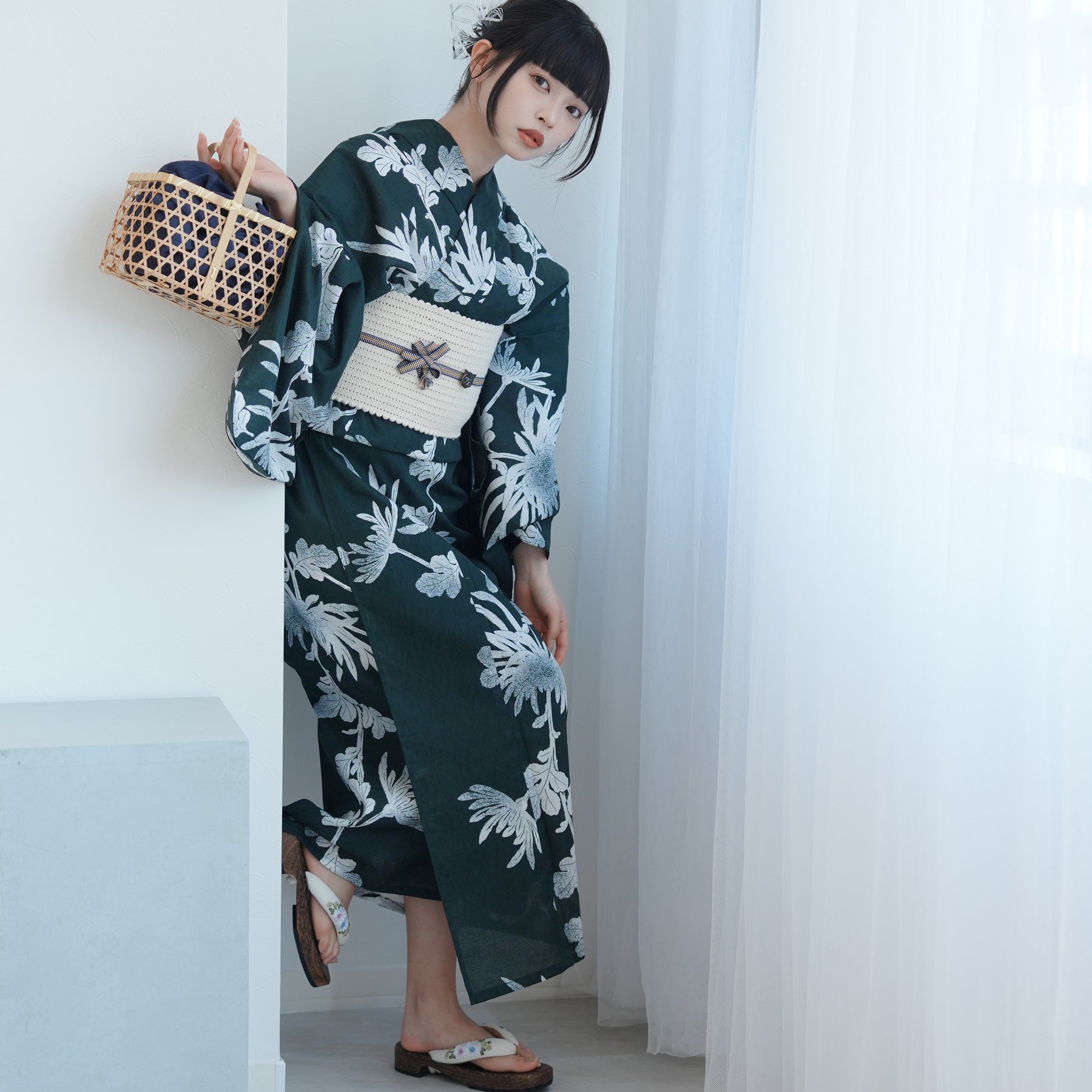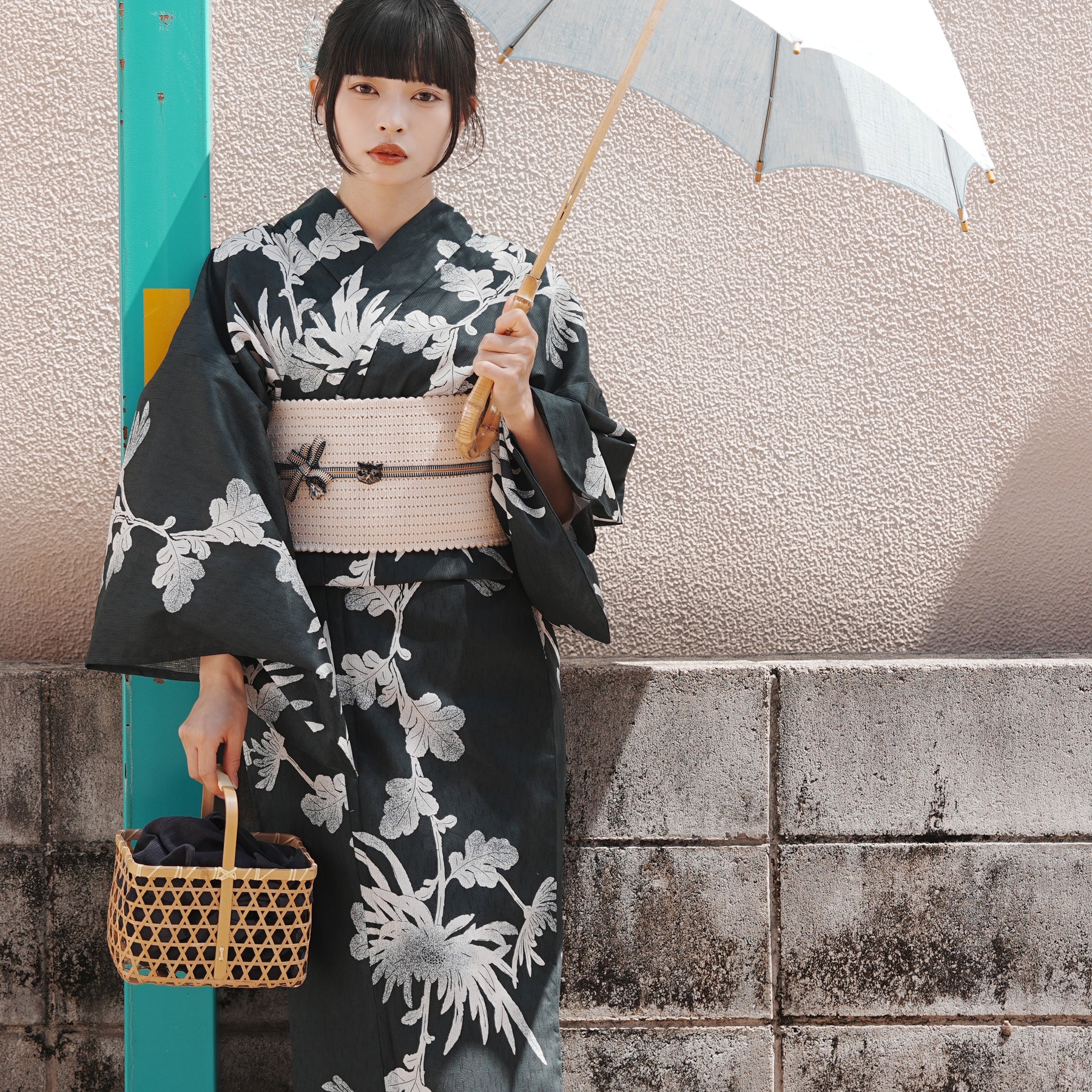 錆緑の渋みと、菊の白が織りなすコントラストは、花火大会や夏祭りだけでなく、