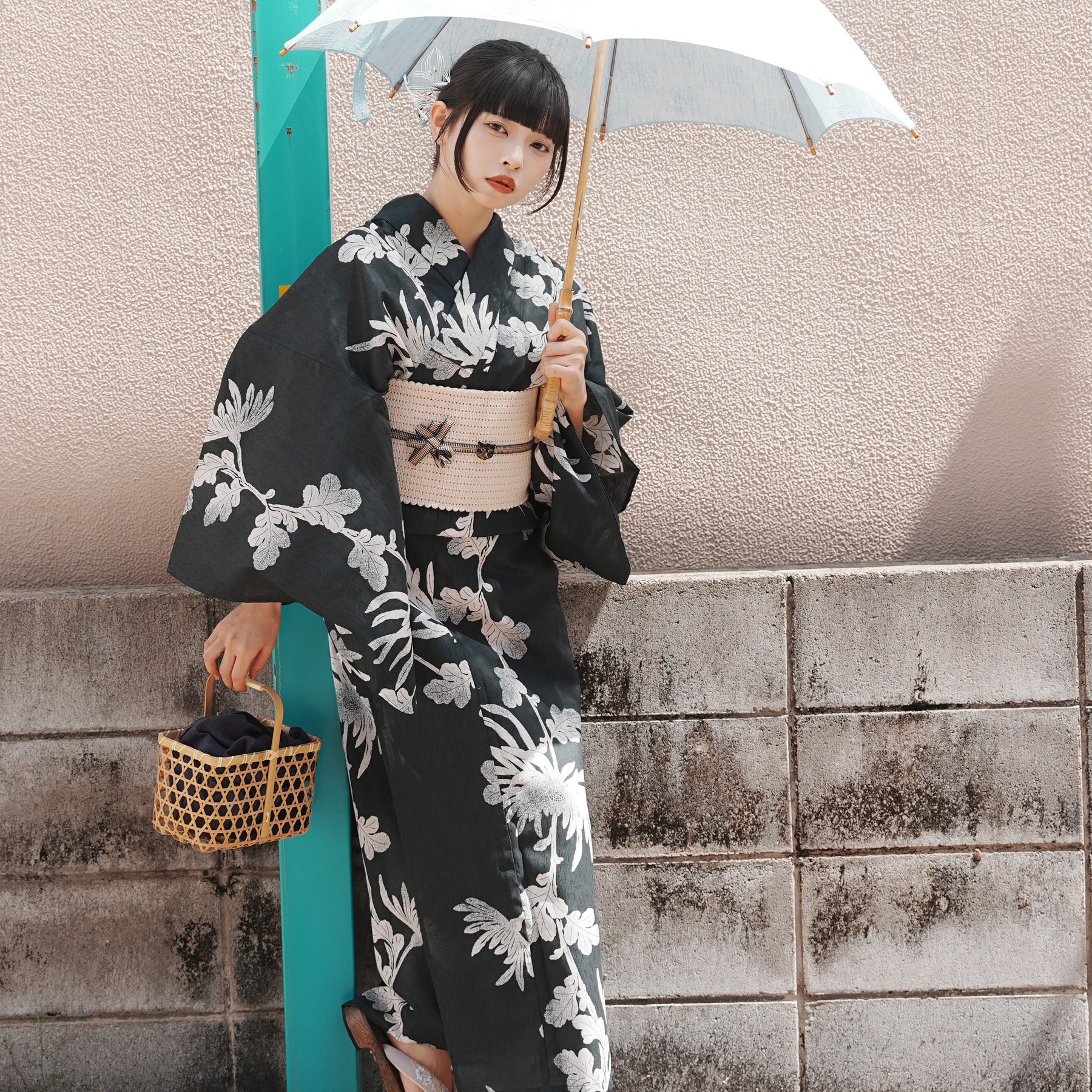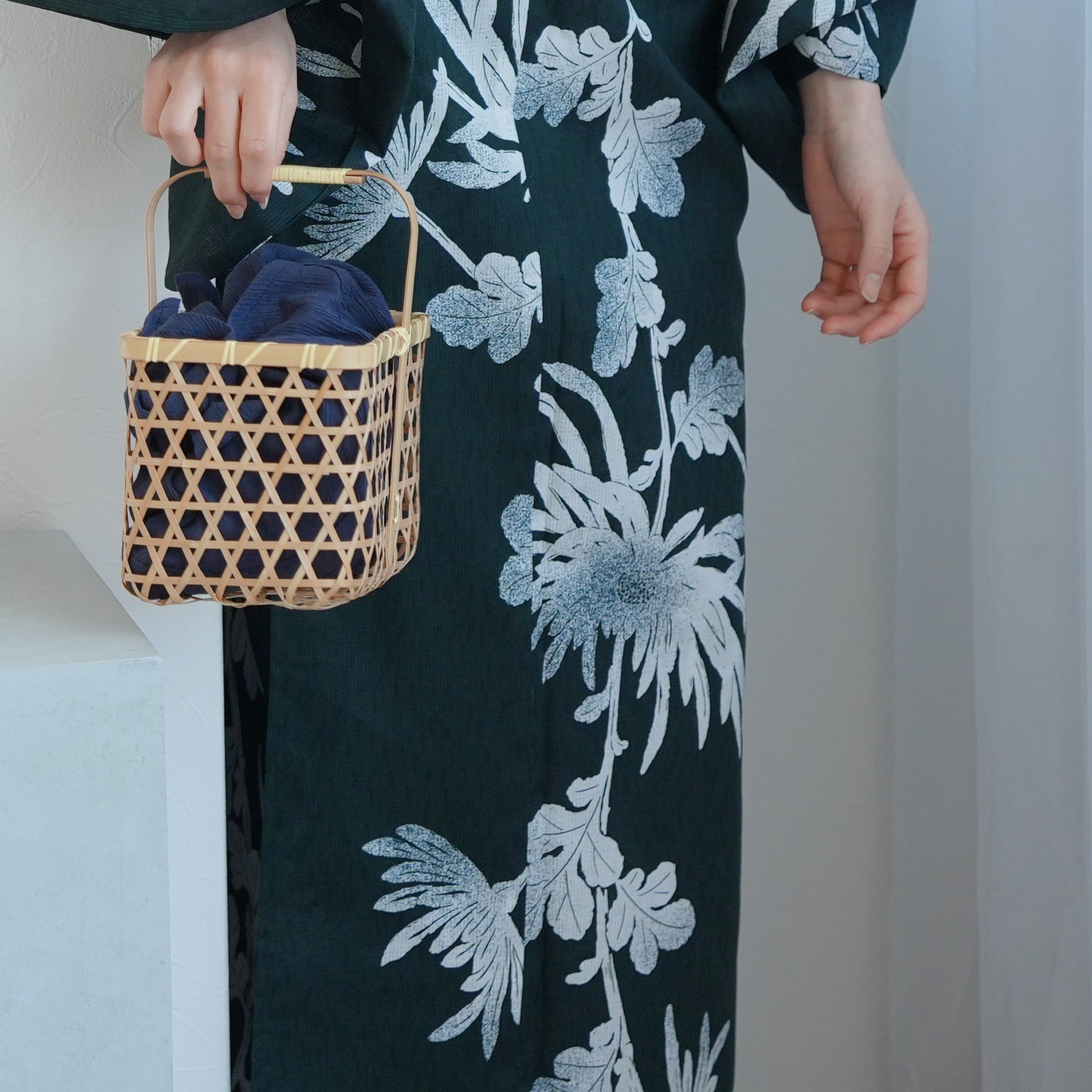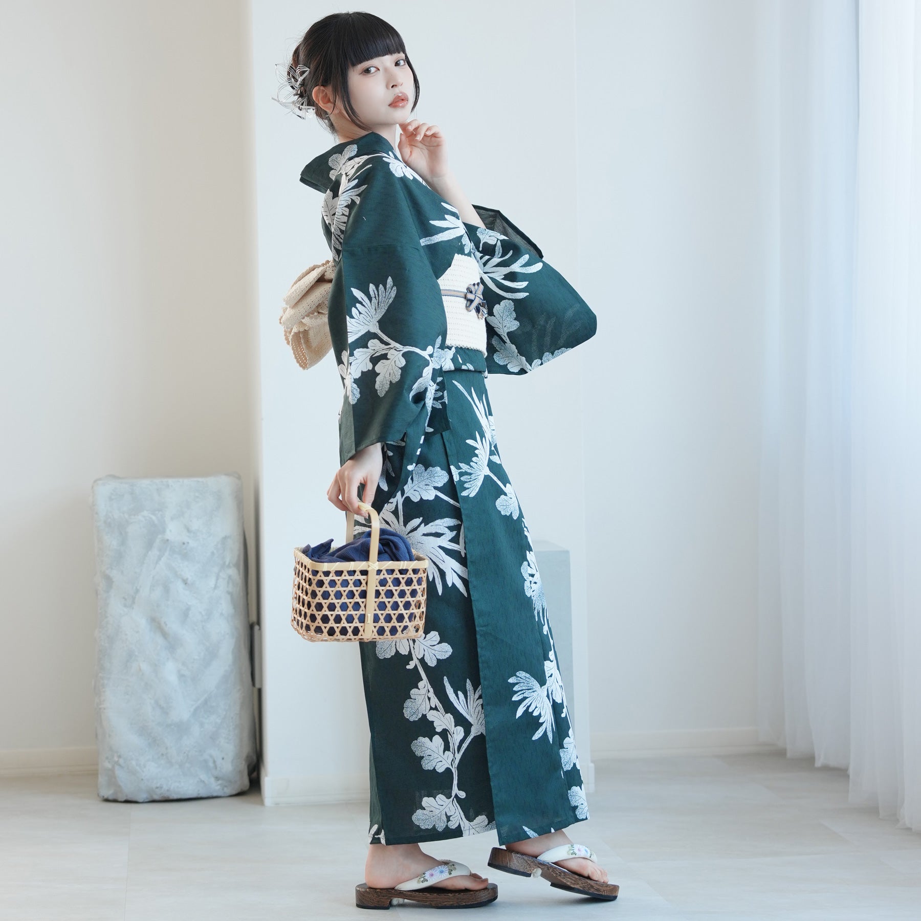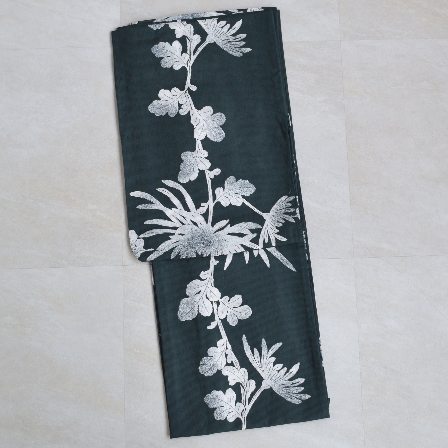 錆緑の渋みと、菊の白が織りなすコントラストは、花火大会や夏祭りだけでなく、