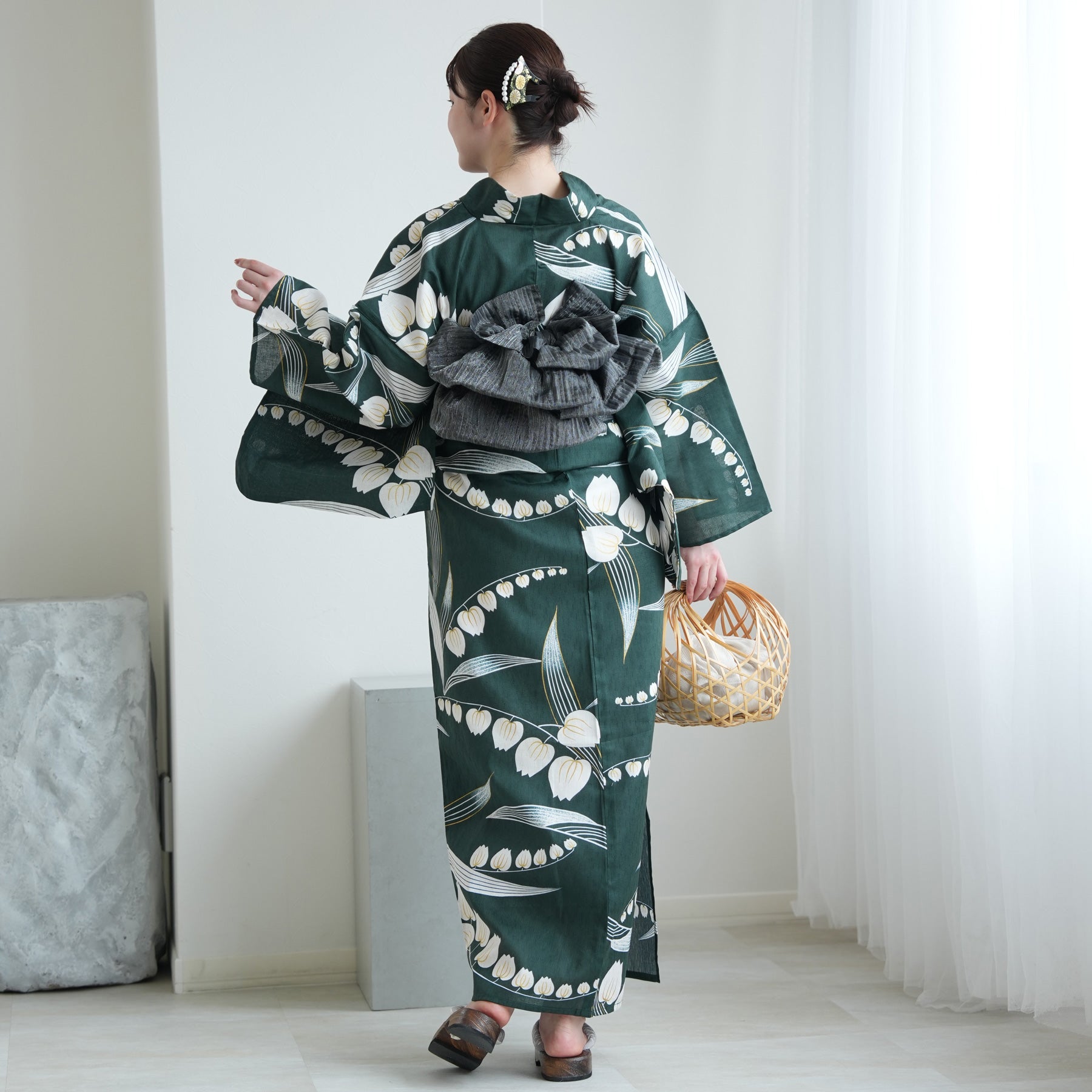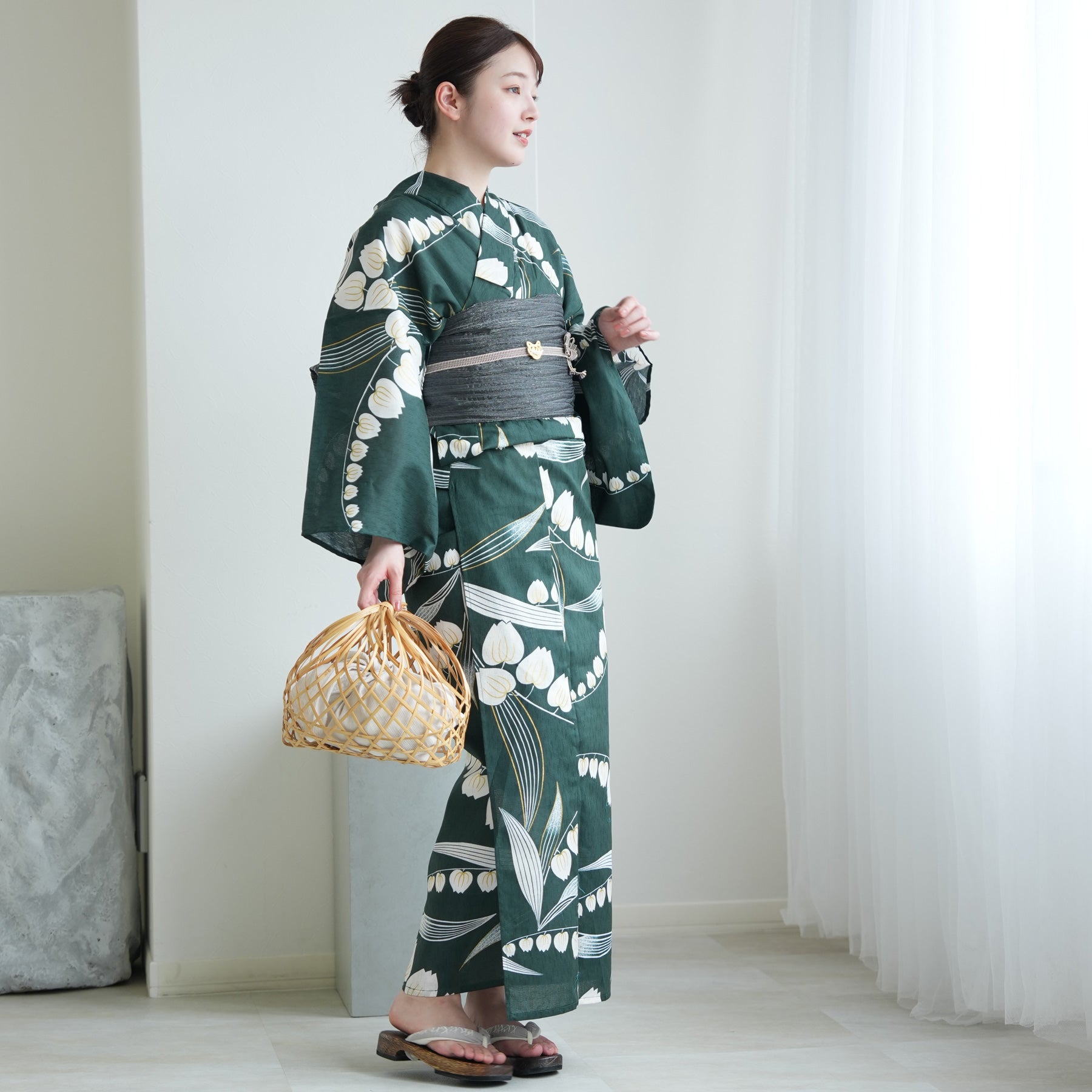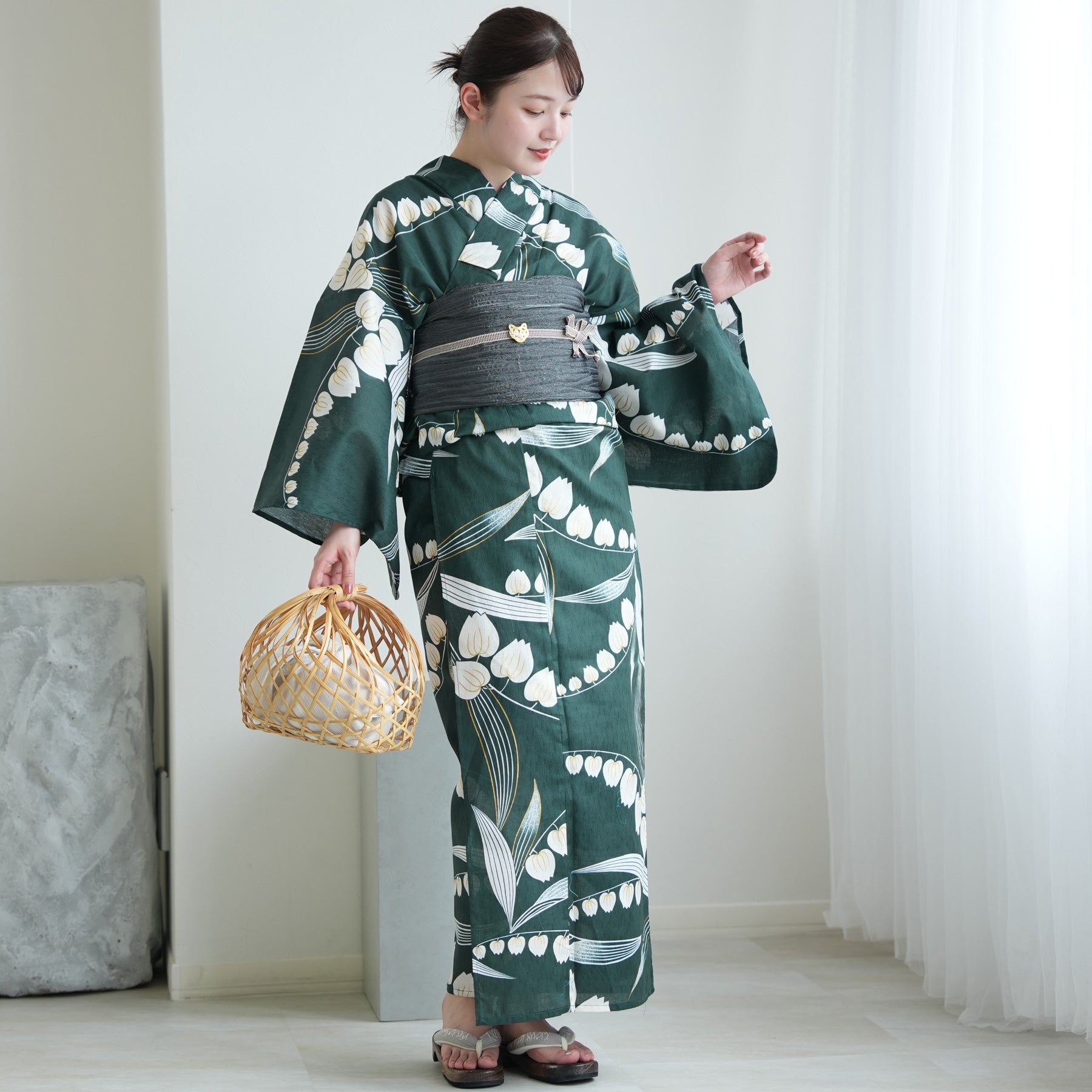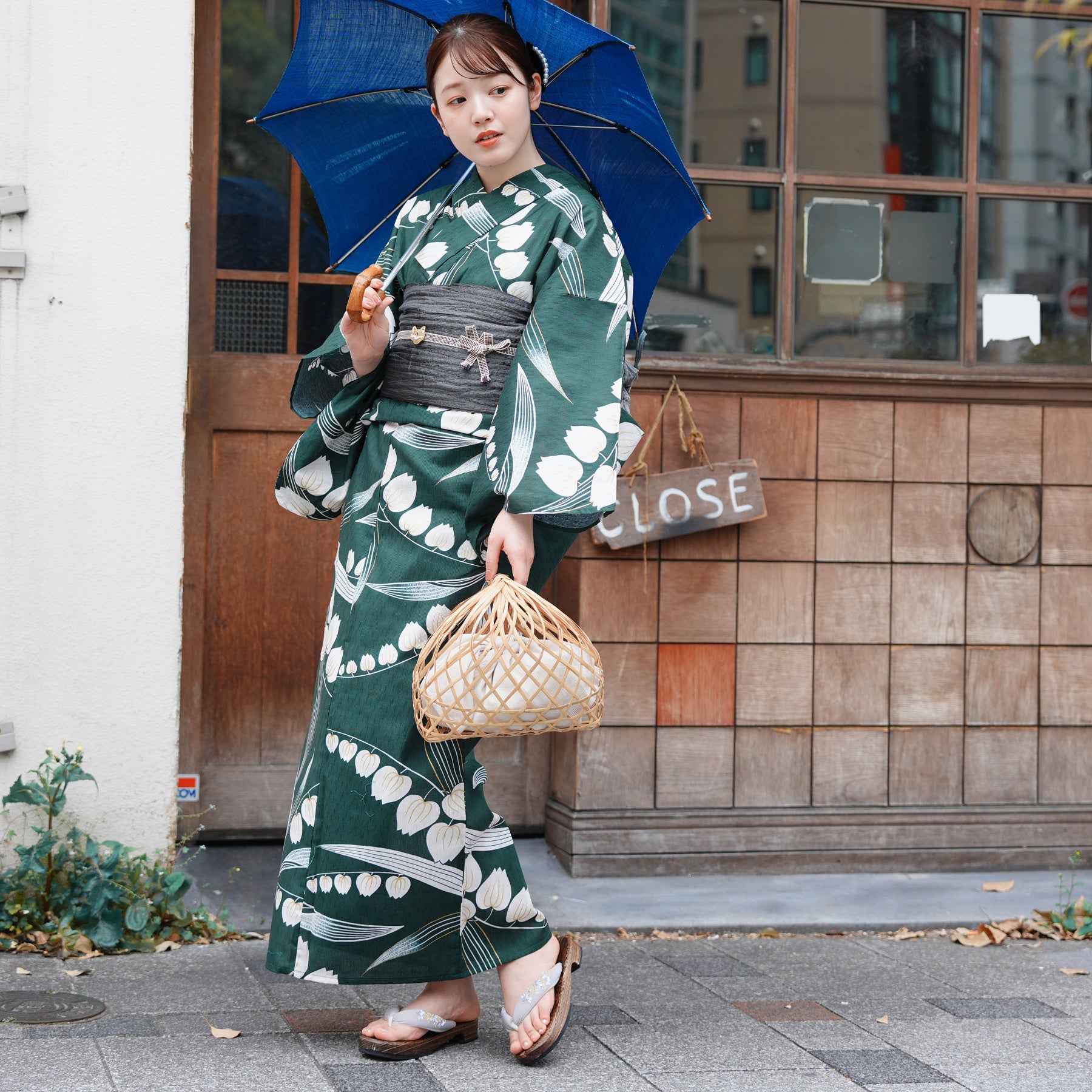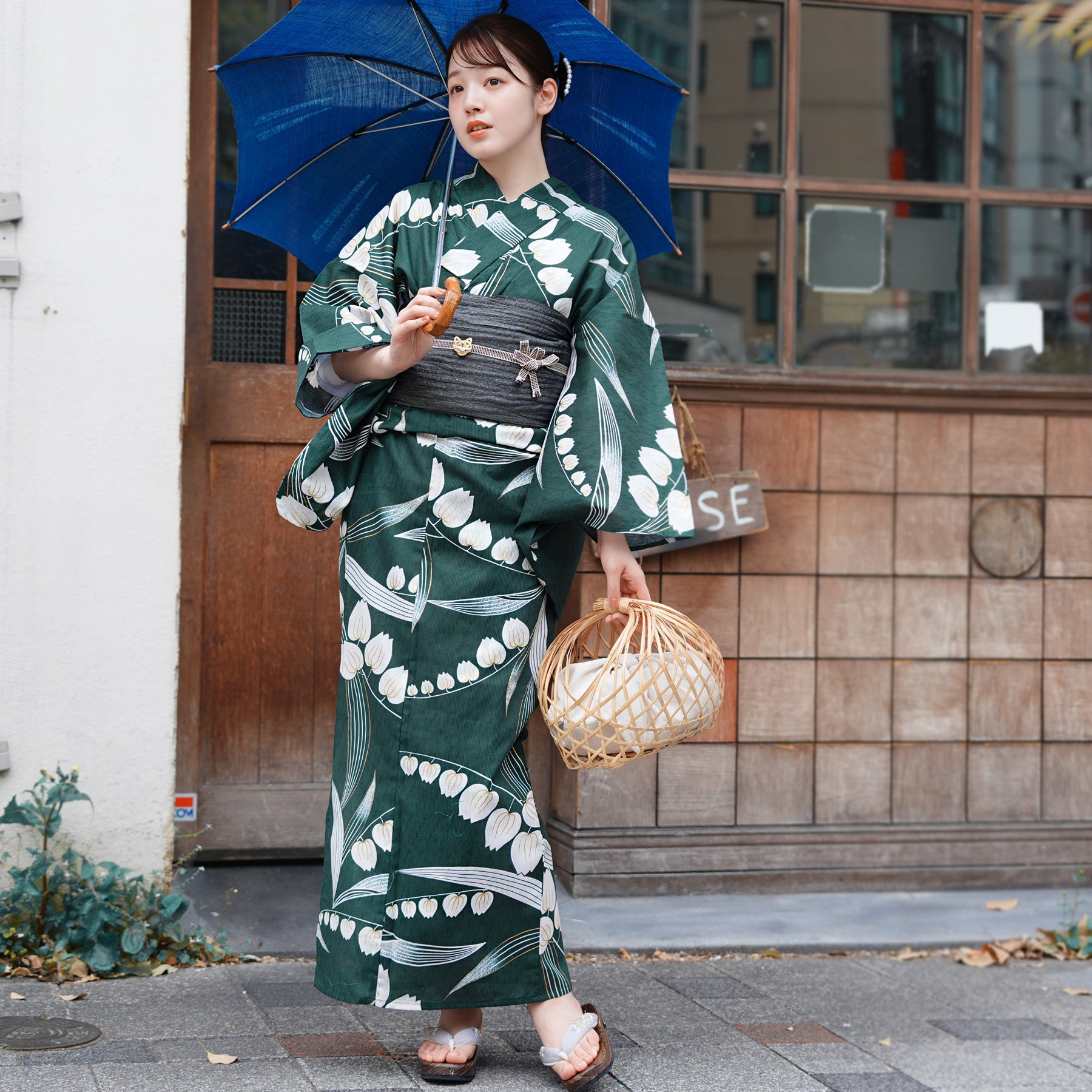 竹かごバッグやレースの足袋を合わせて、自分らしいコーディネートを楽しんで。