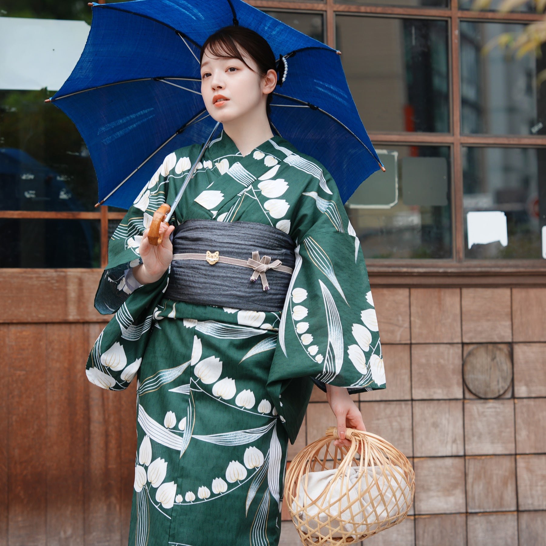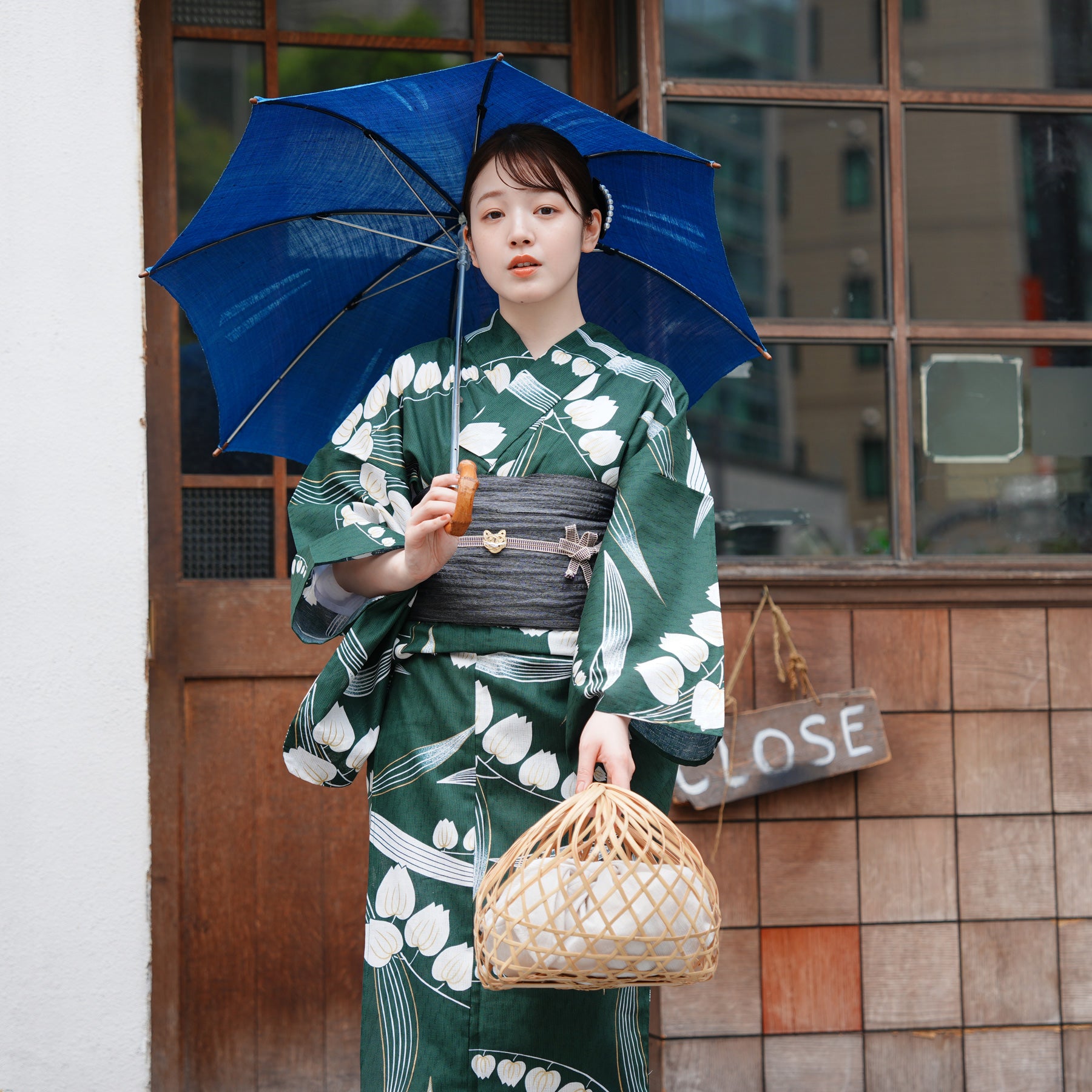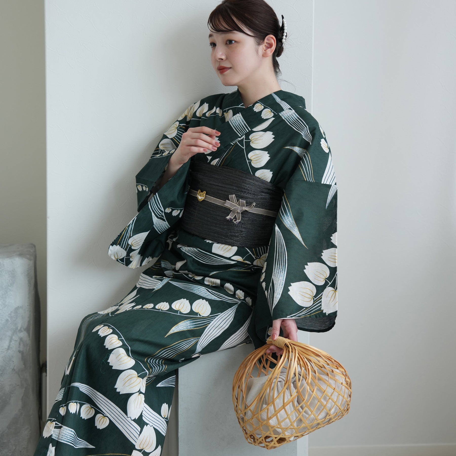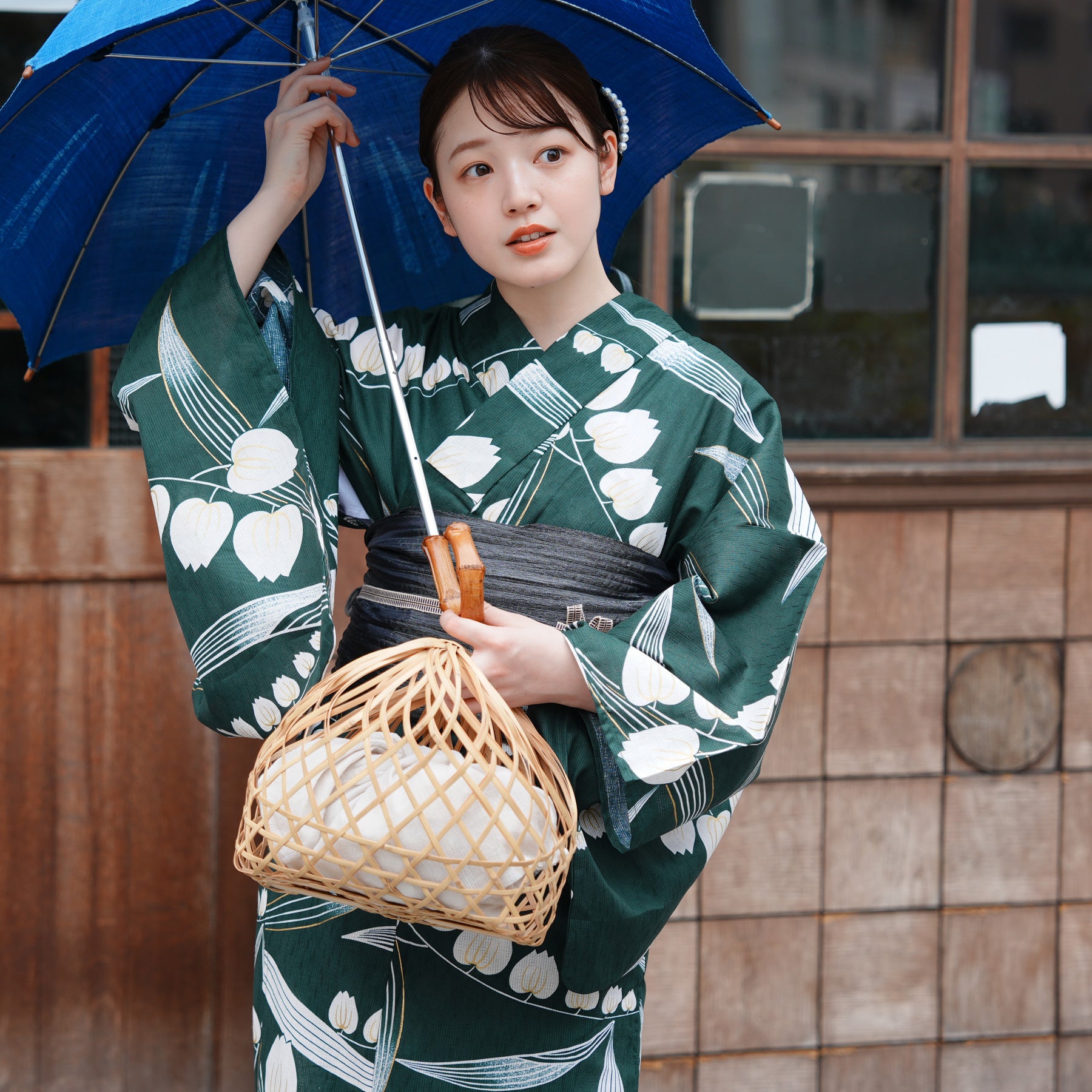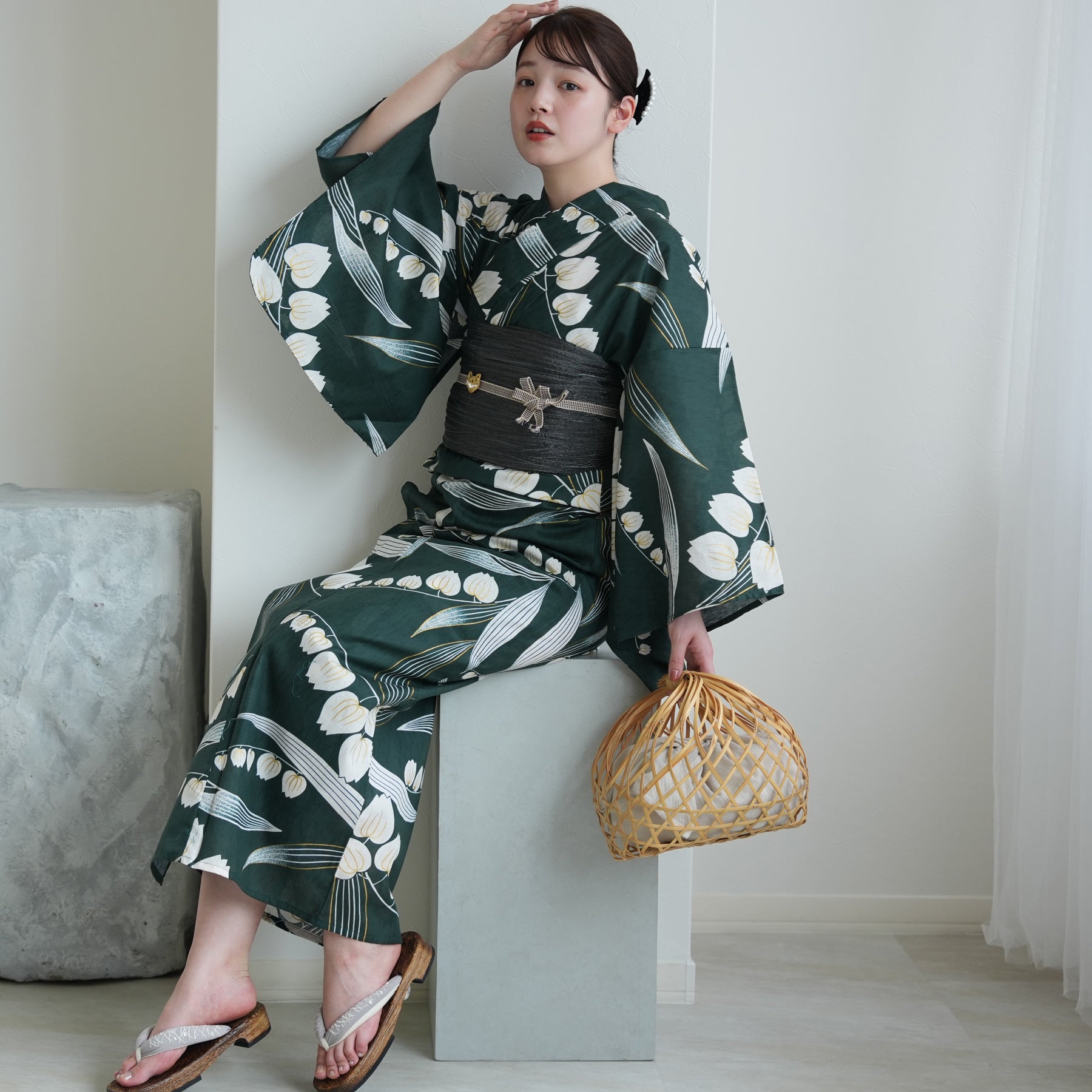 竹かごバッグやレースの足袋を合わせて、自分らしいコーディネートを楽しんで。