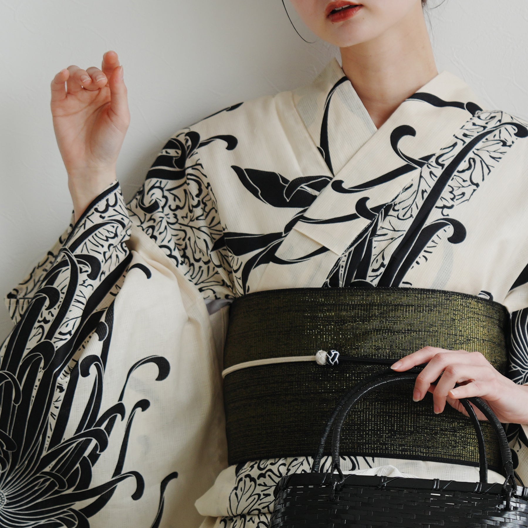 帯のゴールドラメがアクセントになり、モノトーンの中に華やかさを添えてくれます。