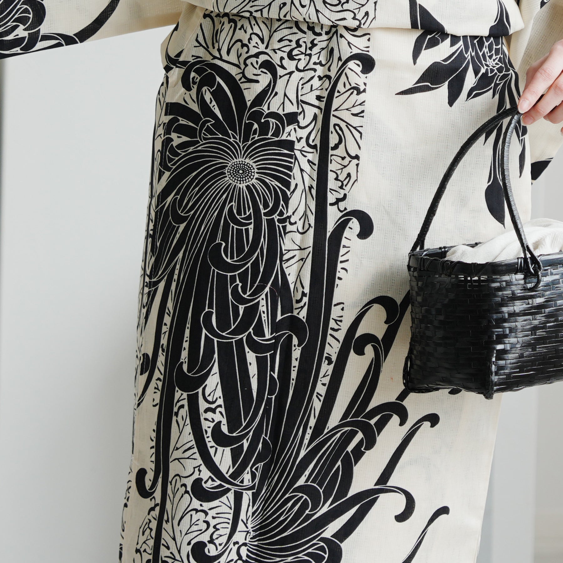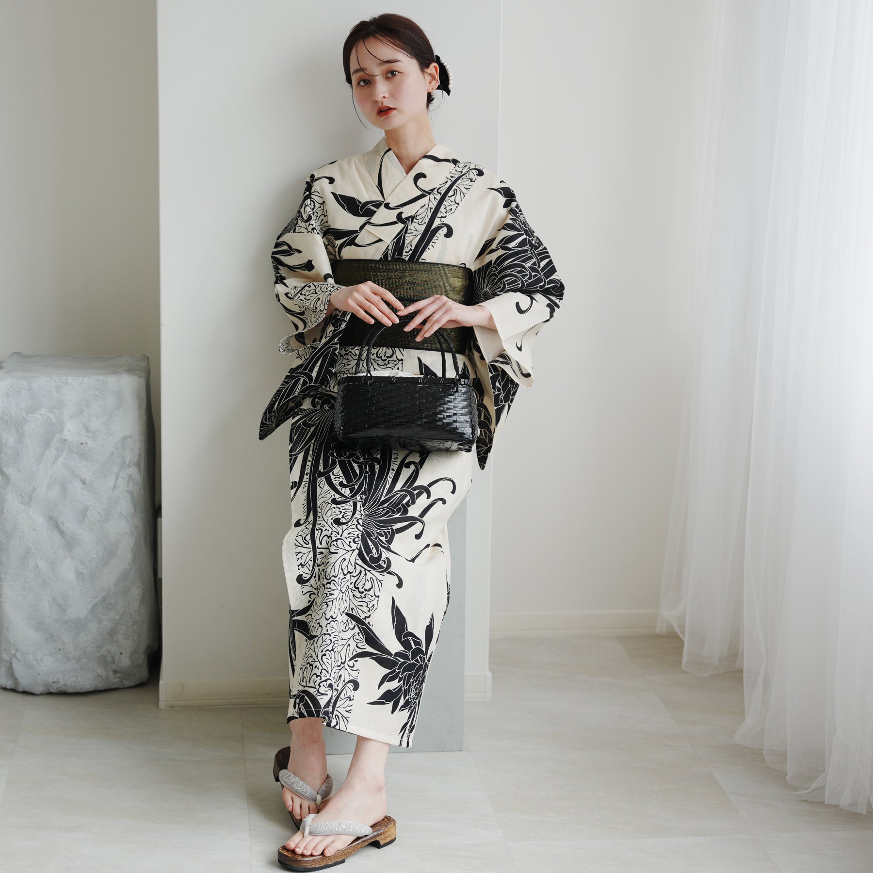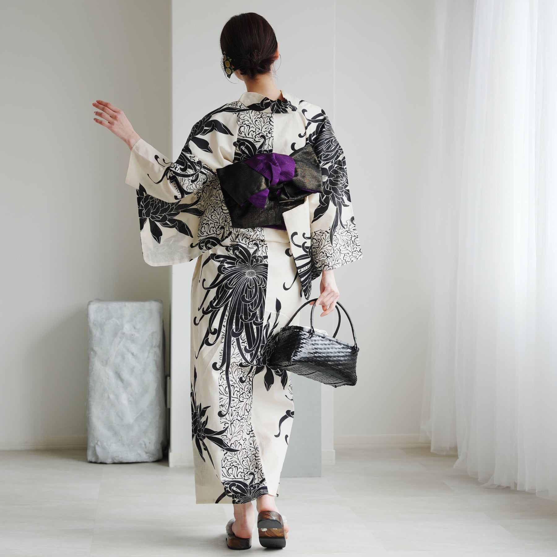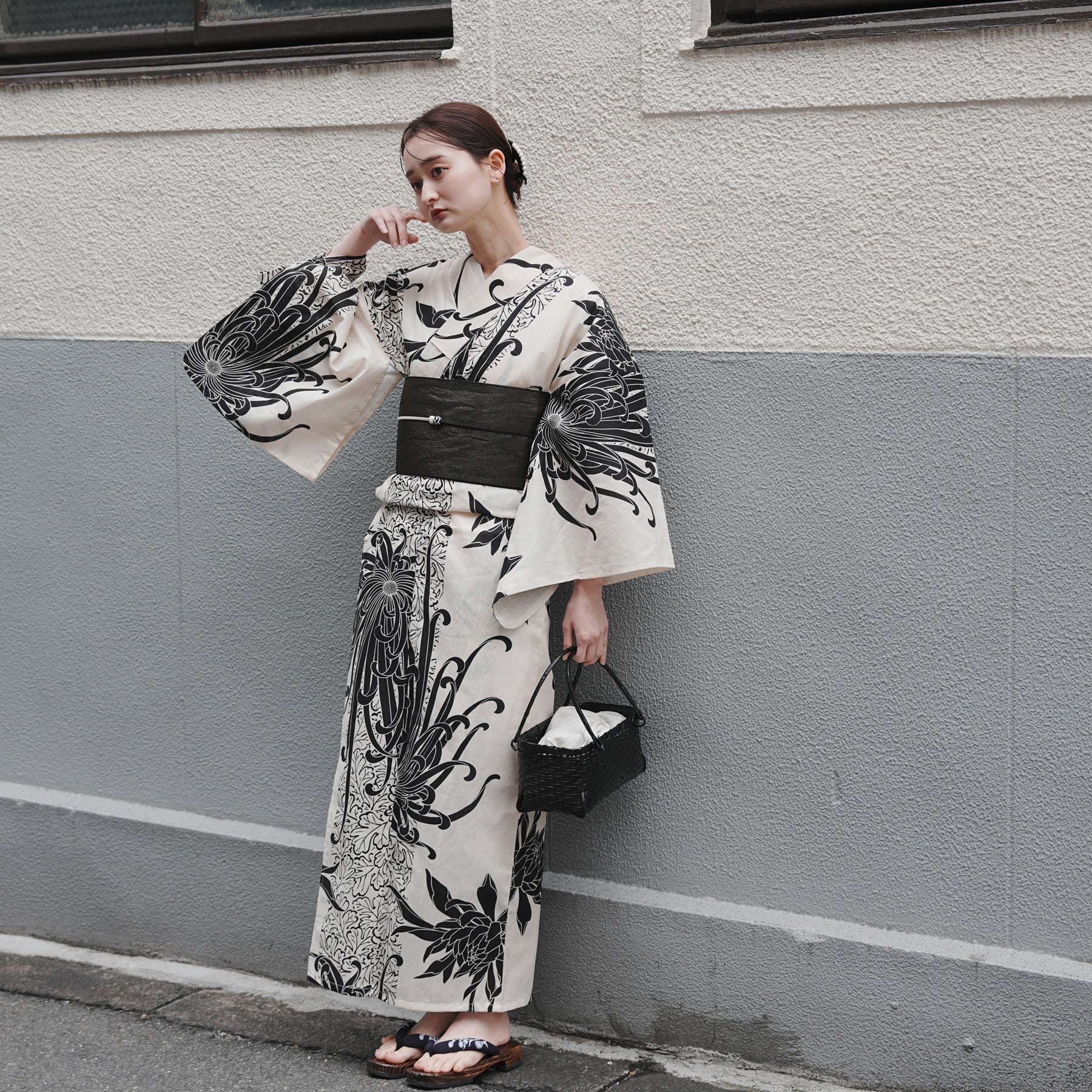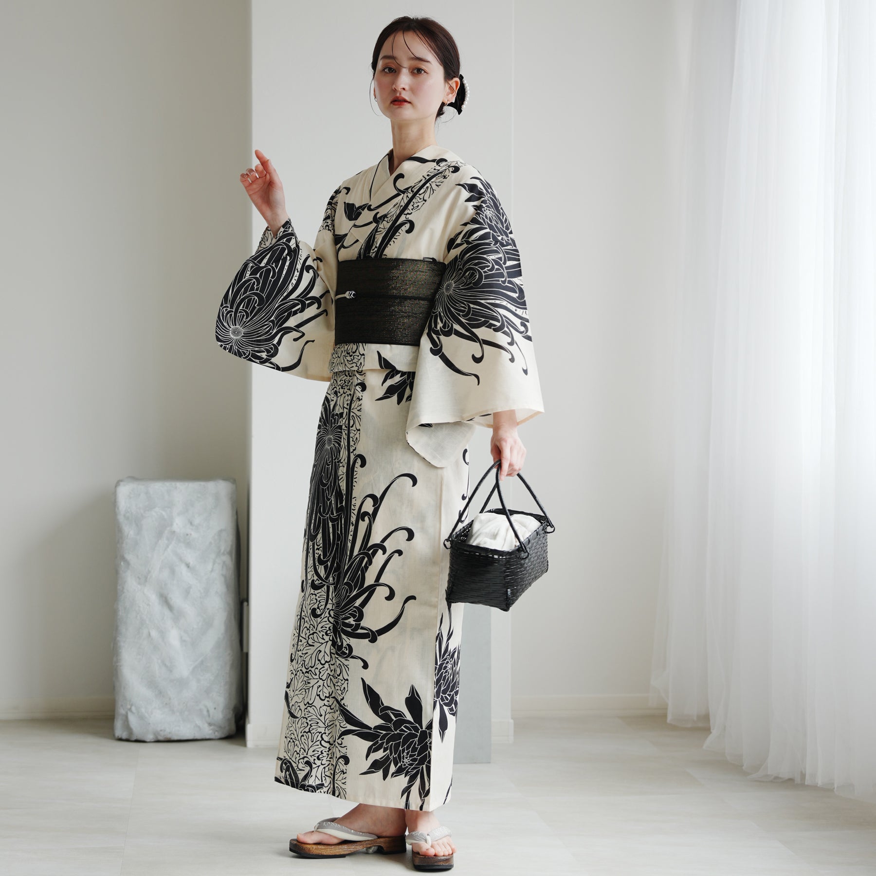 【utatane 高級変わり織 浴衣3点セット(浴衣・帯・下駄)きなりに粋黒の大輪染め分け乱菊】フリーサイズ 希少図案を現代に復刻 国産生地・国内染色(5010298311)