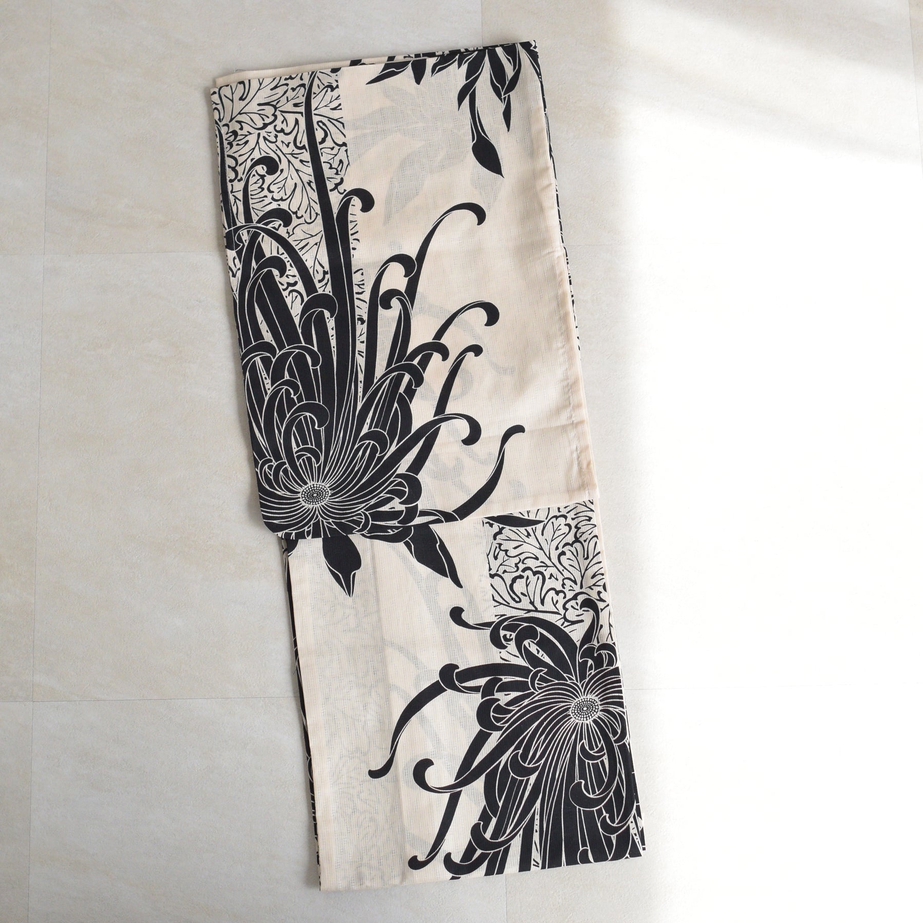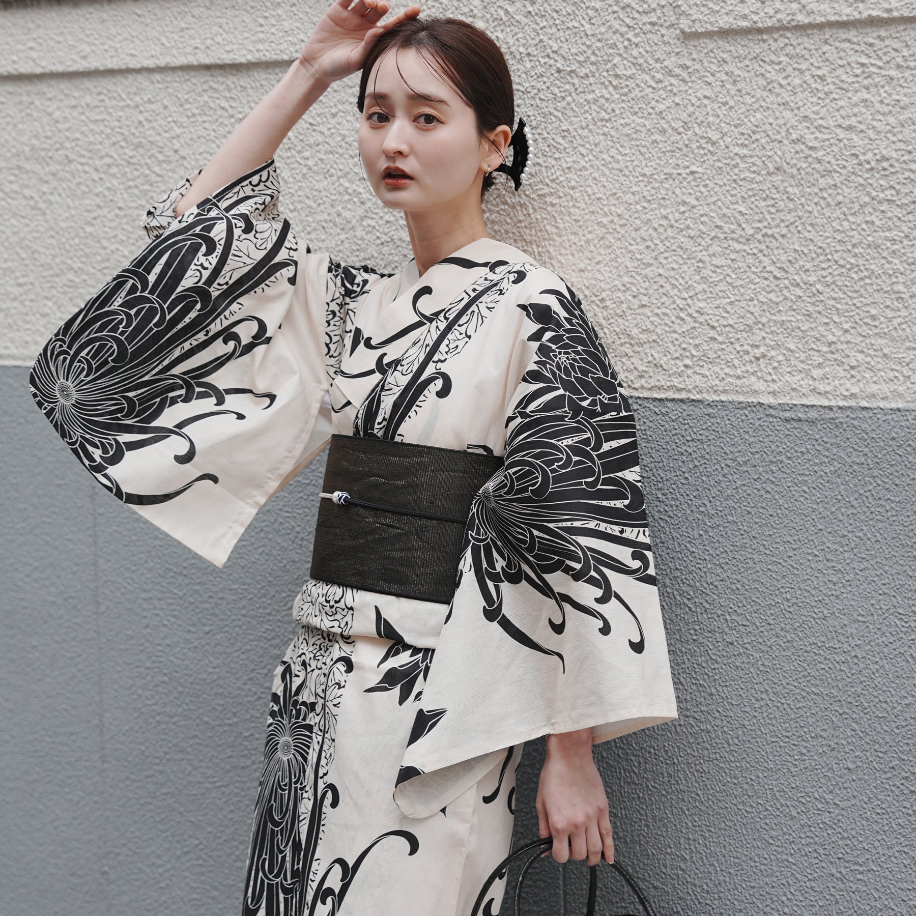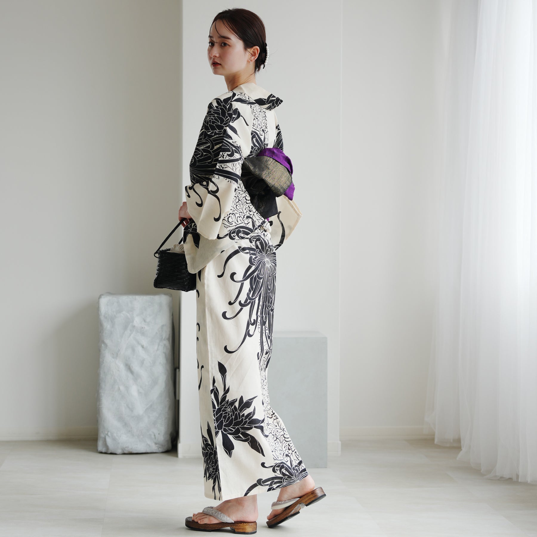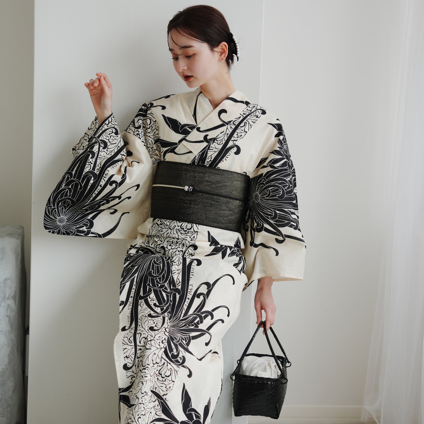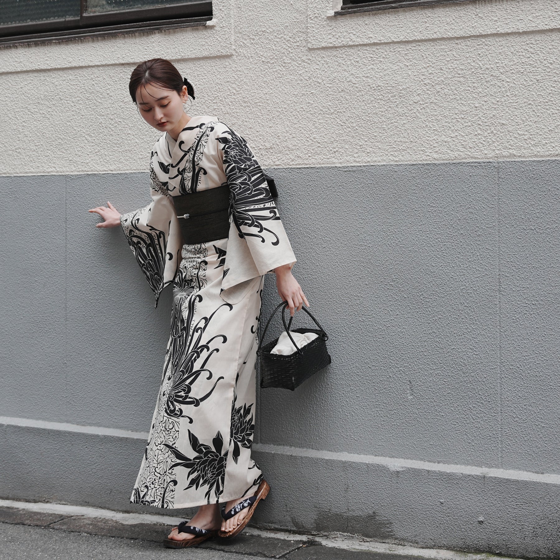 【utatane 高級変わり織 浴衣3点セット(浴衣・帯・下駄)きなりに粋黒の大輪染め分け乱菊】フリーサイズ 希少図案を現代に復刻 国産生地・国内染色(5010298311)
