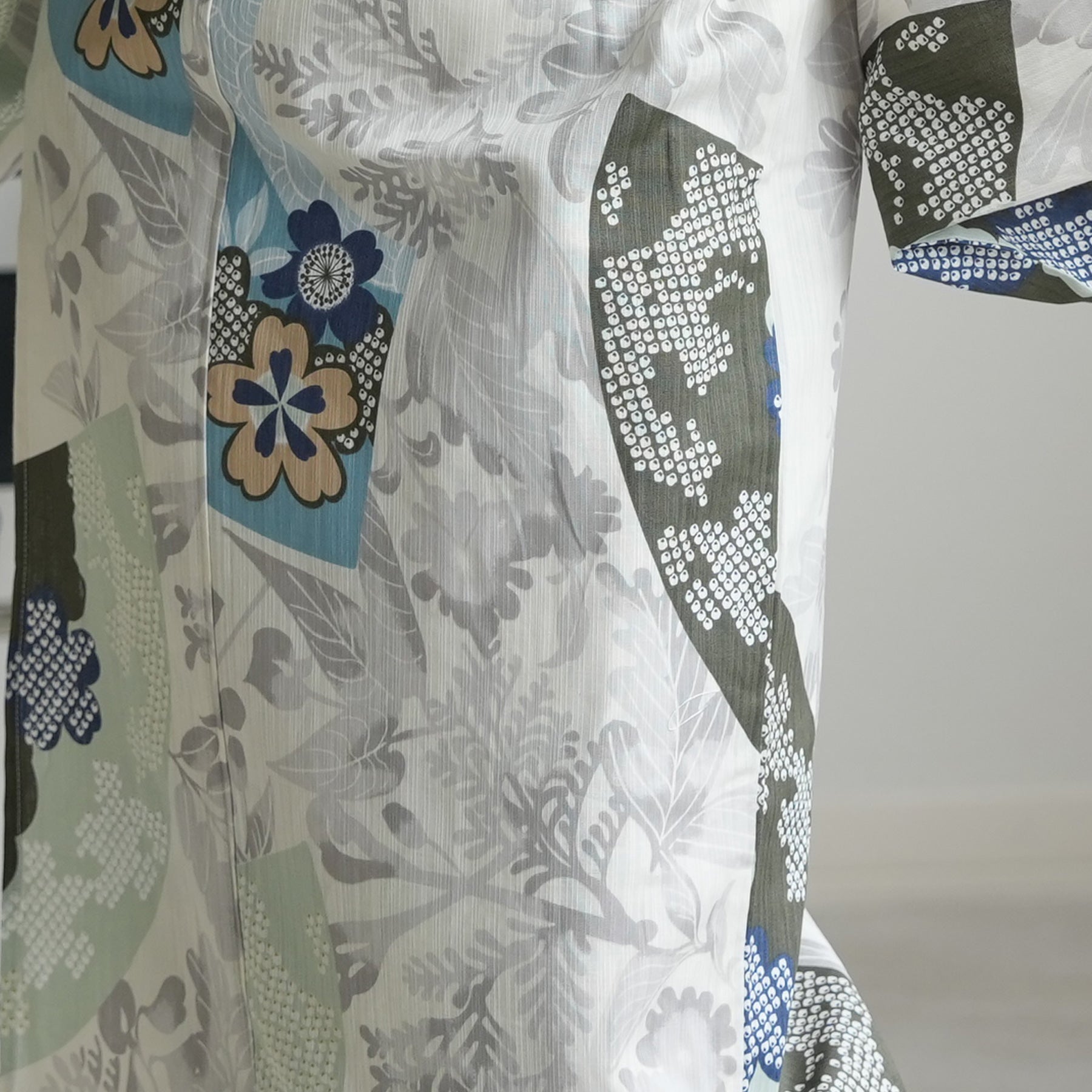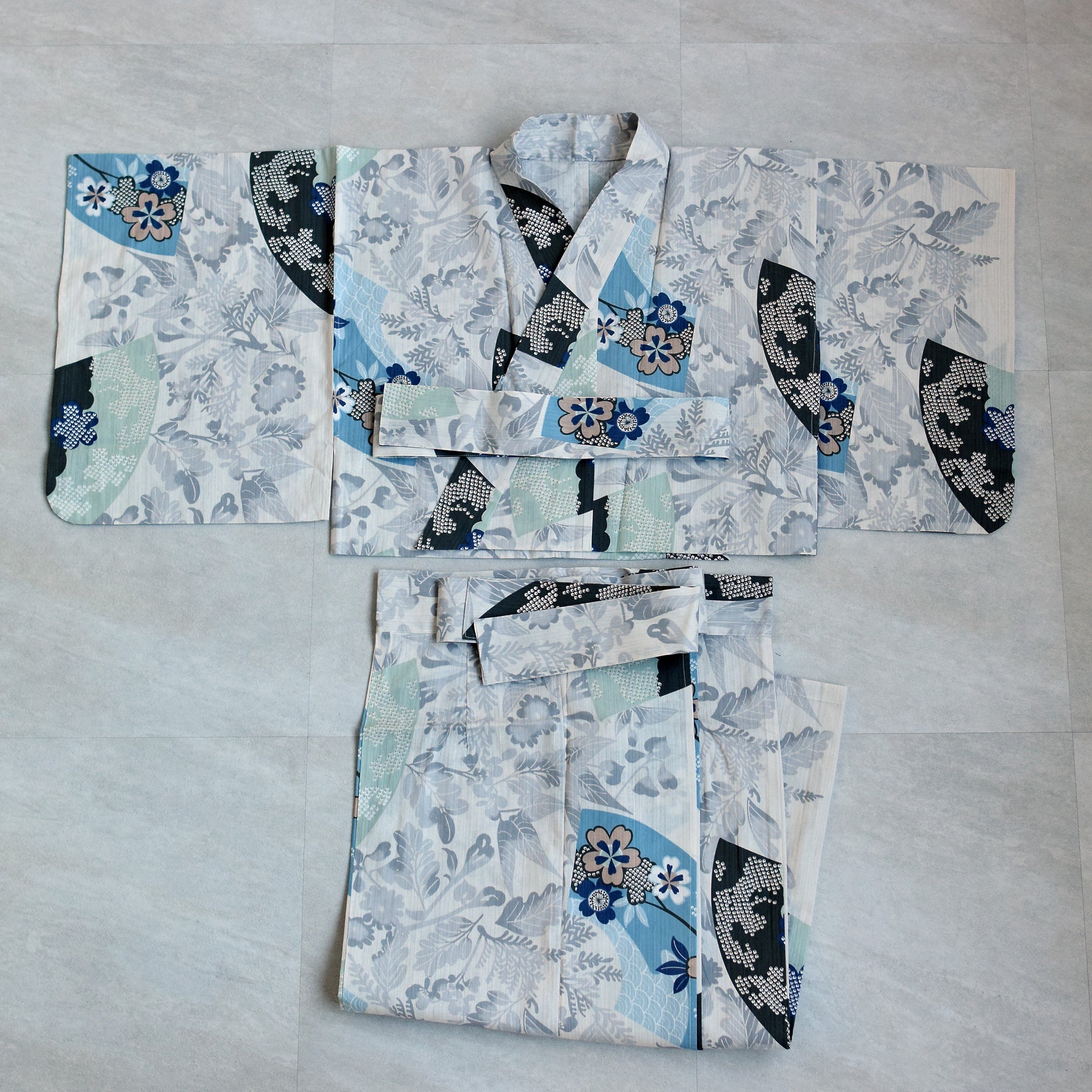 【セパレート高級変わり織 二部式浴衣3点セット ( ゆかた上下・帯・下駄 )ラムネ色の扇面と儚い花】フリーサイズ  国産生地 国内染色 昭和初期アンティーク復刻版 (5016278011)
