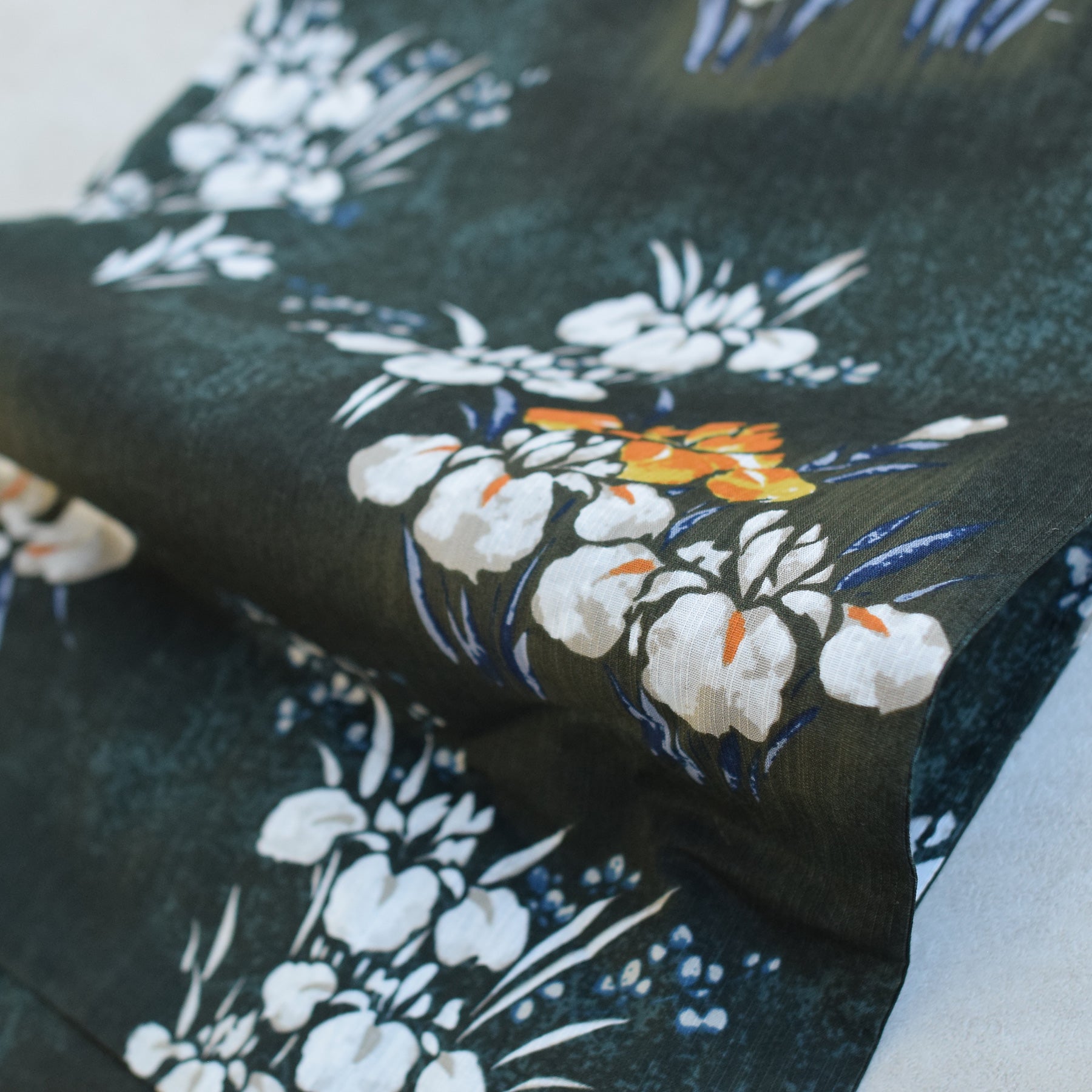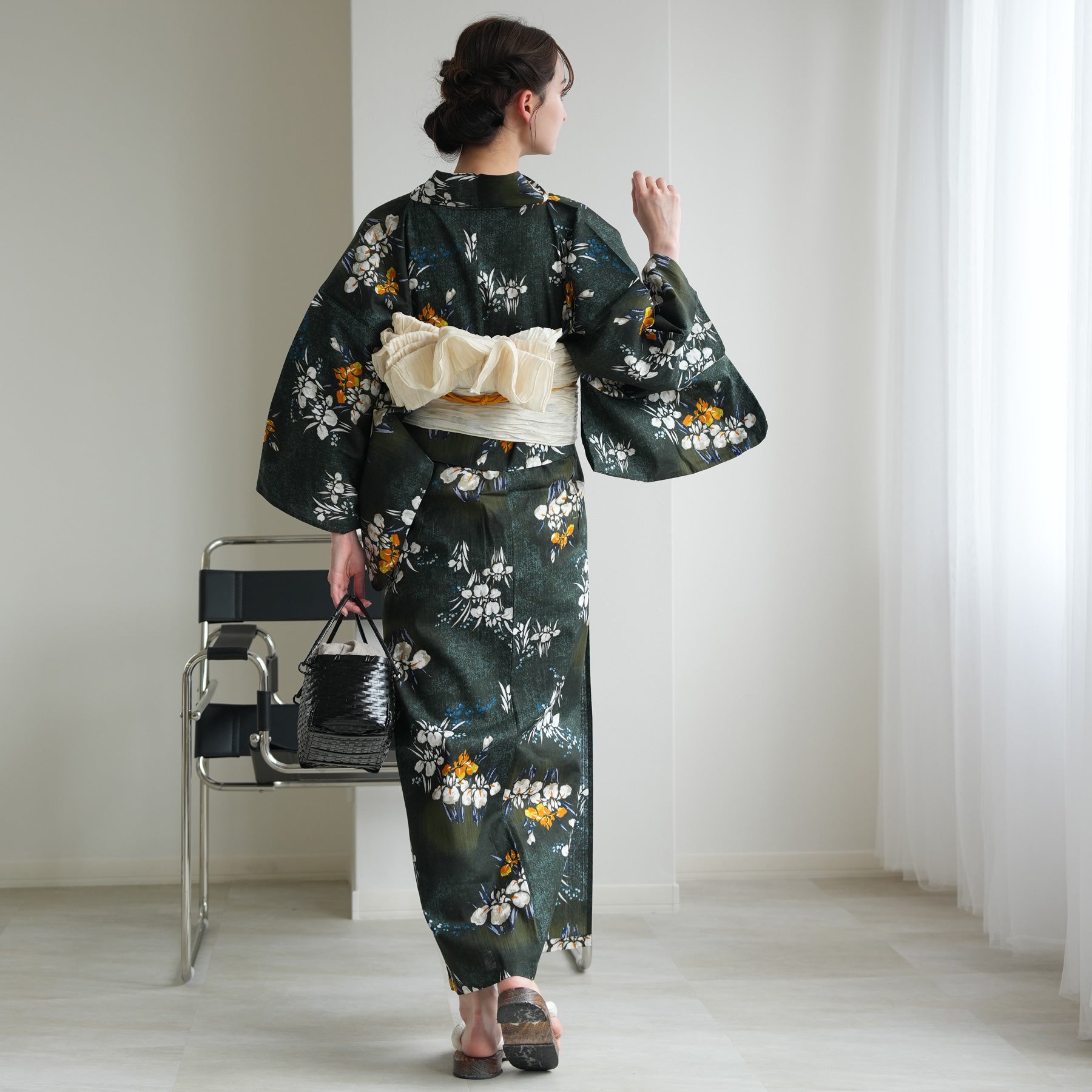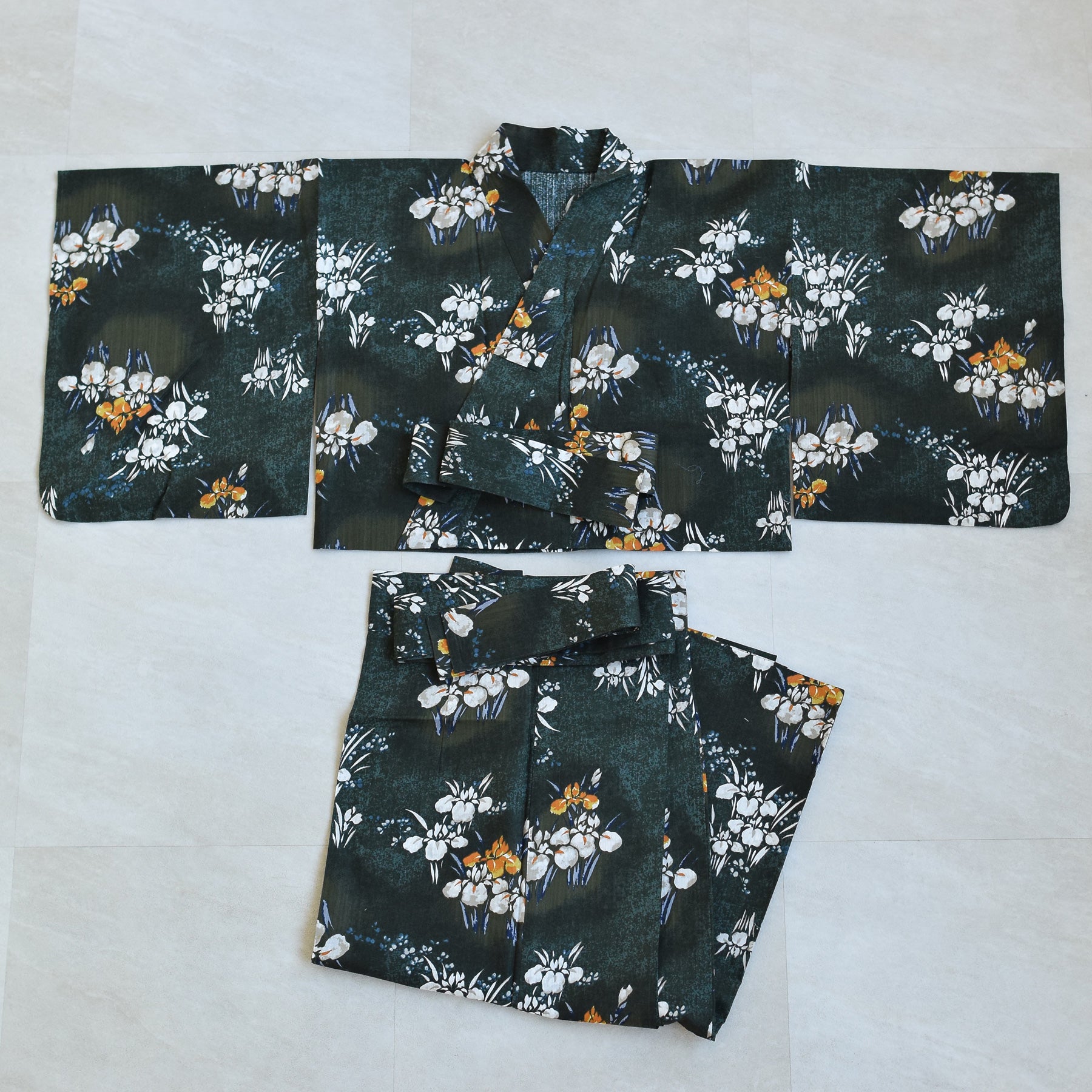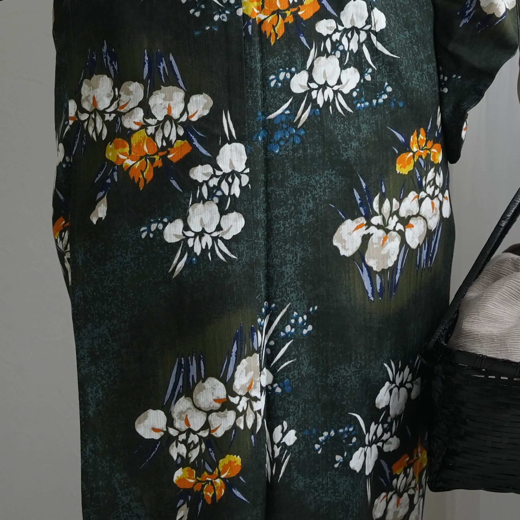 【セパレート高級変わり織 二部式浴衣3点セット ( ゆかた上下・帯・下駄 )錆緑に照る菖蒲】フリーサイズ 国産生地 国内染色 昭和初期アンティーク復刻版 (5016278611)
