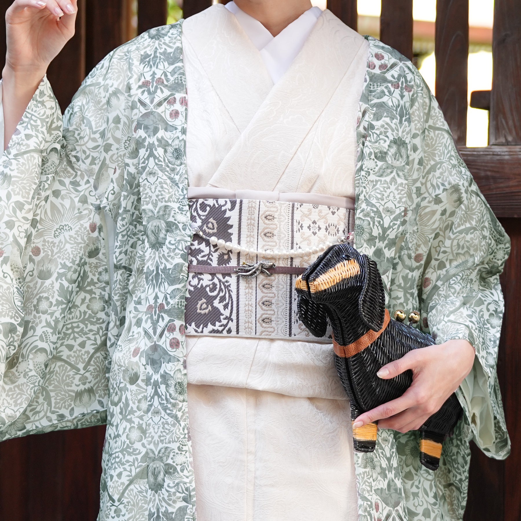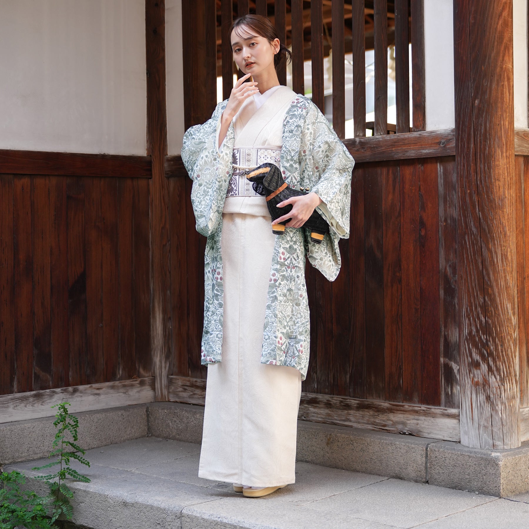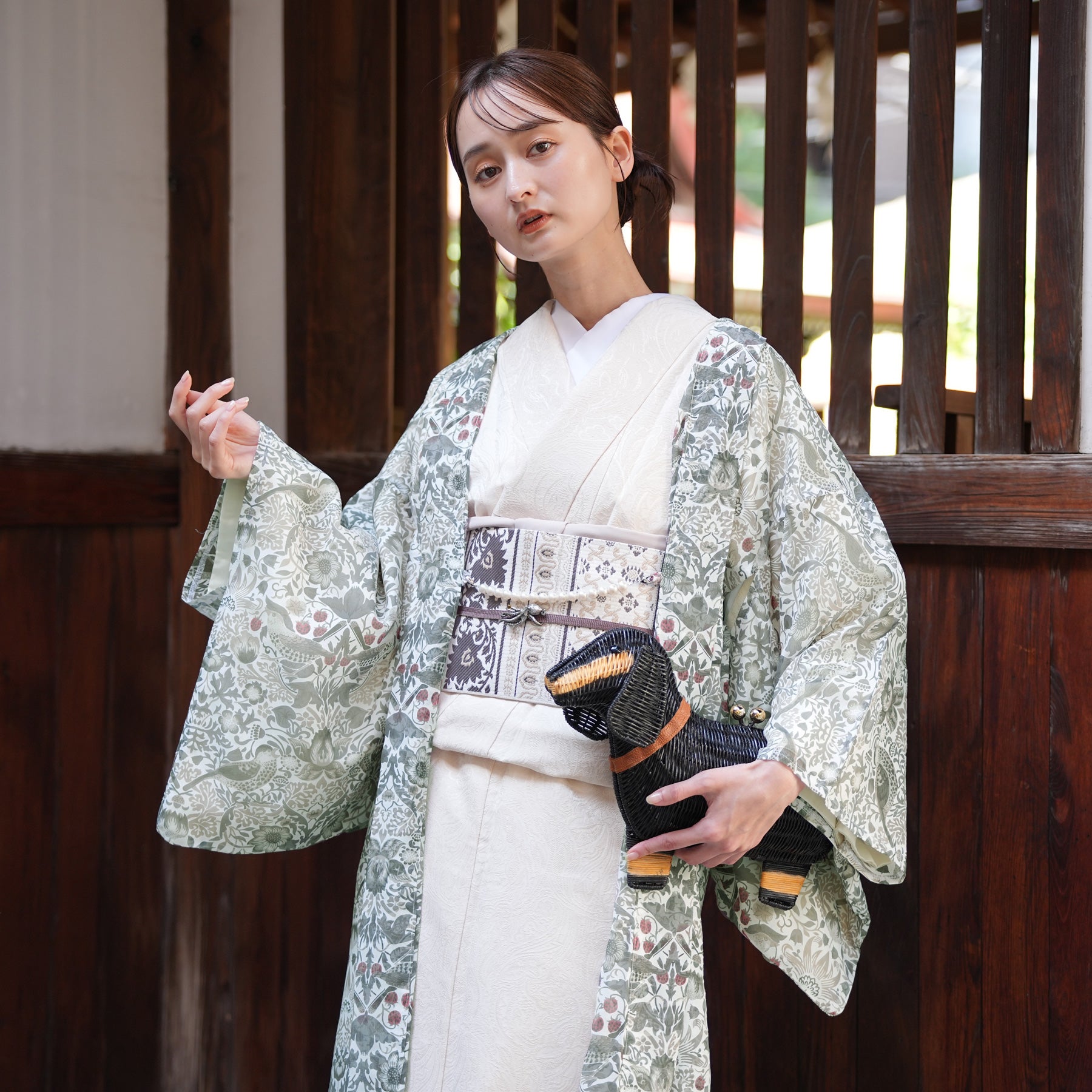 浴衣や小紋などの上にさらりと羽織るだけで、季節を感じる装いに。 日常にアートをまとうような一枚です。
