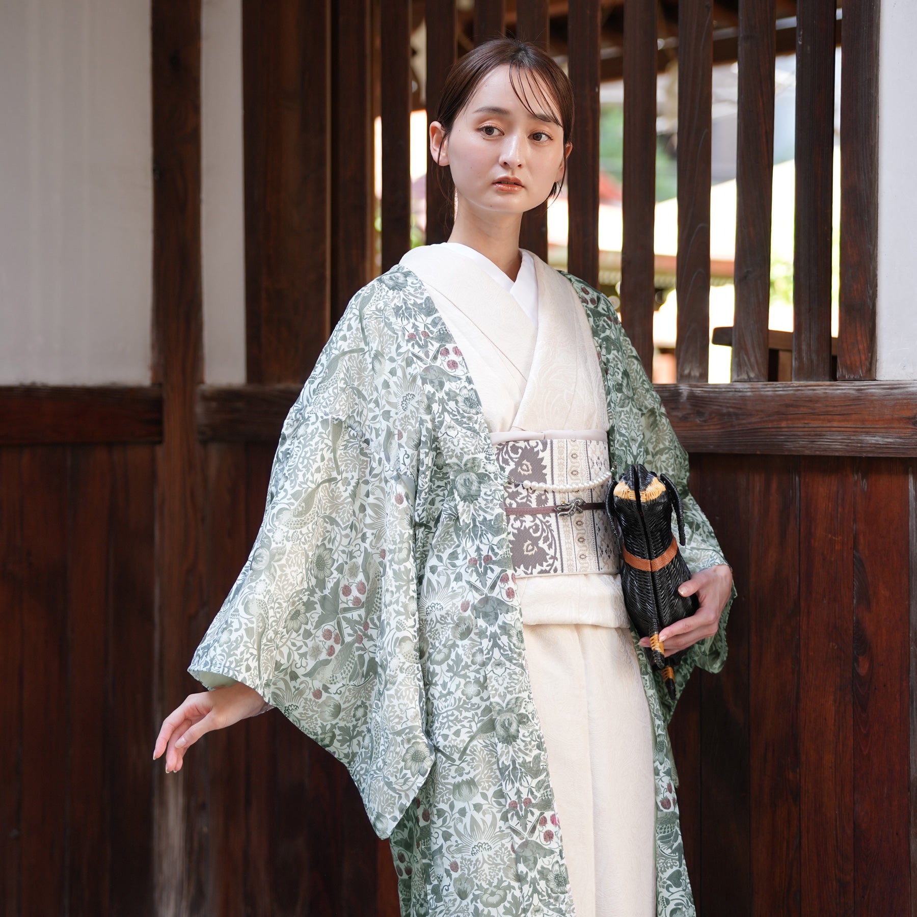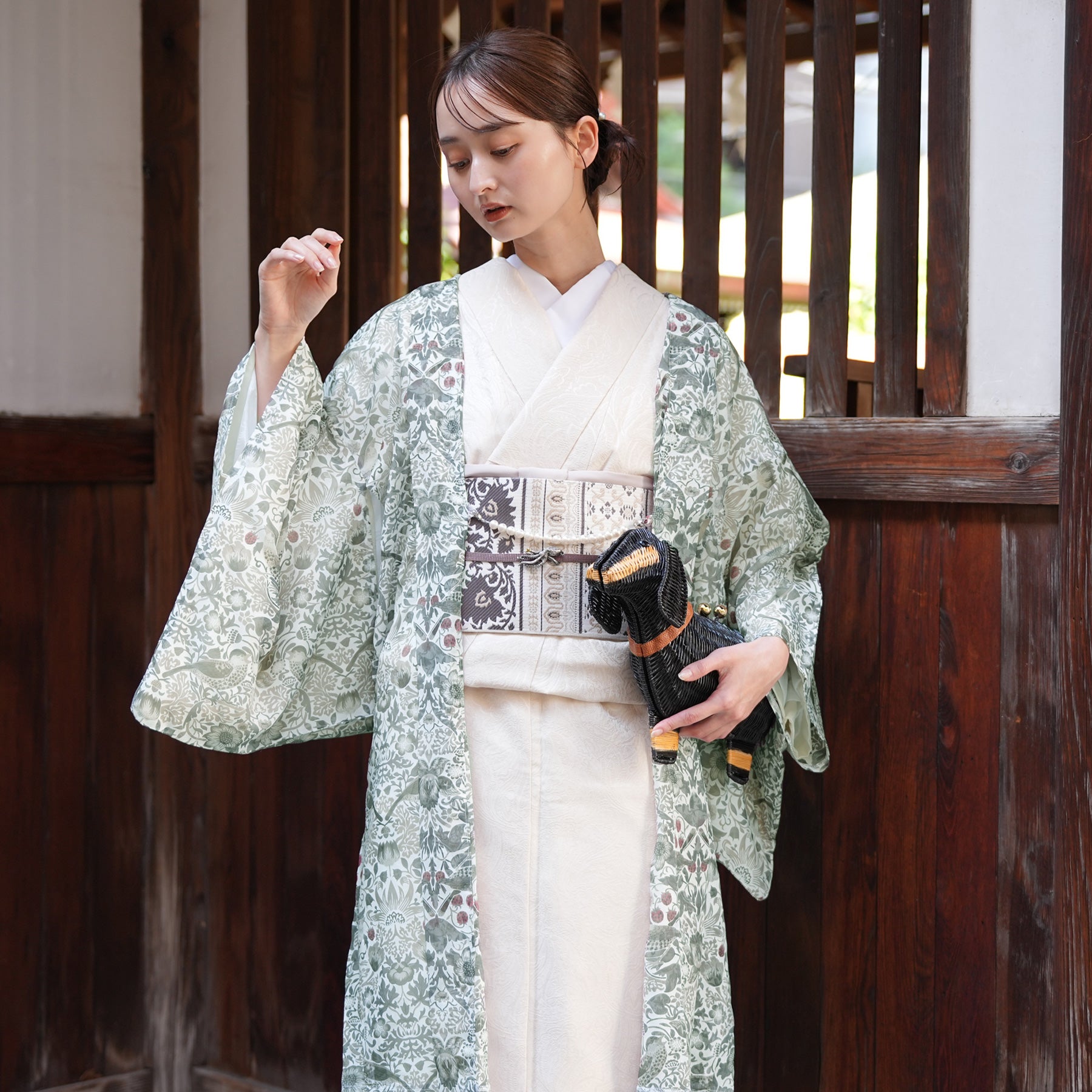 繊細な草花の流れと小鳥のモチーフが、和の装いにも調和する優雅な趣を添えます。