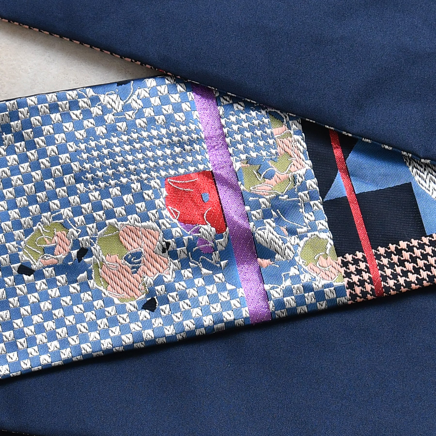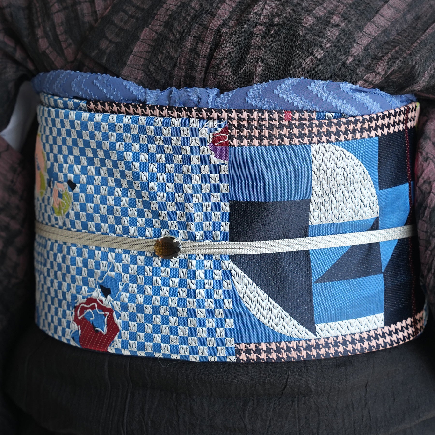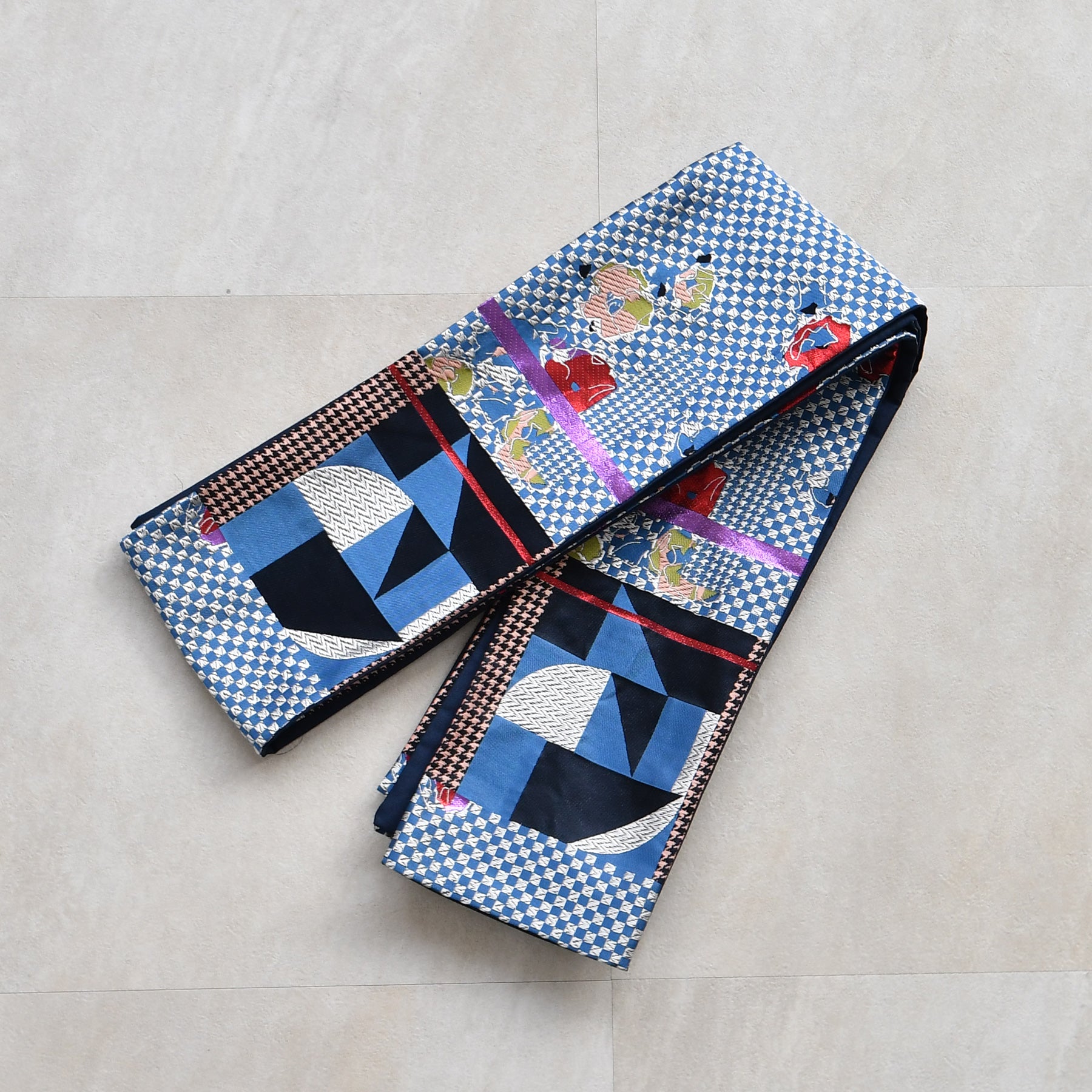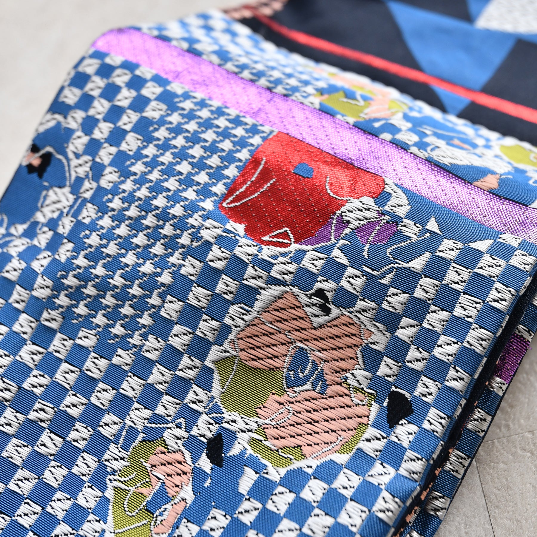 市松や千鳥格子風のモダンな幾何学模様に花柄が組み合わさった個性的なデザインです。