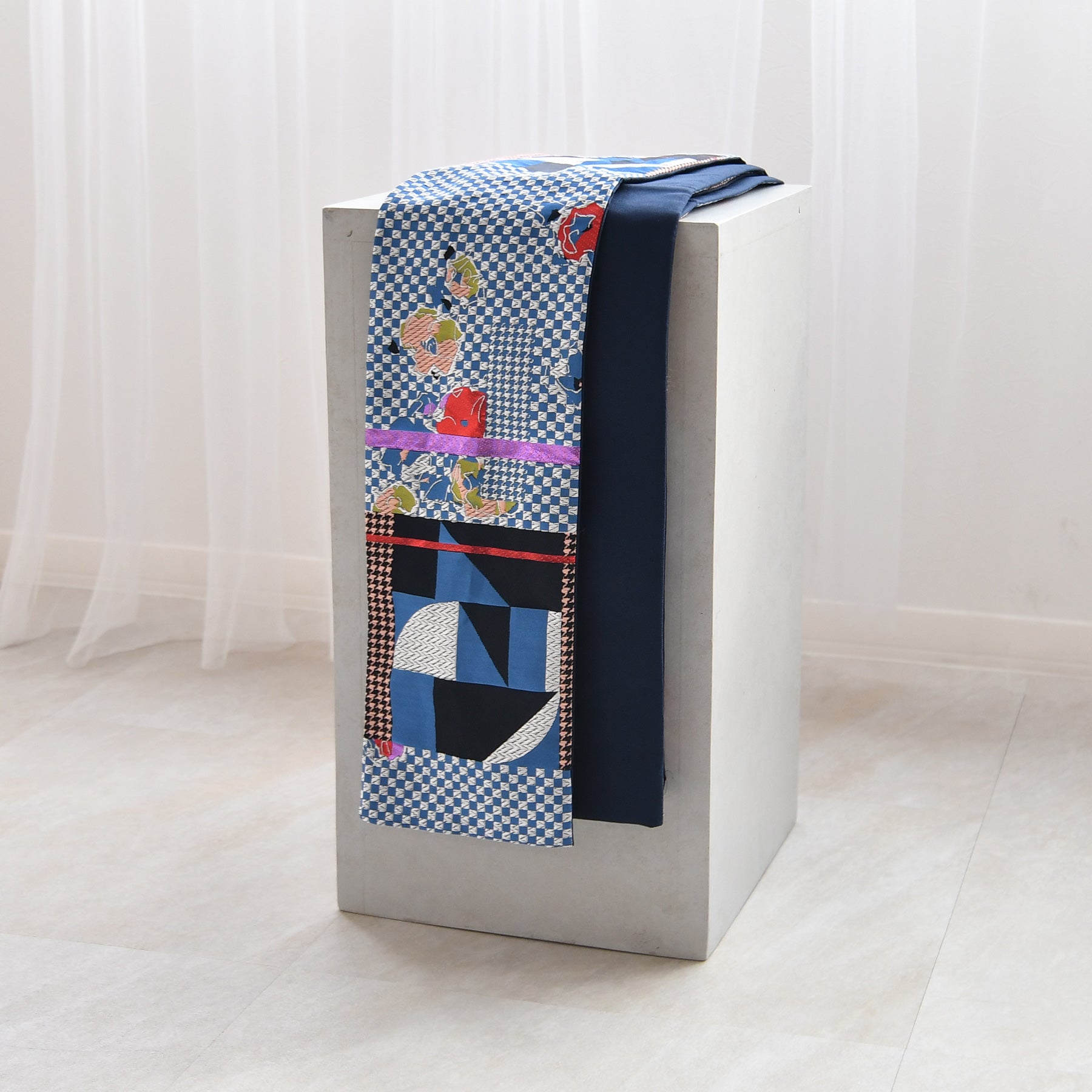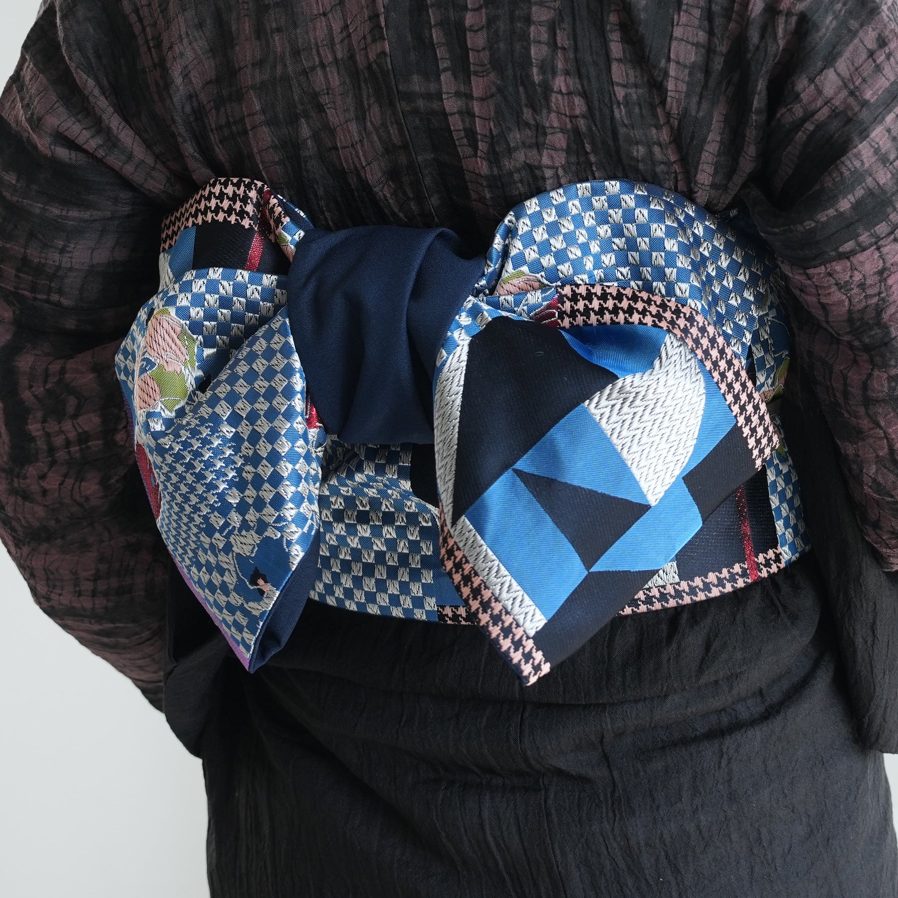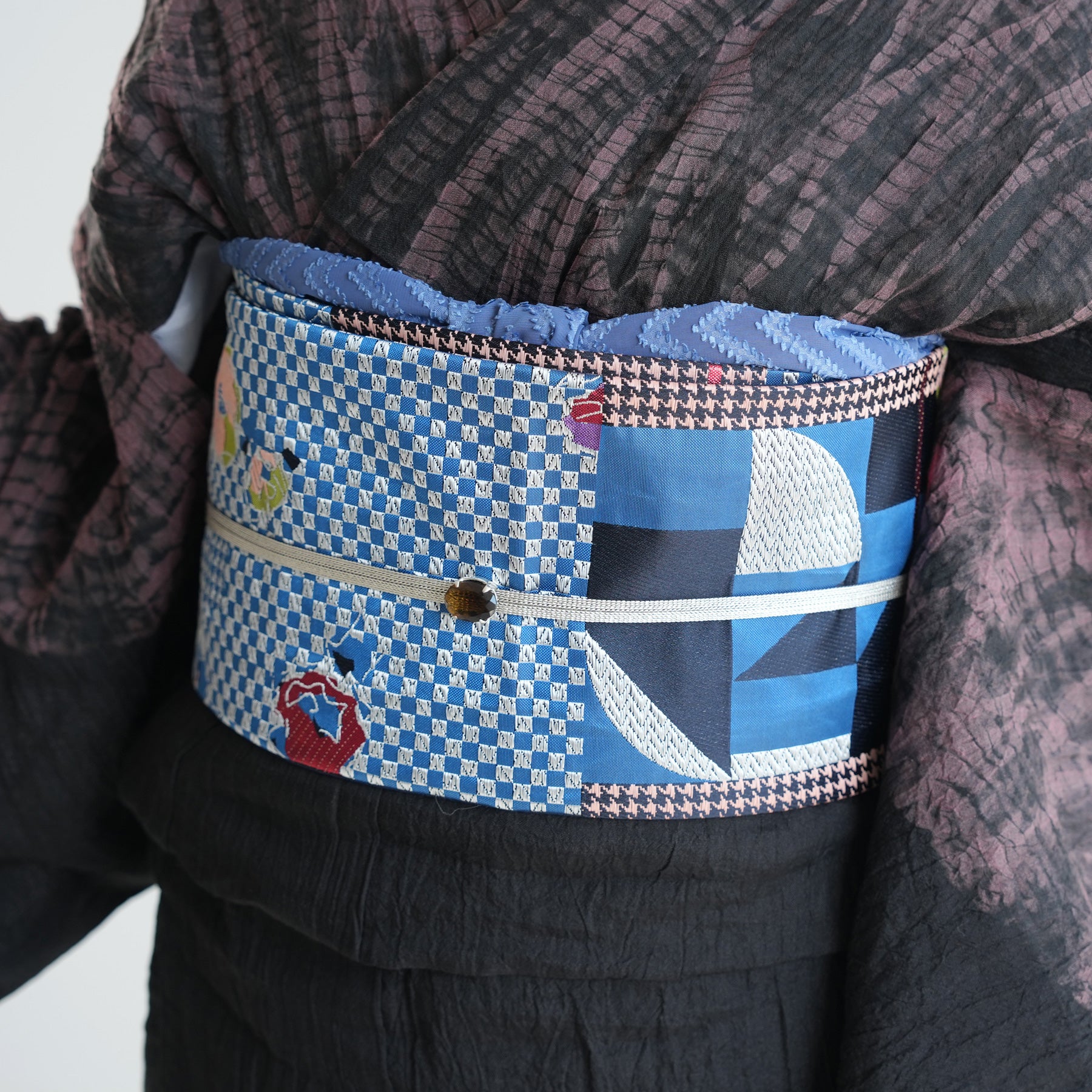 市松や千鳥格子風のモダンな幾何学模様に花柄が組み合わさった個性的なデザインです。