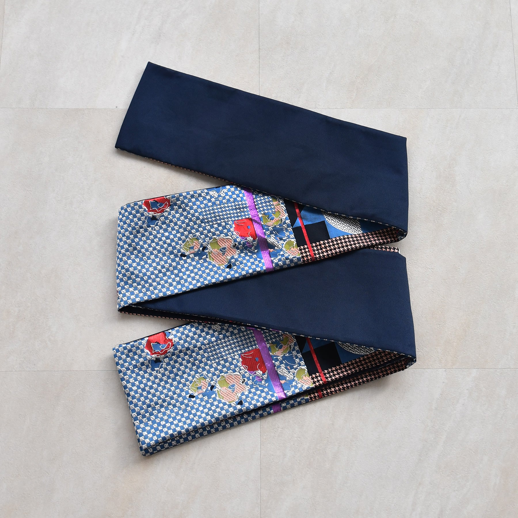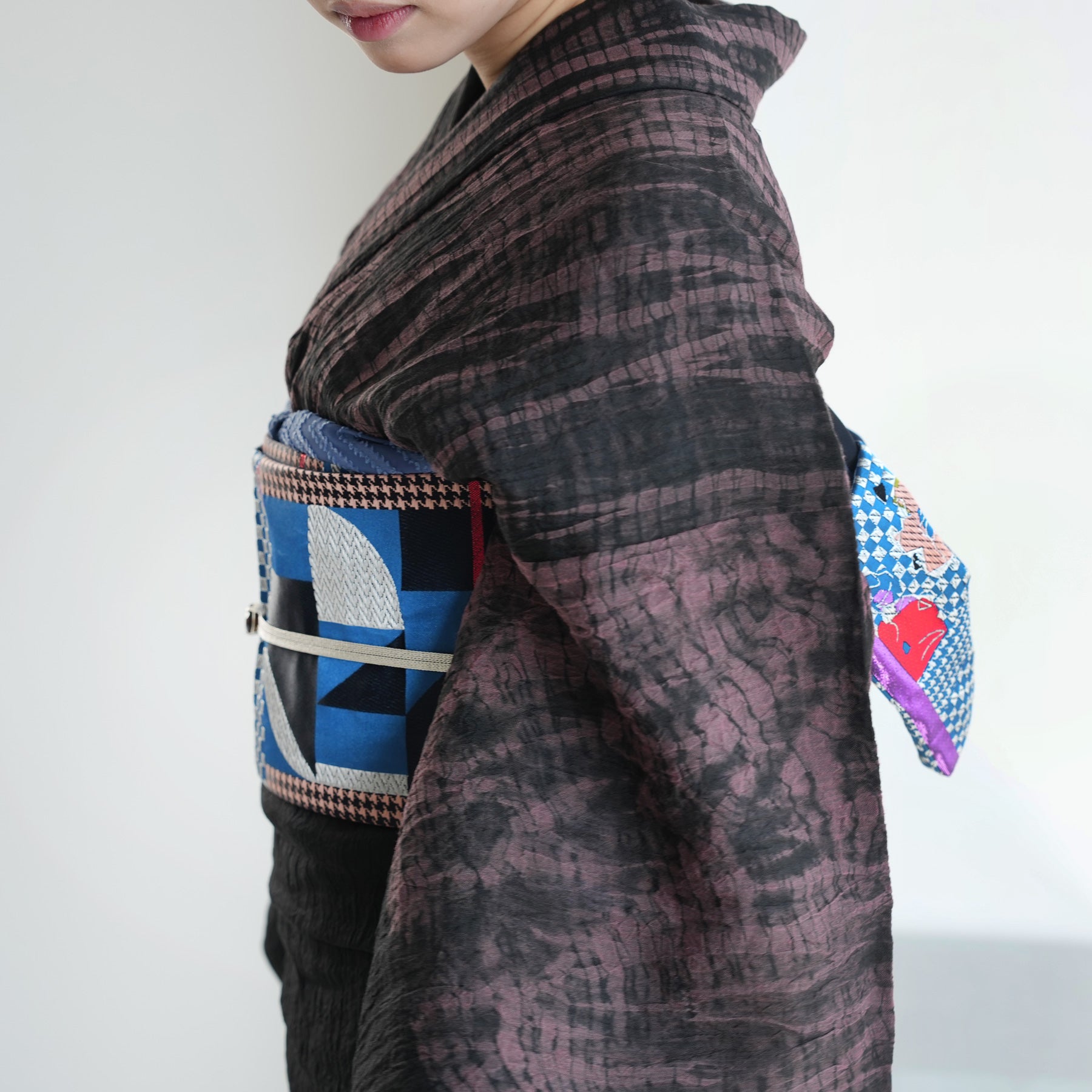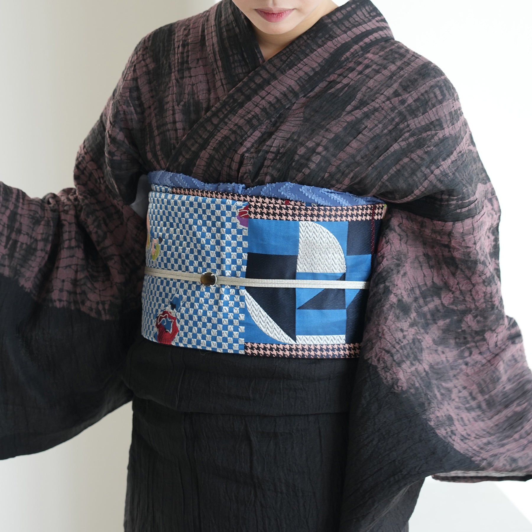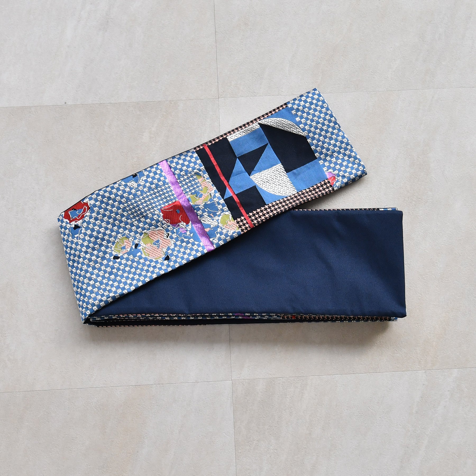 市松や千鳥格子風のモダンな幾何学模様に花柄が組み合わさった個性的なデザインです。