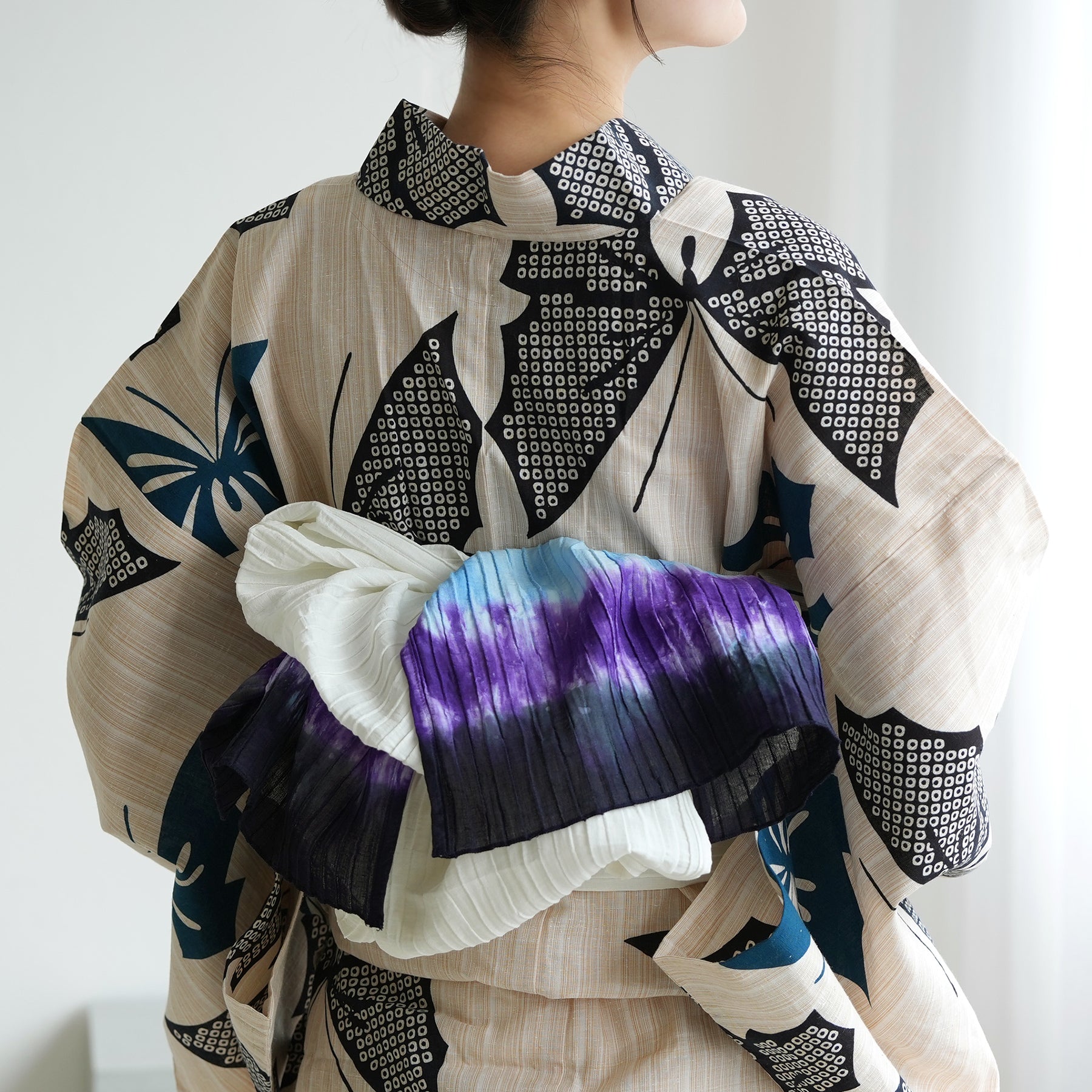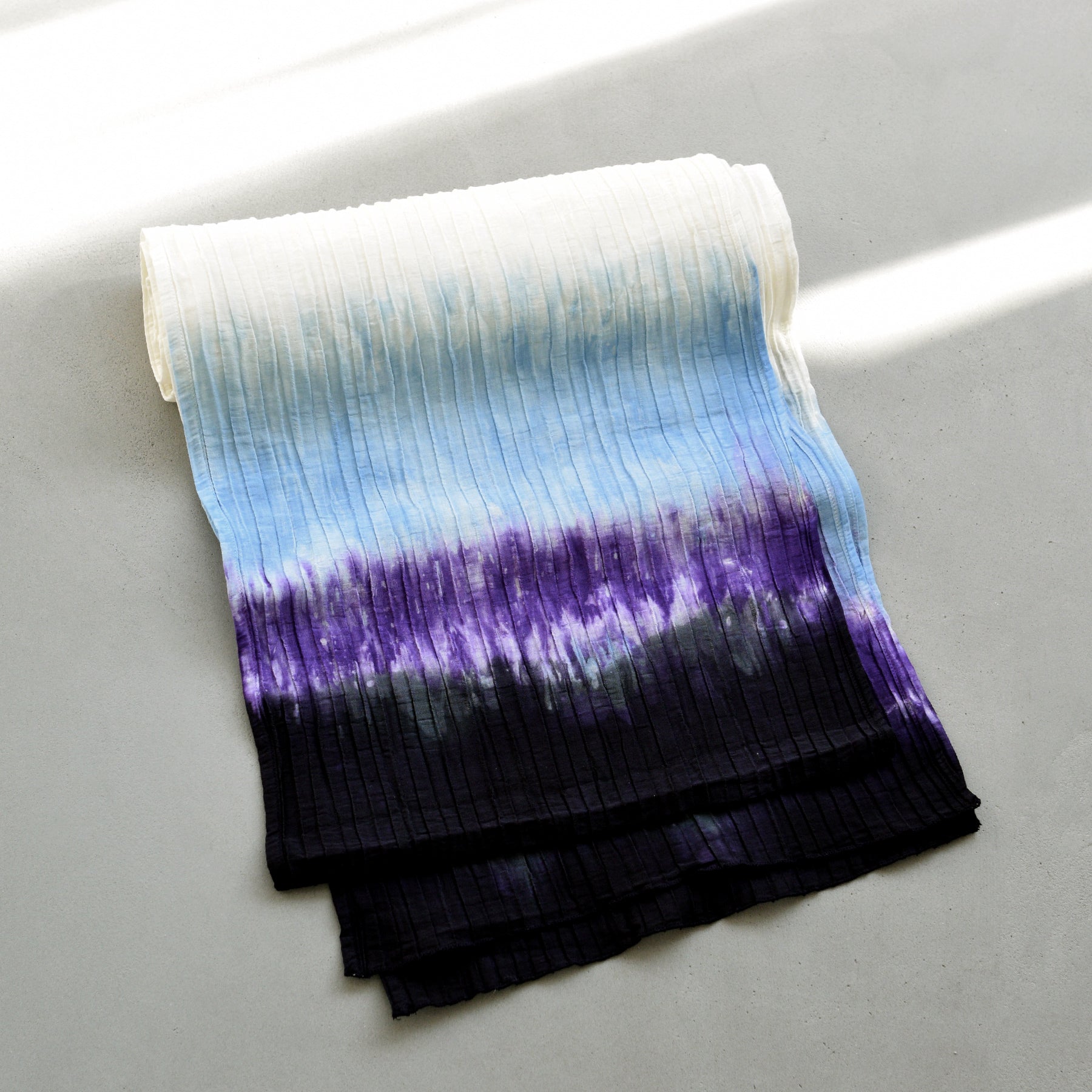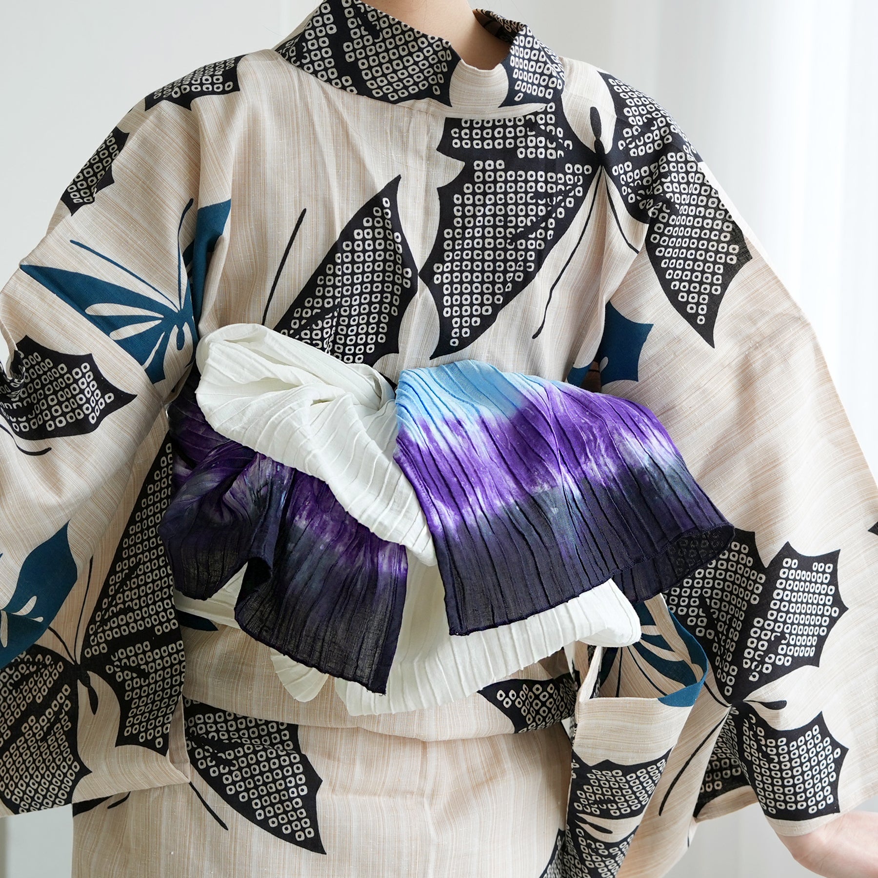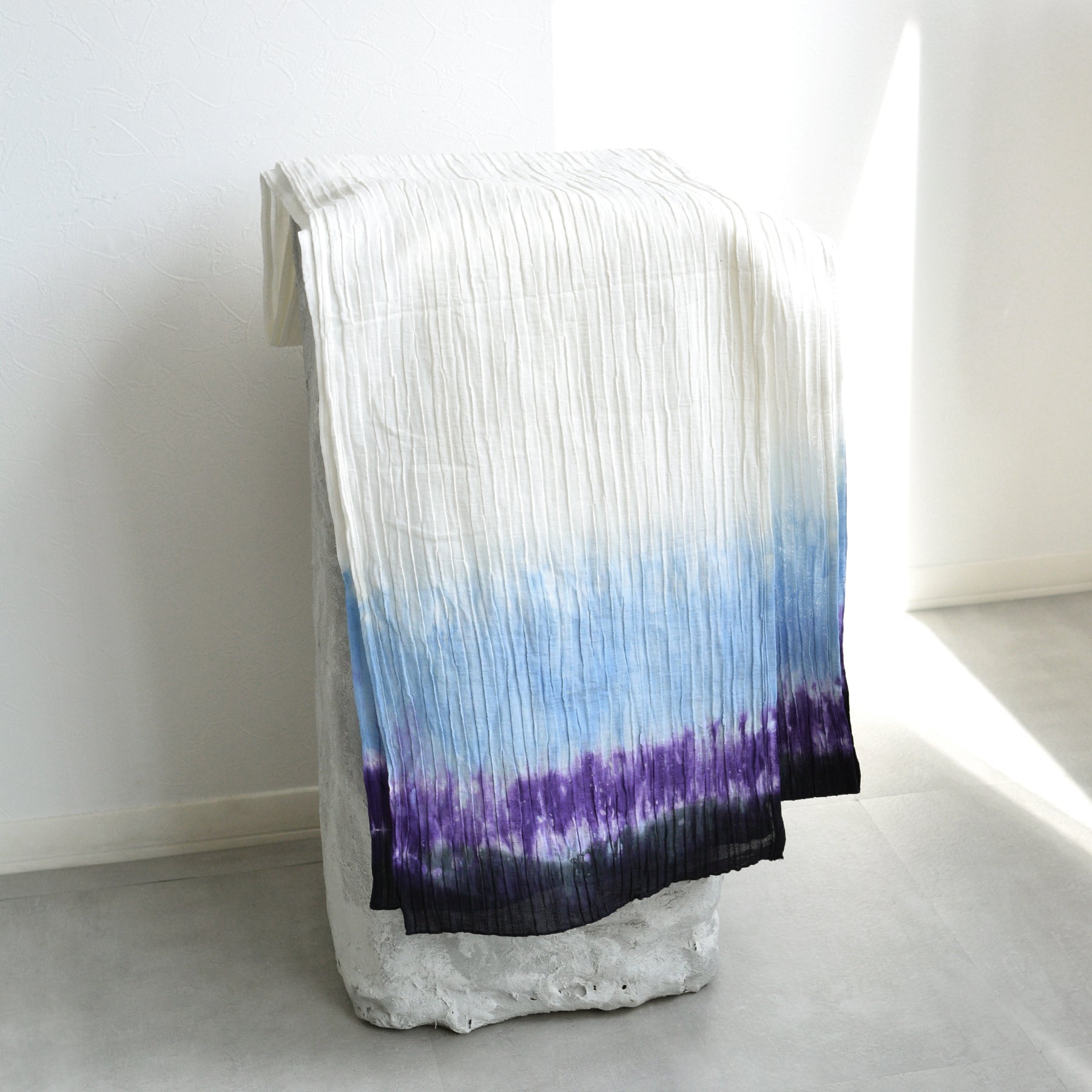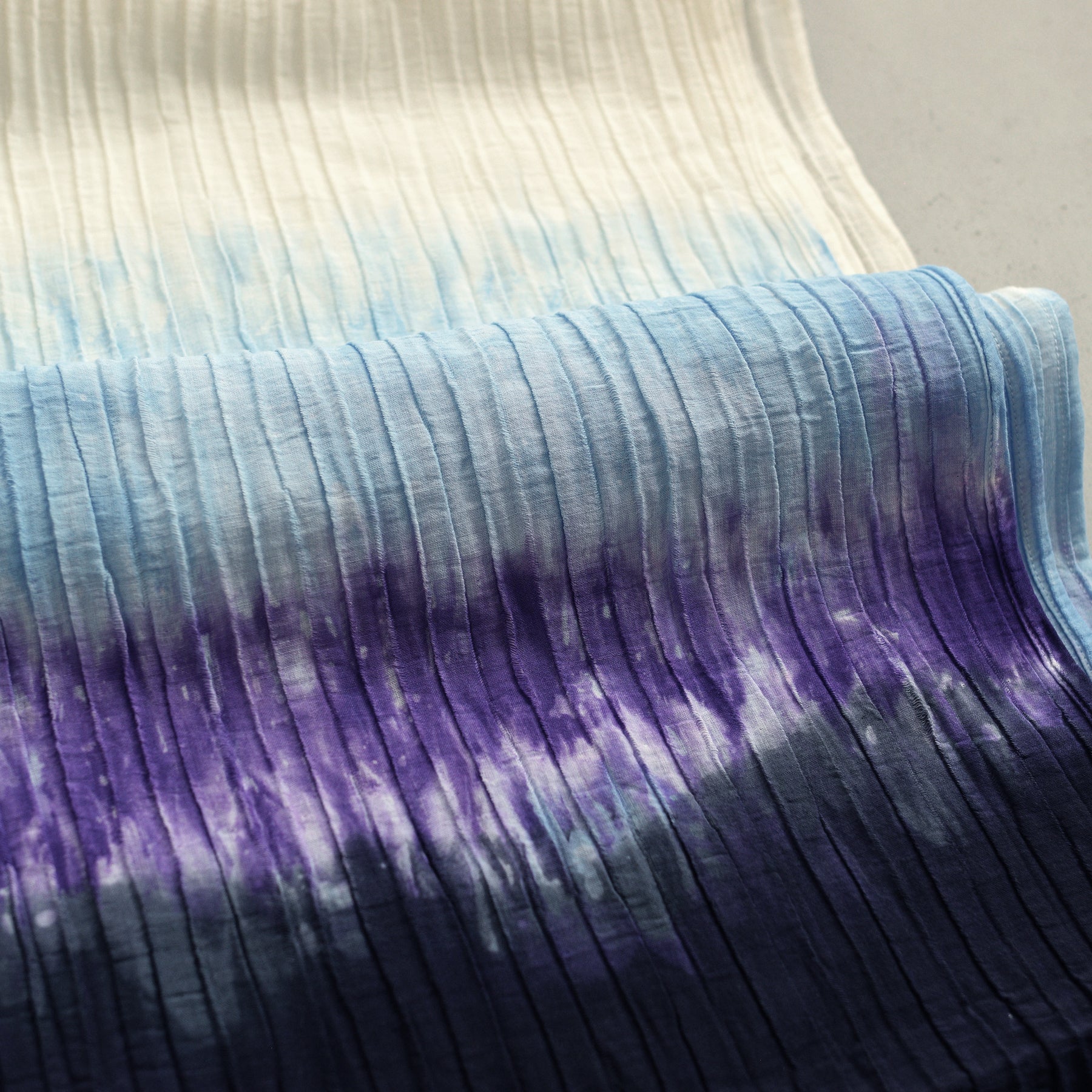 白から澄んだ青、そして深い紫へと変化する、まるで夜明け前の空のようなグラデーション。ラミーコットンのシャリ感と相まって、見た目にも涼やかで清涼感あふれる着姿を演出します