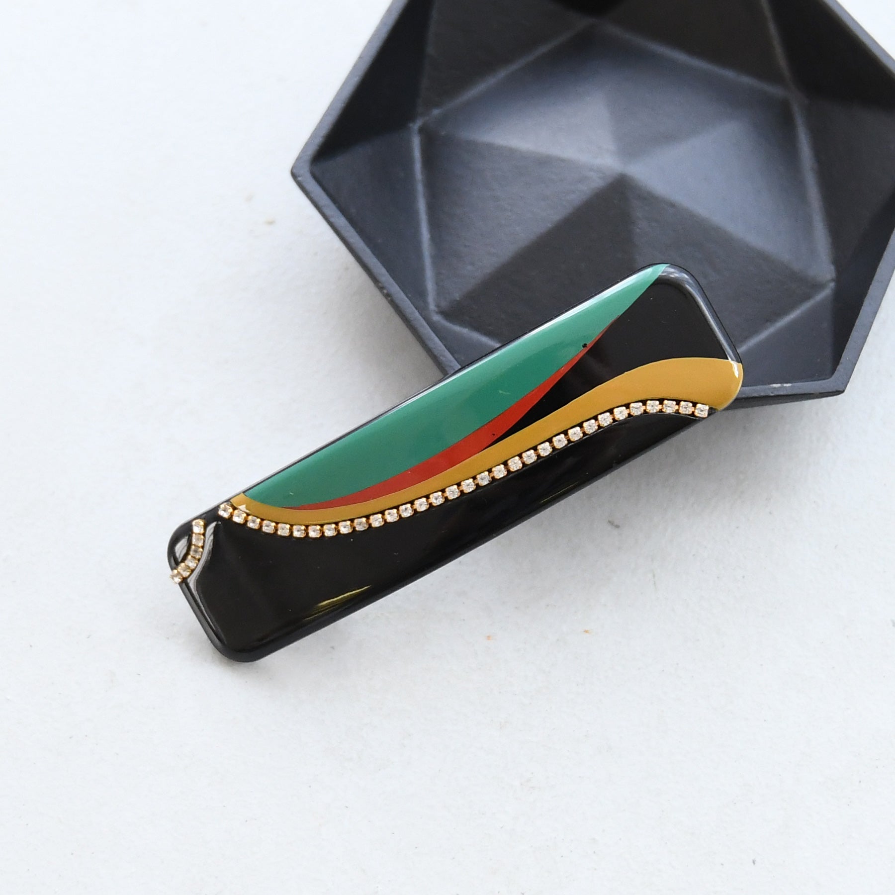 深みのある黒地に、ストーンがきらめく上品なデザイン。