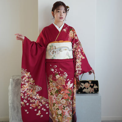【レンタル】振袖 着物セット 正絹着物+正絹袋帯 成人式 晴れ着 記念撮影 往復送料無料 赤い古典柄(1000613200)※2026年成人式先約あり