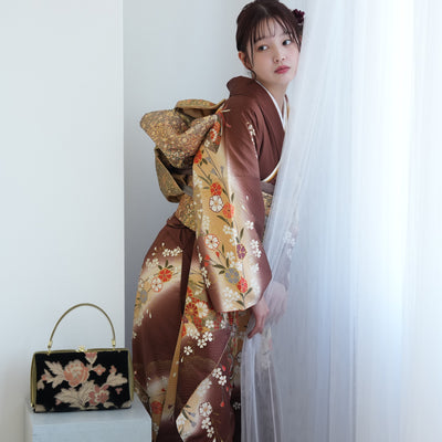 【レンタル】振袖 着物セット アンティーク正絹着物+正絹袋帯 成人式 晴れ着 記念撮影 往復送料無料 絵羽 ブラウンぼかしの古典柄(1000617000)