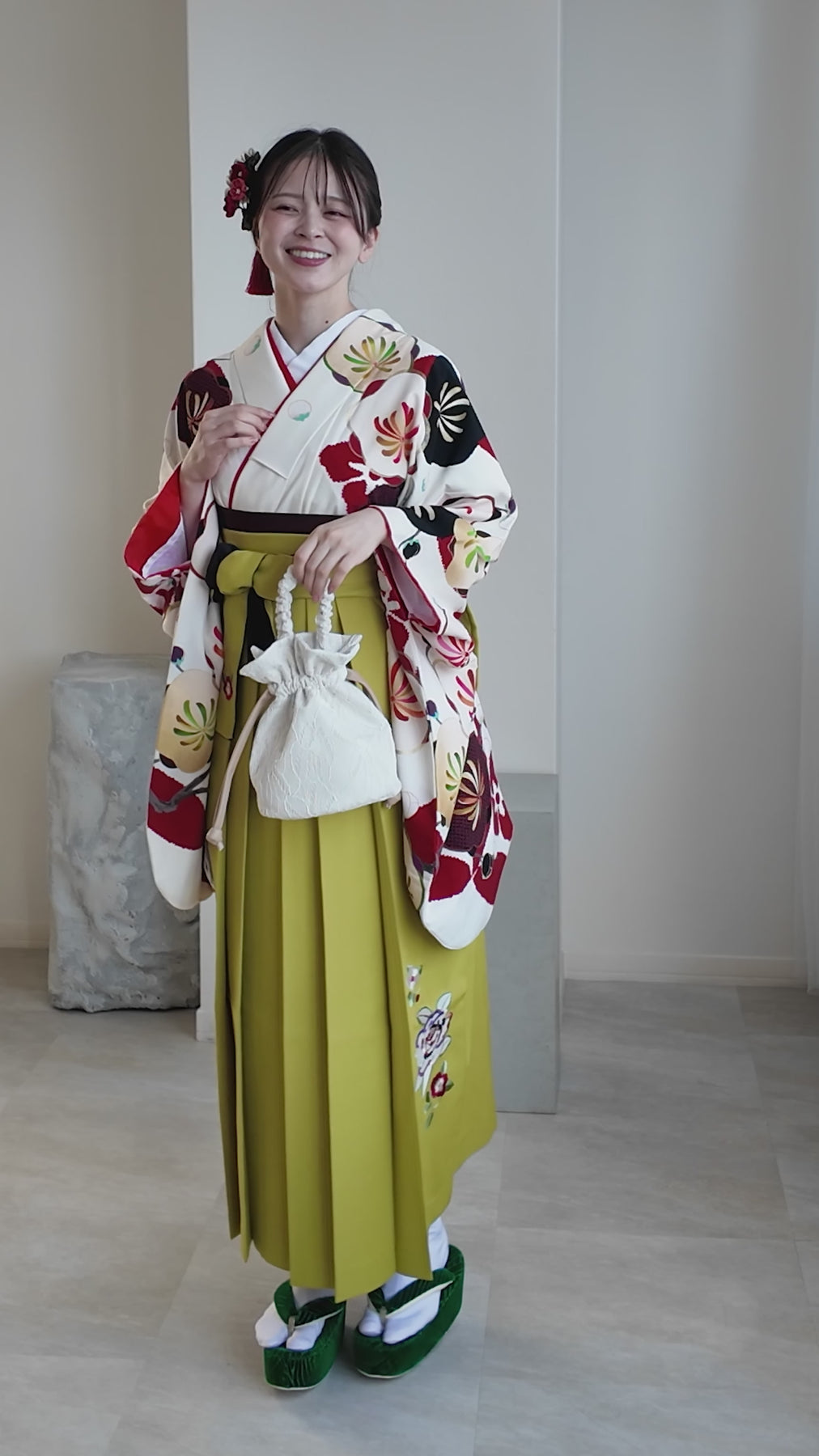 着物・袴・草履・バッグ・重ね襟(着物に縫い付済)・半巾帯・肌襦袢+長襦袢一体化インナー(白無地半襟付き)・前板・着付けベルト・ウエストベルト・腰ひも3本セット・伊達締め ・マジックベルト・衿芯・足袋(プレゼント)