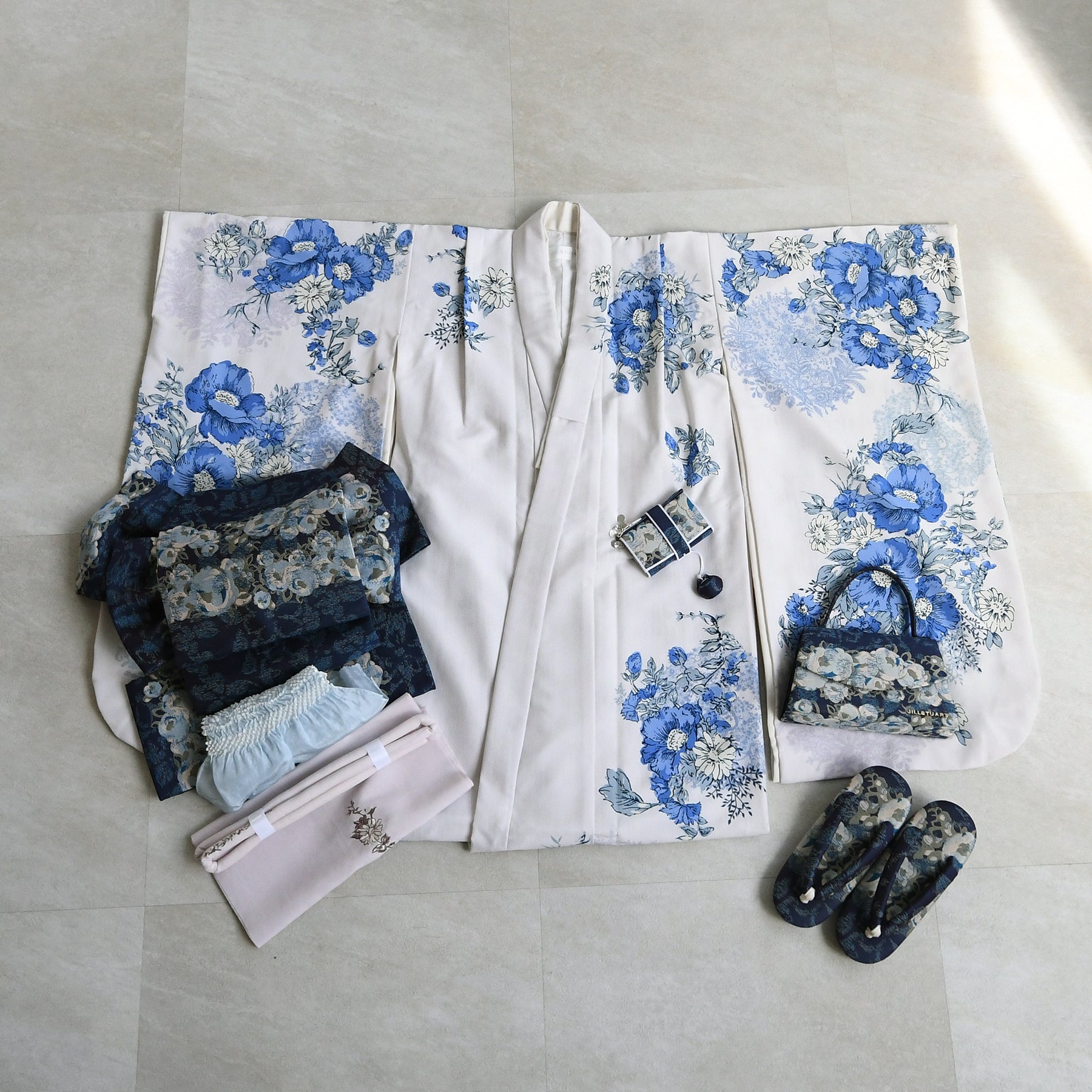 半衿付き長襦袢・髪飾り2点(髪飾りはお選びいただけません)・びら簪・腰ひも3本・伊達締め・前板・コーリンベルト・マジックベルト・ウエストベルト・足袋(新品プレゼント)