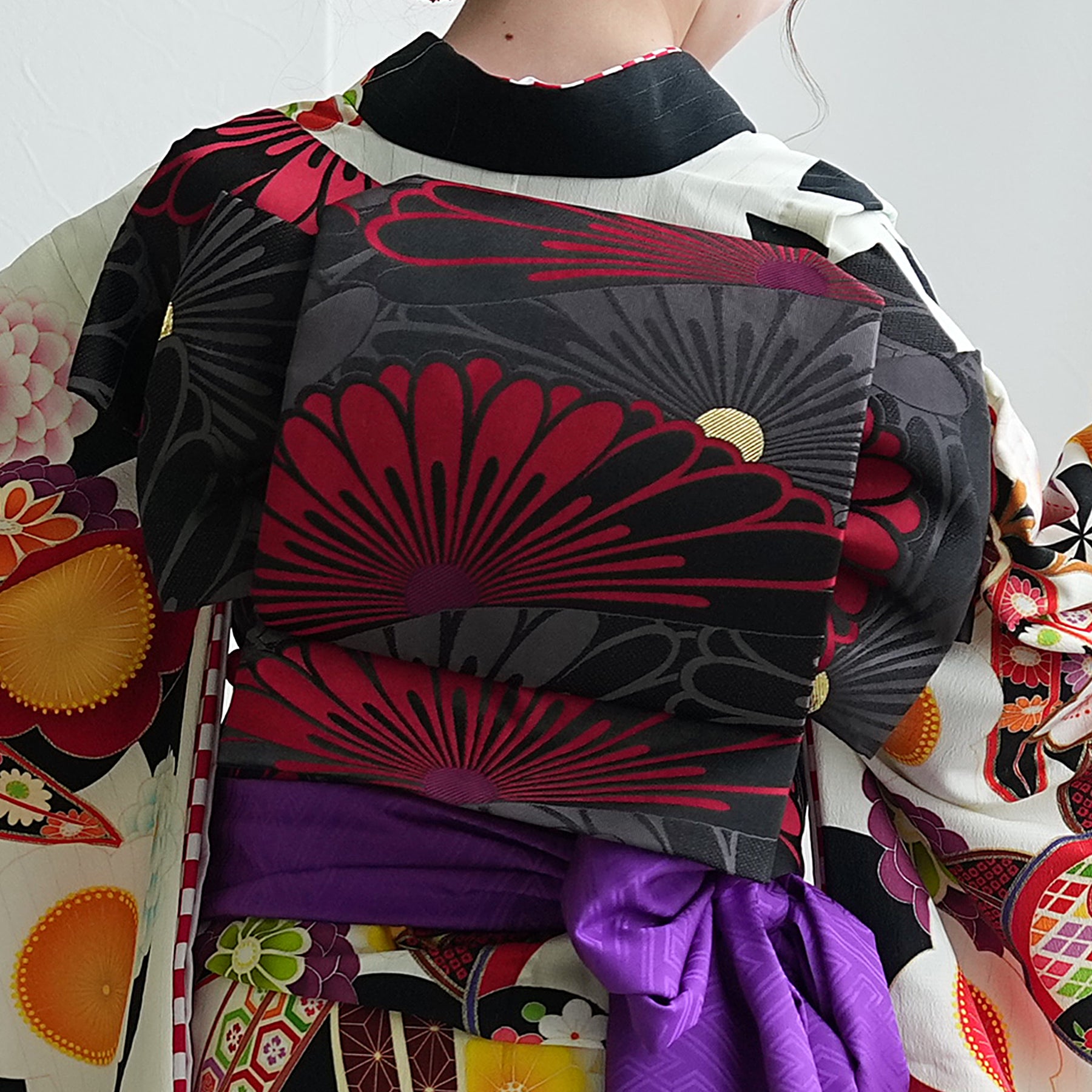 【セット内容】 着物・作り帯・半衿付き長襦袢・帯揚げ・帯締め・帯留め・志古貴・ハコセコ・扇子・帯留め・草履・バッグ・髪飾り