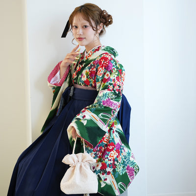【レンタル】紅一点 2尺袖 袴 17点セット 91-99cm 日本製 レトロモダン系 椿 緑系(1020655401)