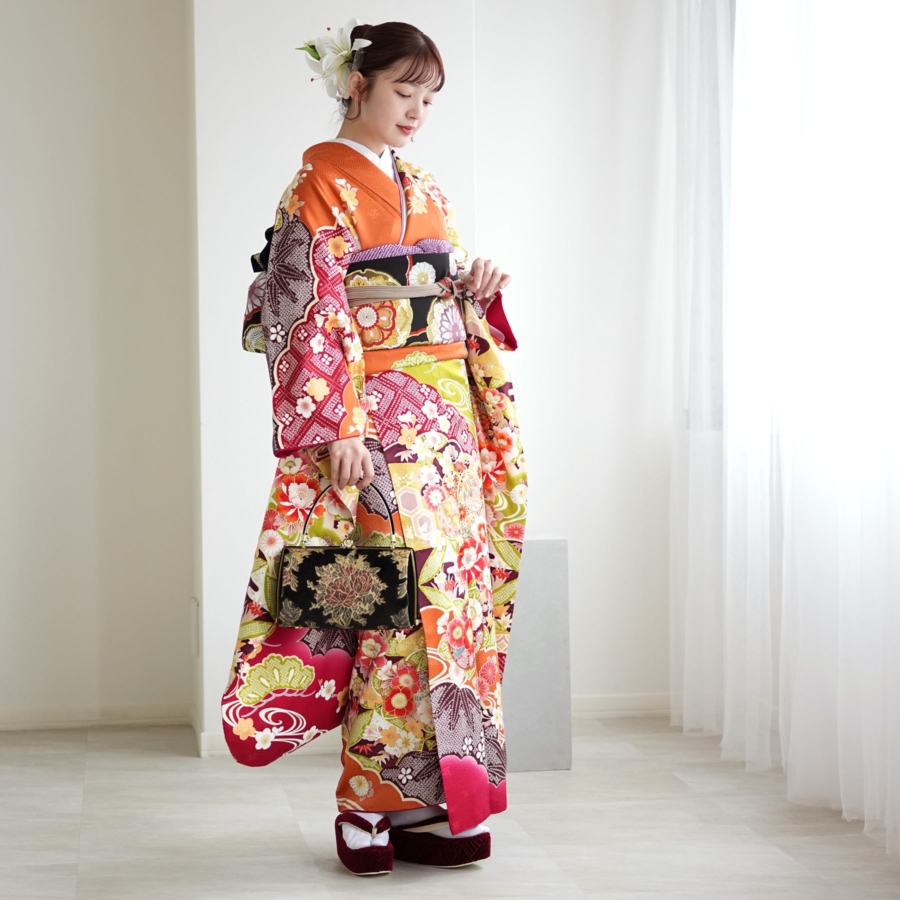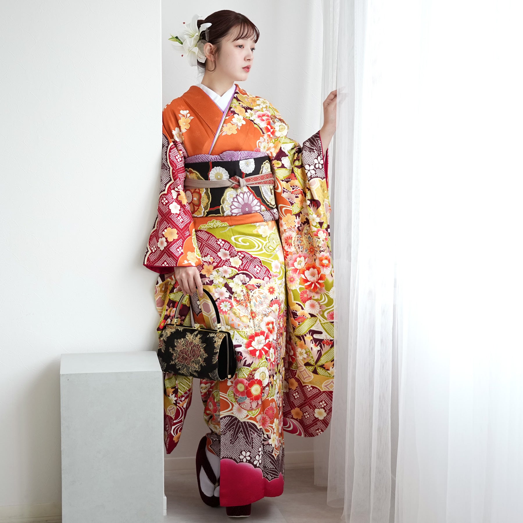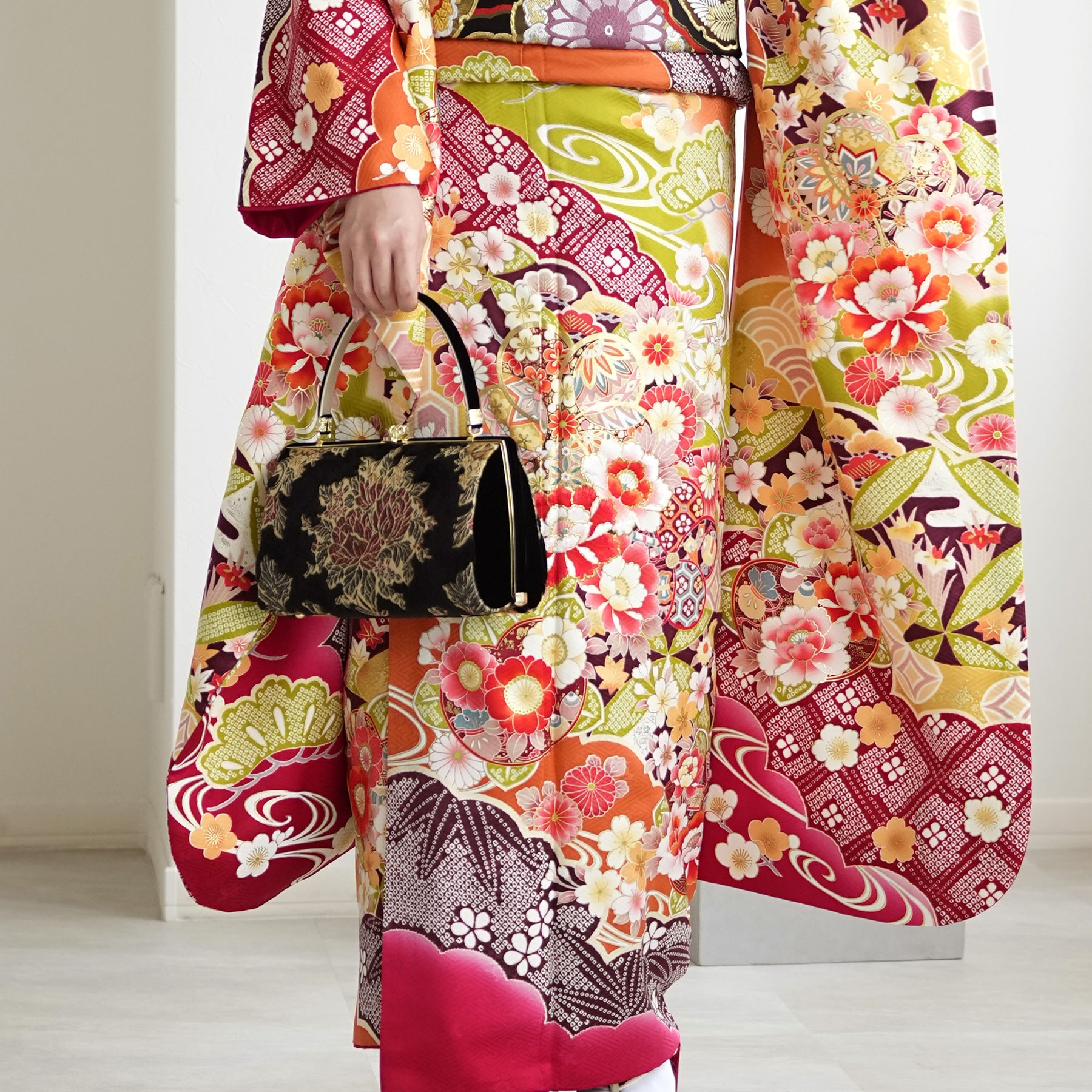 振袖・袋帯・草履・バッグ・長襦袢・帯〆・帯揚げ・重ね衿・肌襦袢・前板・着付けベルト・ウエストベルト・三重仮紐・腰ひも3本セット・帯まくら・伊達締め ・マジックベルト・衿芯・足袋(プレゼント)