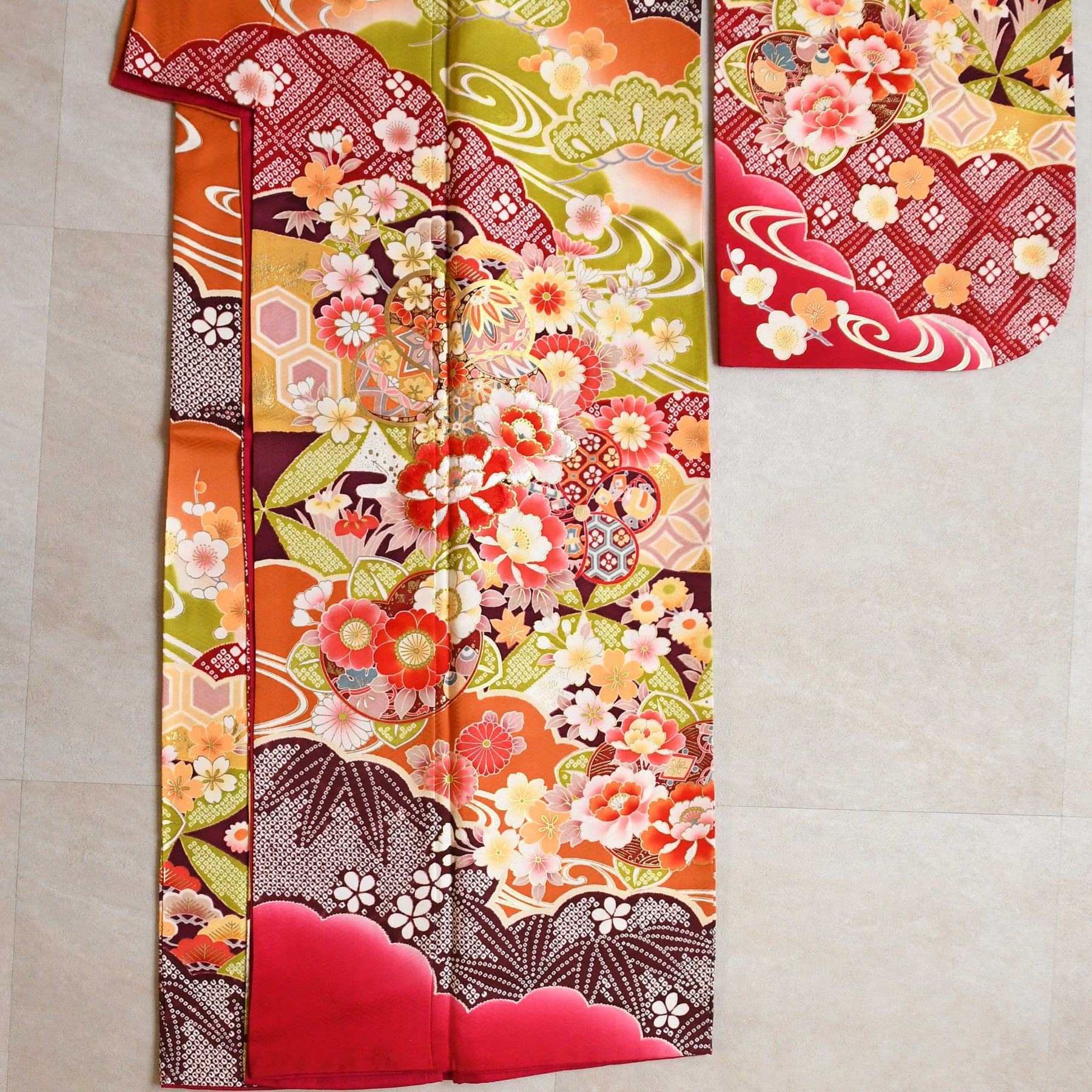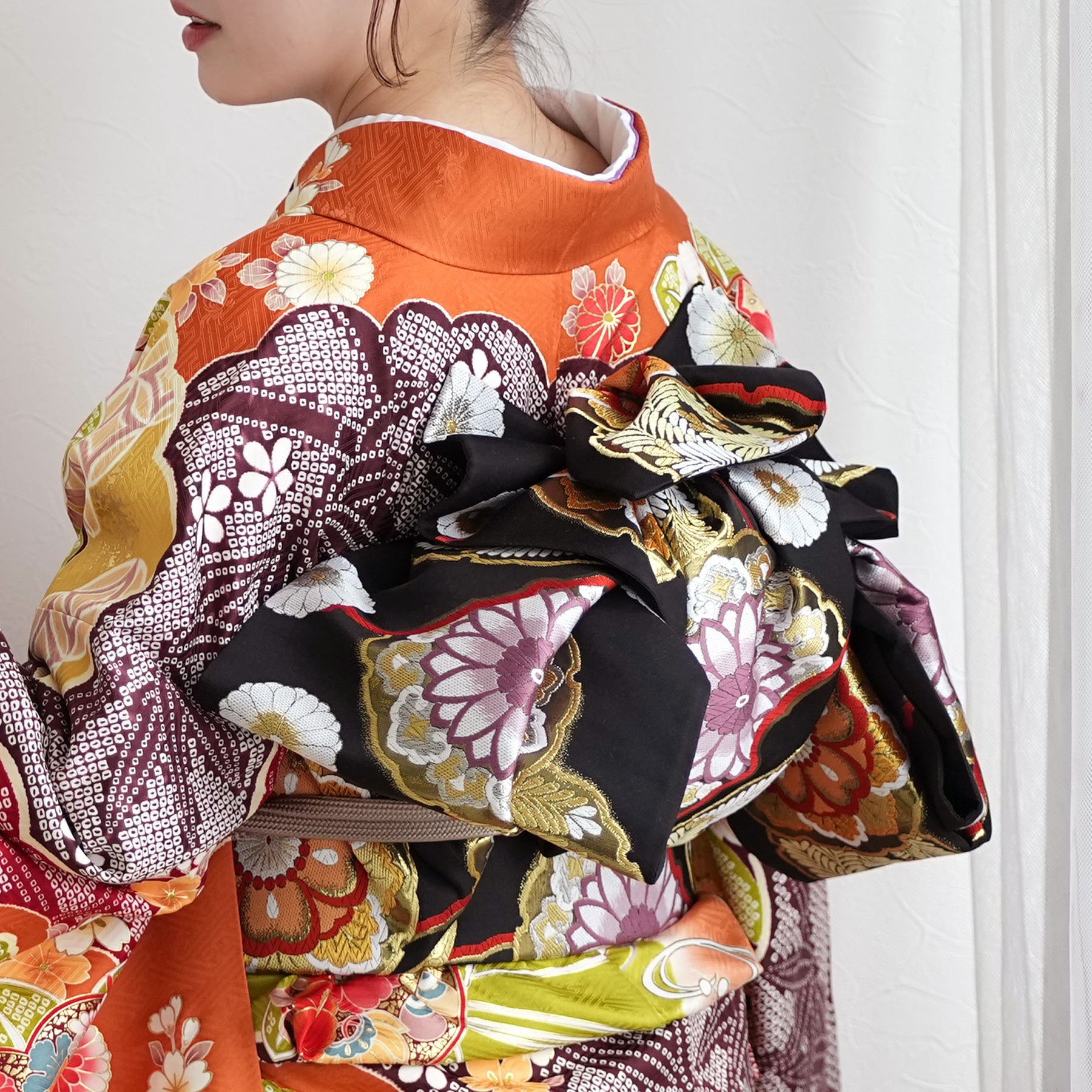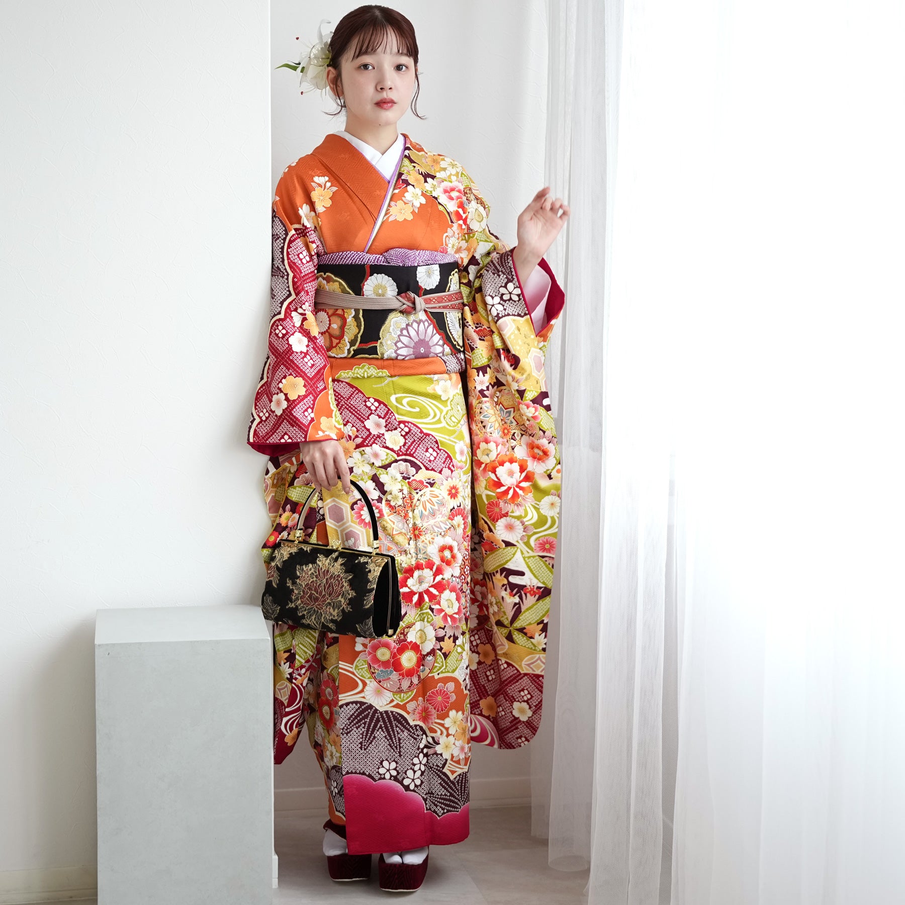 振袖・袋帯・草履・バッグ・長襦袢・帯〆・帯揚げ・重ね衿・肌襦袢・前板・着付けベルト・ウエストベルト・三重仮紐・腰ひも3本セット・帯まくら・伊達締め ・マジックベルト・衿芯・足袋(プレゼント)