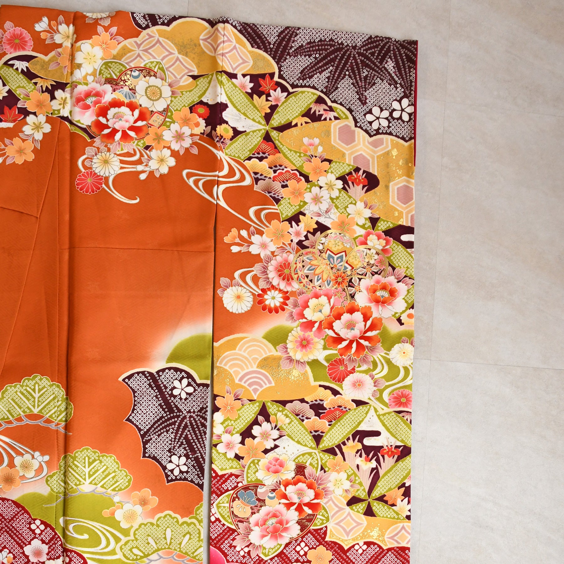 【レンタル】振袖 着物セット 正絹着物+正絹袋帯 成人式 晴れ着 記念撮影 往復送料無料 絵羽 オレンジに豪華花花(1000604900)