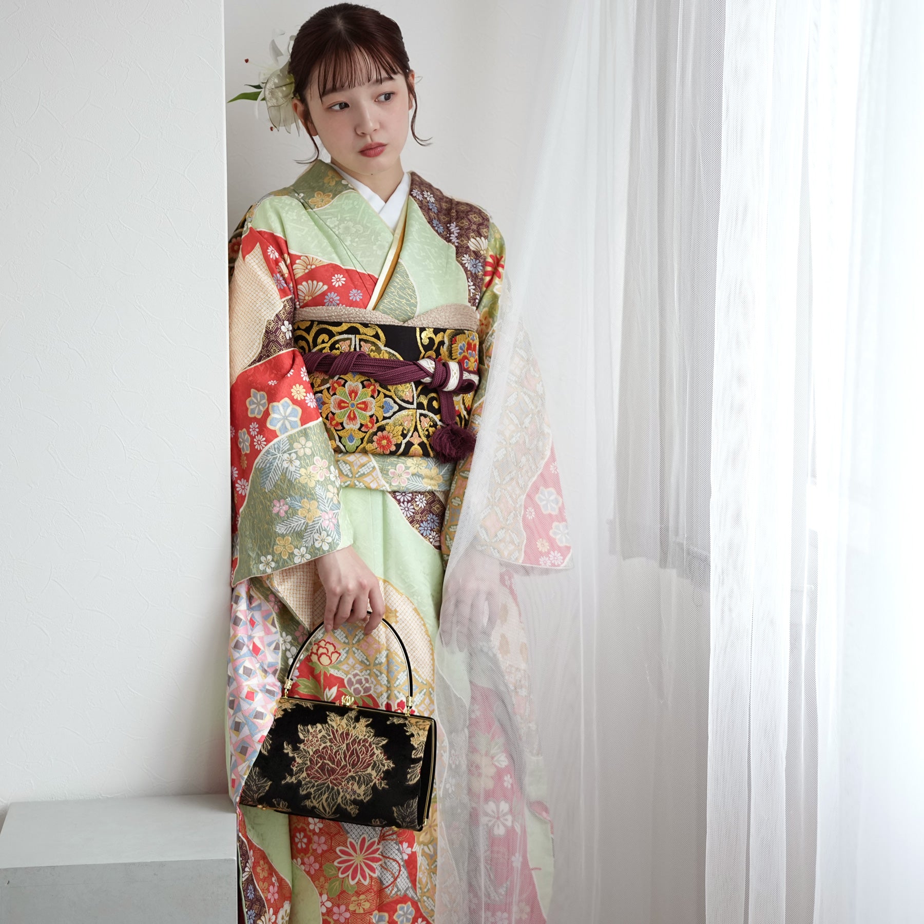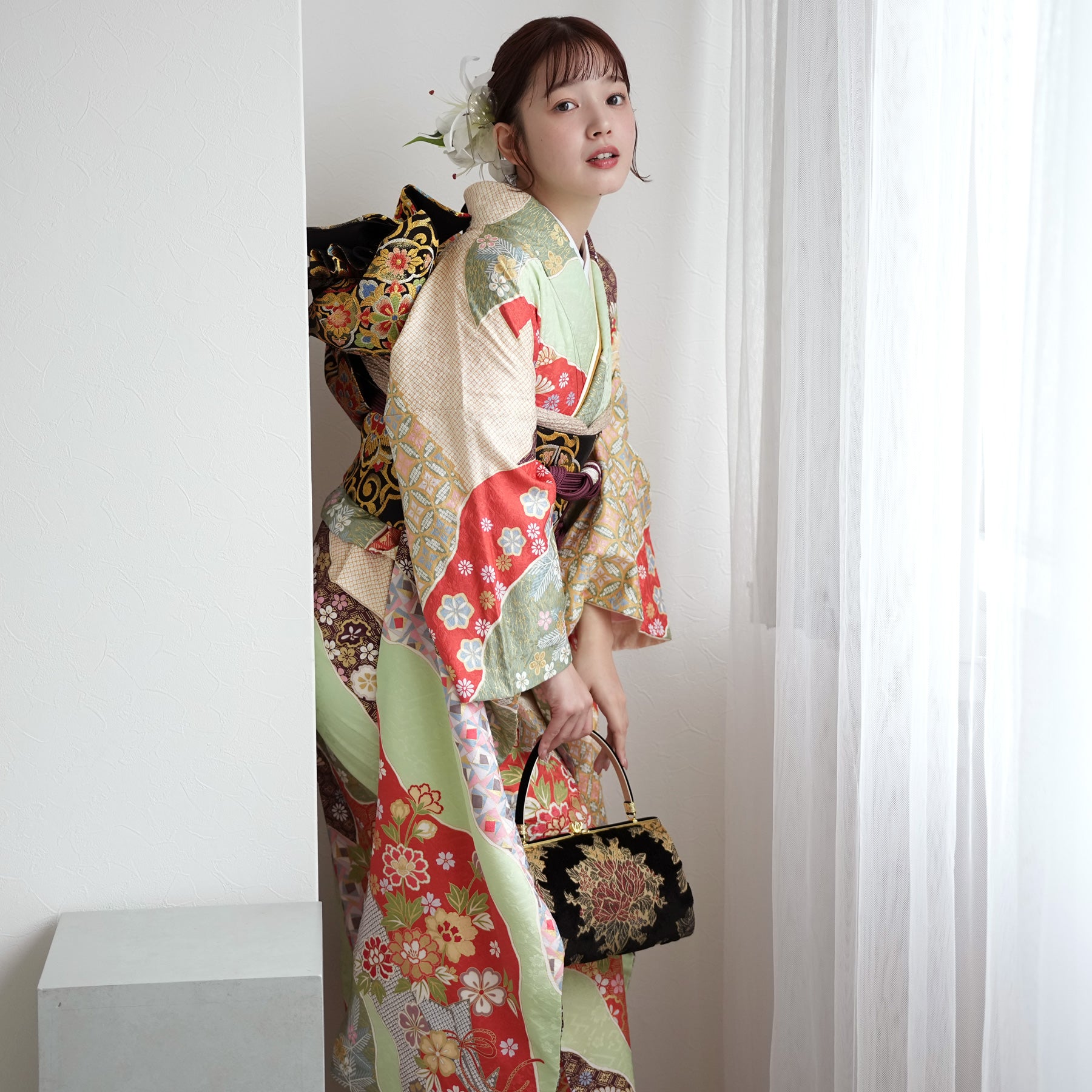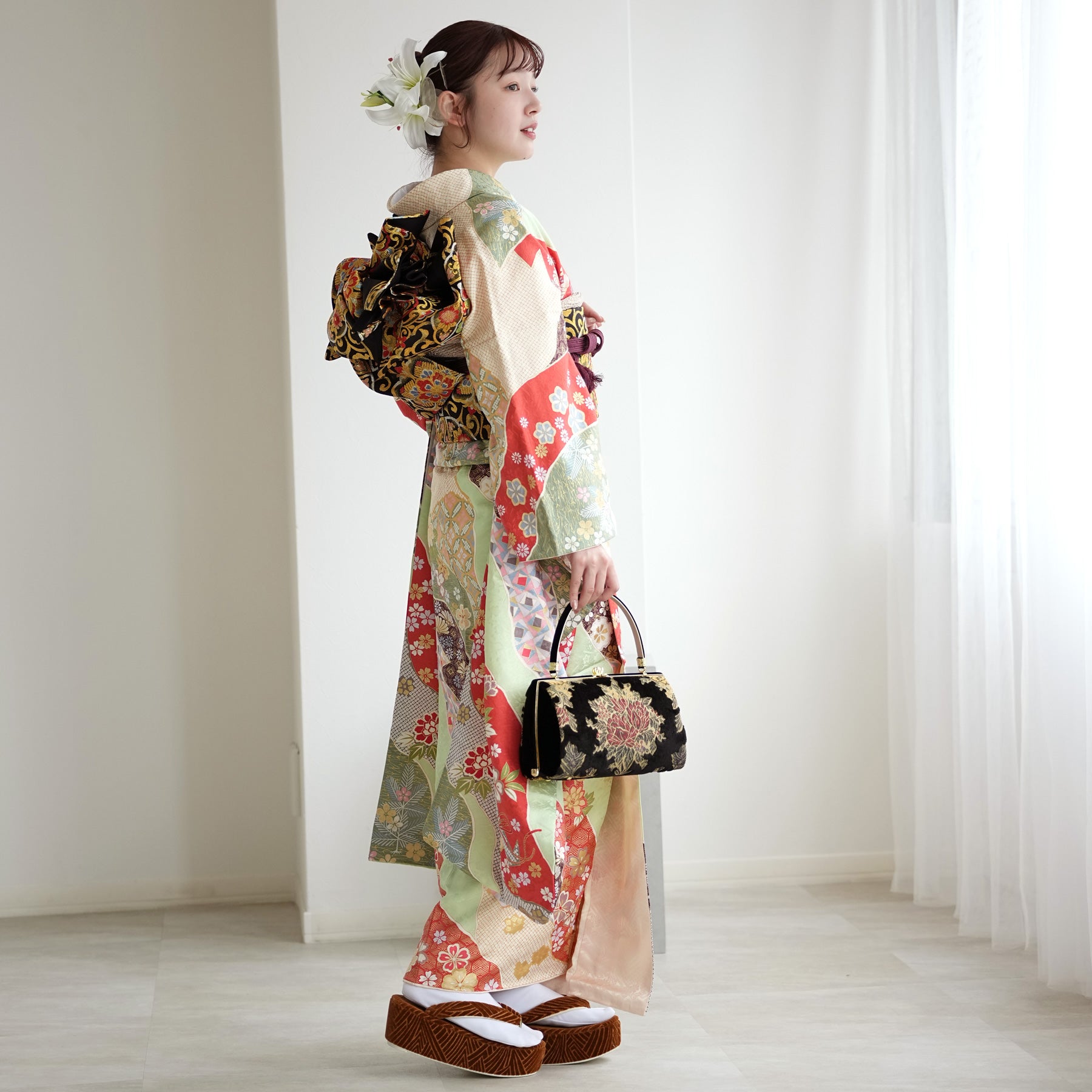 振袖・袋帯・草履・バッグ・長襦袢・帯〆・帯揚げ・重ね衿・肌襦袢・前板・着付けベルト・ウエストベルト・三重仮紐・腰ひも3本セット・帯まくら・伊達締め ・マジックベルト・衿芯・足袋(プレゼント)