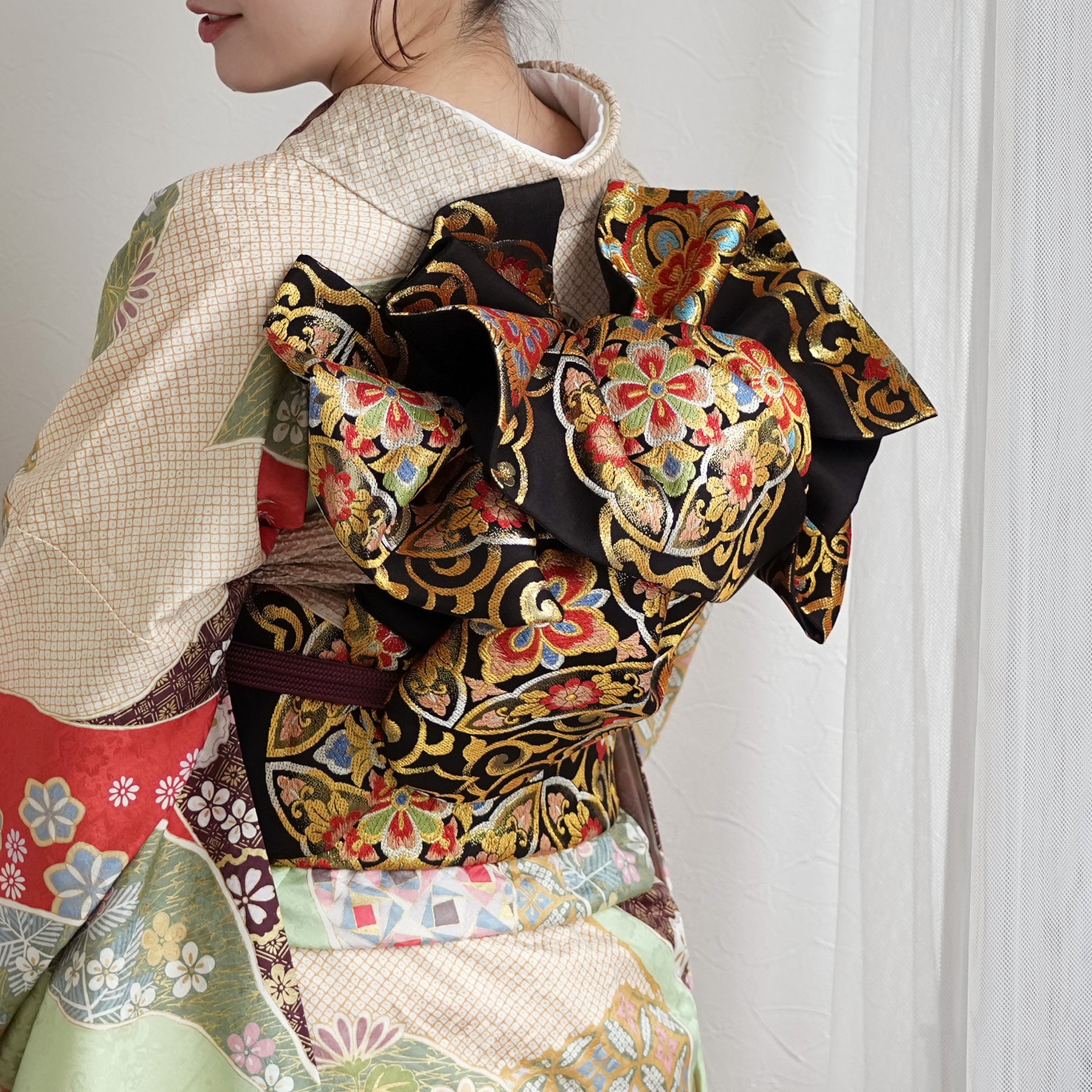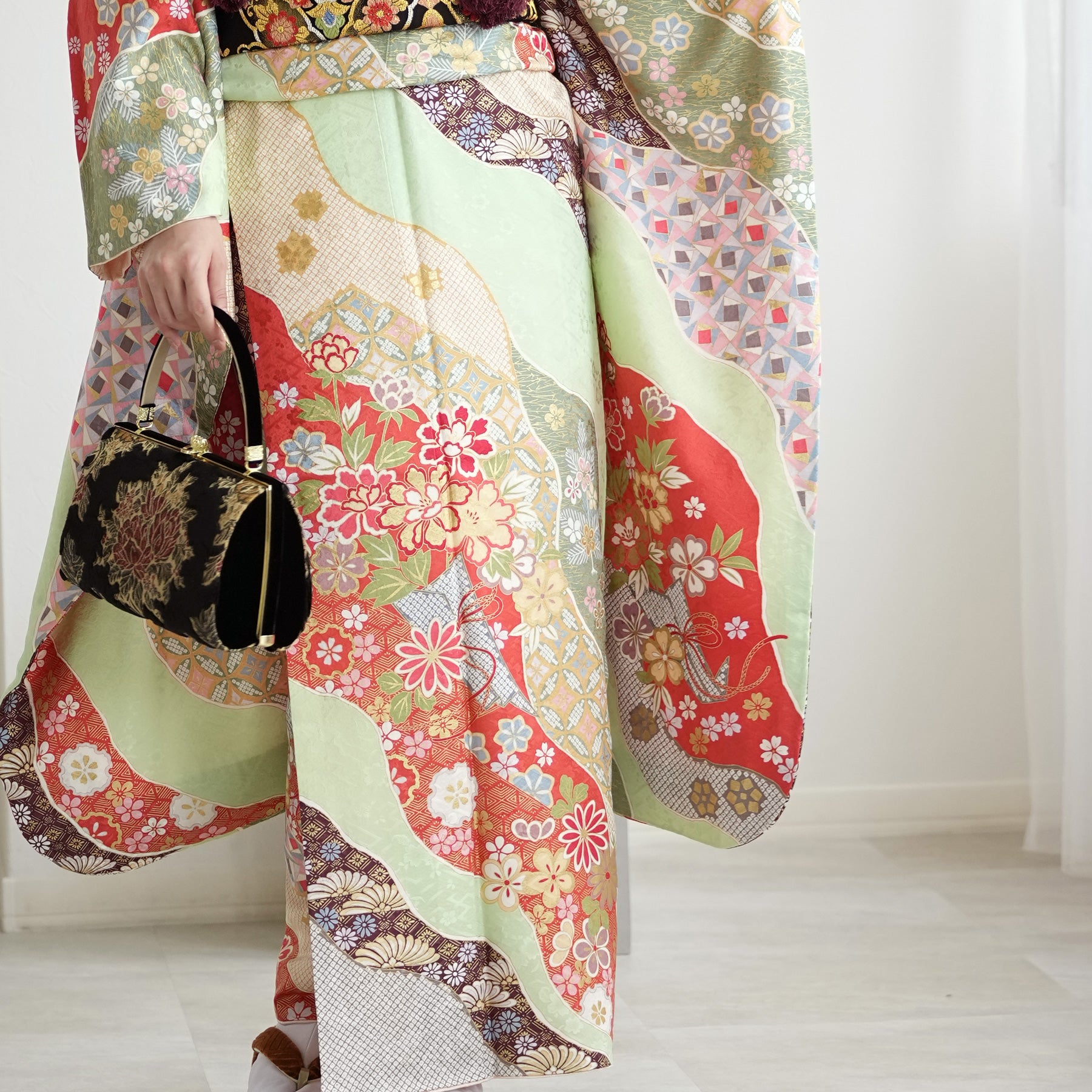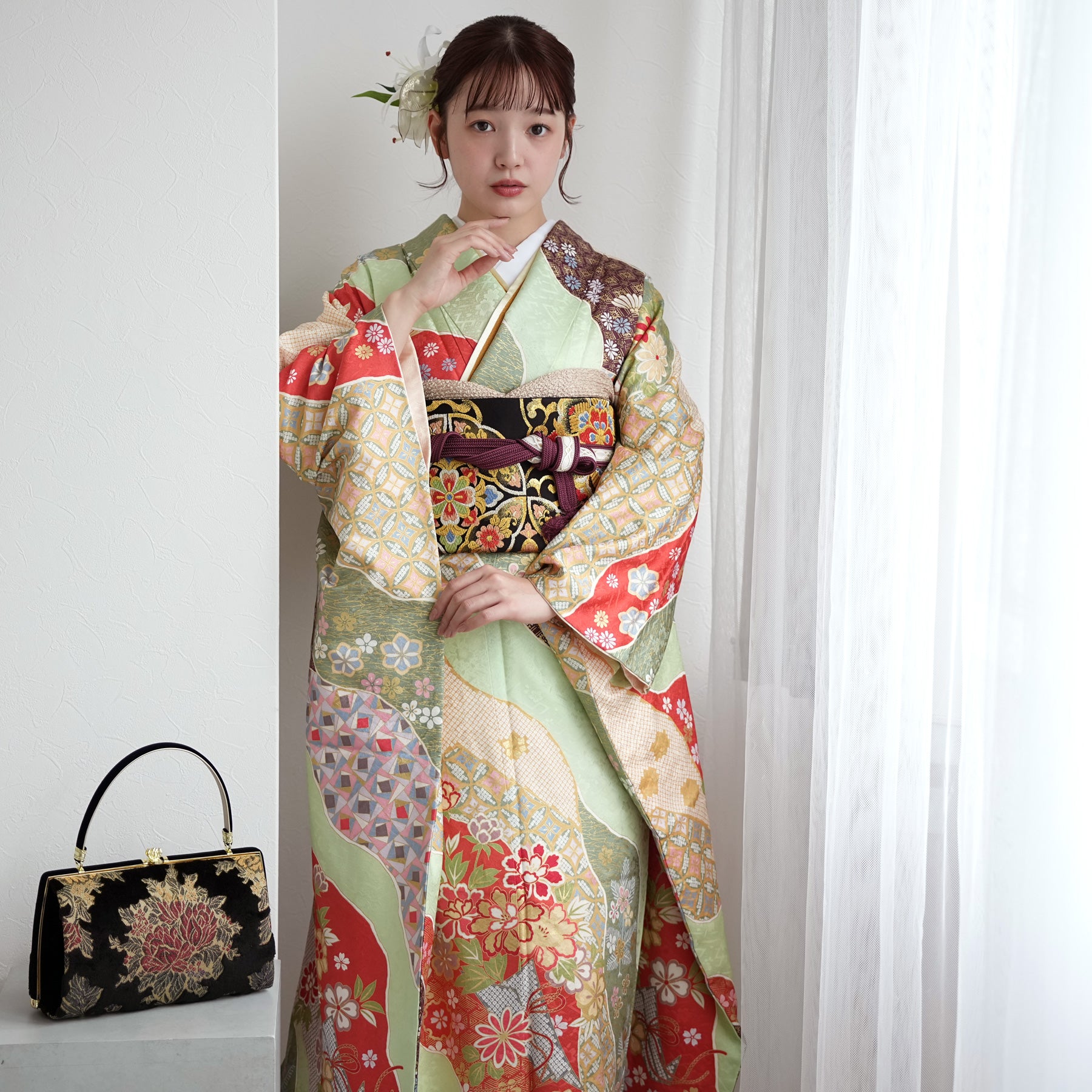振袖・袋帯・草履・バッグ・長襦袢・帯〆・帯揚げ・重ね衿・肌襦袢・前板・着付けベルト・ウエストベルト・三重仮紐・腰ひも3本セット・帯まくら・伊達締め ・マジックベルト・衿芯・足袋(プレゼント)