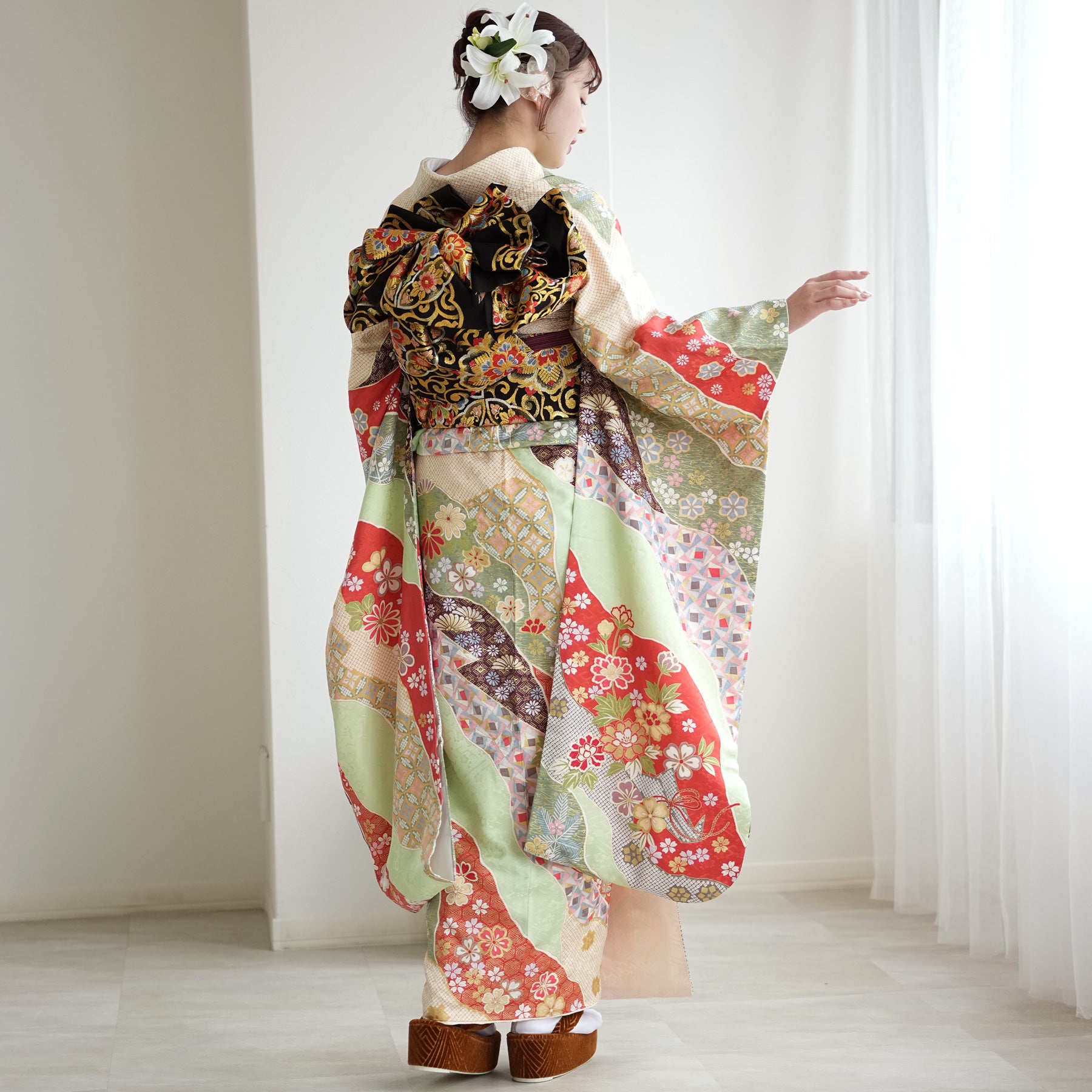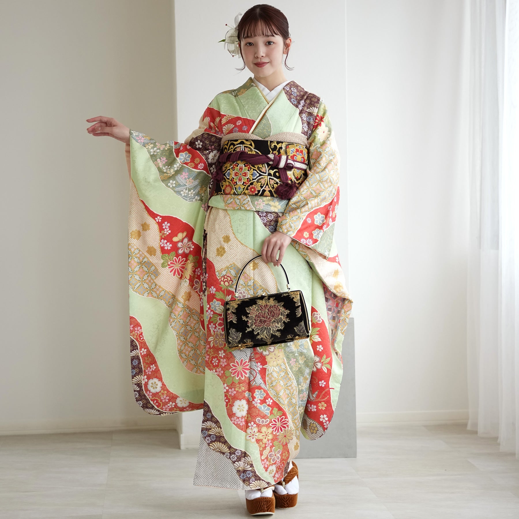 【レンタル】振袖 着物セット 正絹着物+正絹袋帯 成人式  晴れ着 記念撮影 往復送料無料 絵羽 グリーンとオレンジの古典柄(1000605000)
