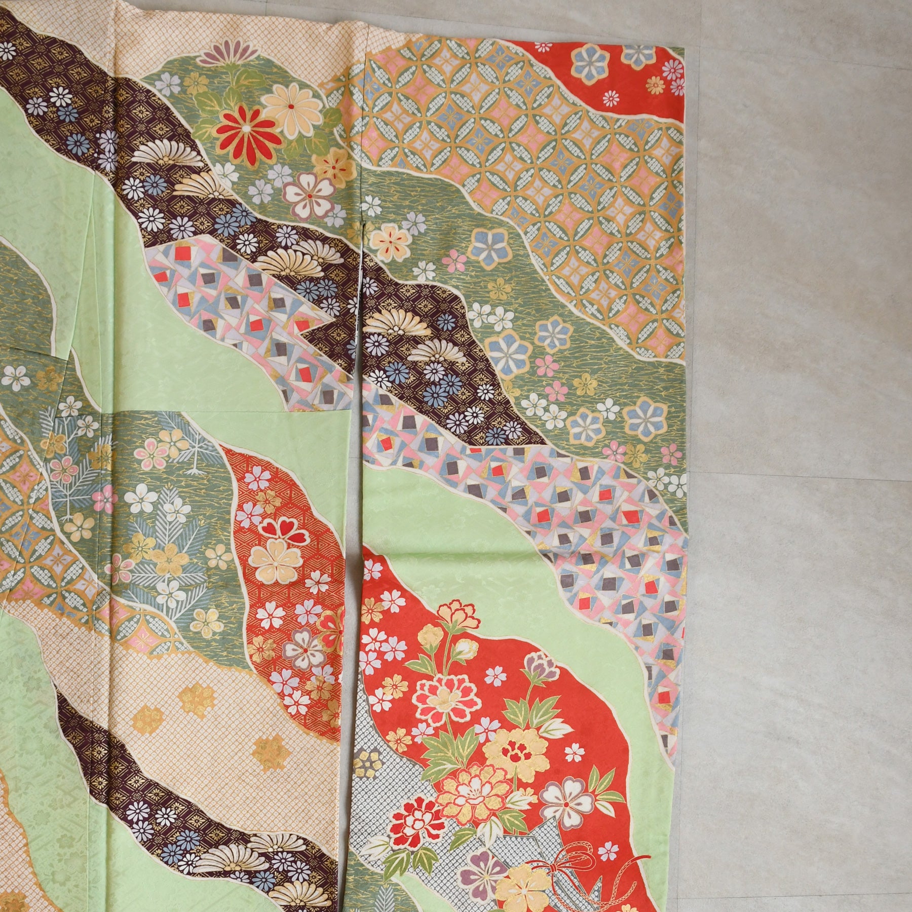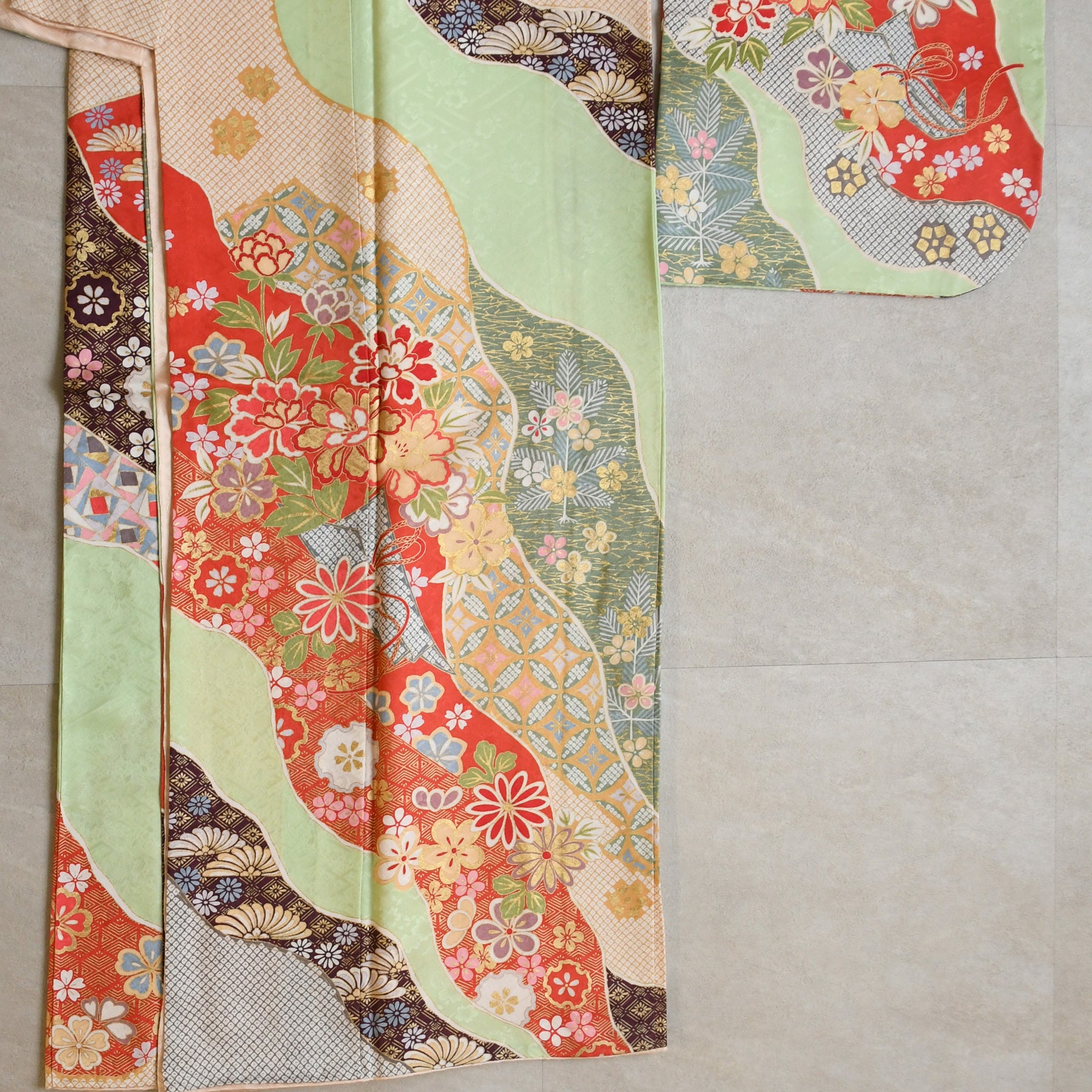 【レンタル】振袖 着物セット 正絹着物+正絹袋帯 成人式 晴れ着 記念撮影 往復送料無料 絵羽 グリーンとオレンジの古典柄(1000605000)