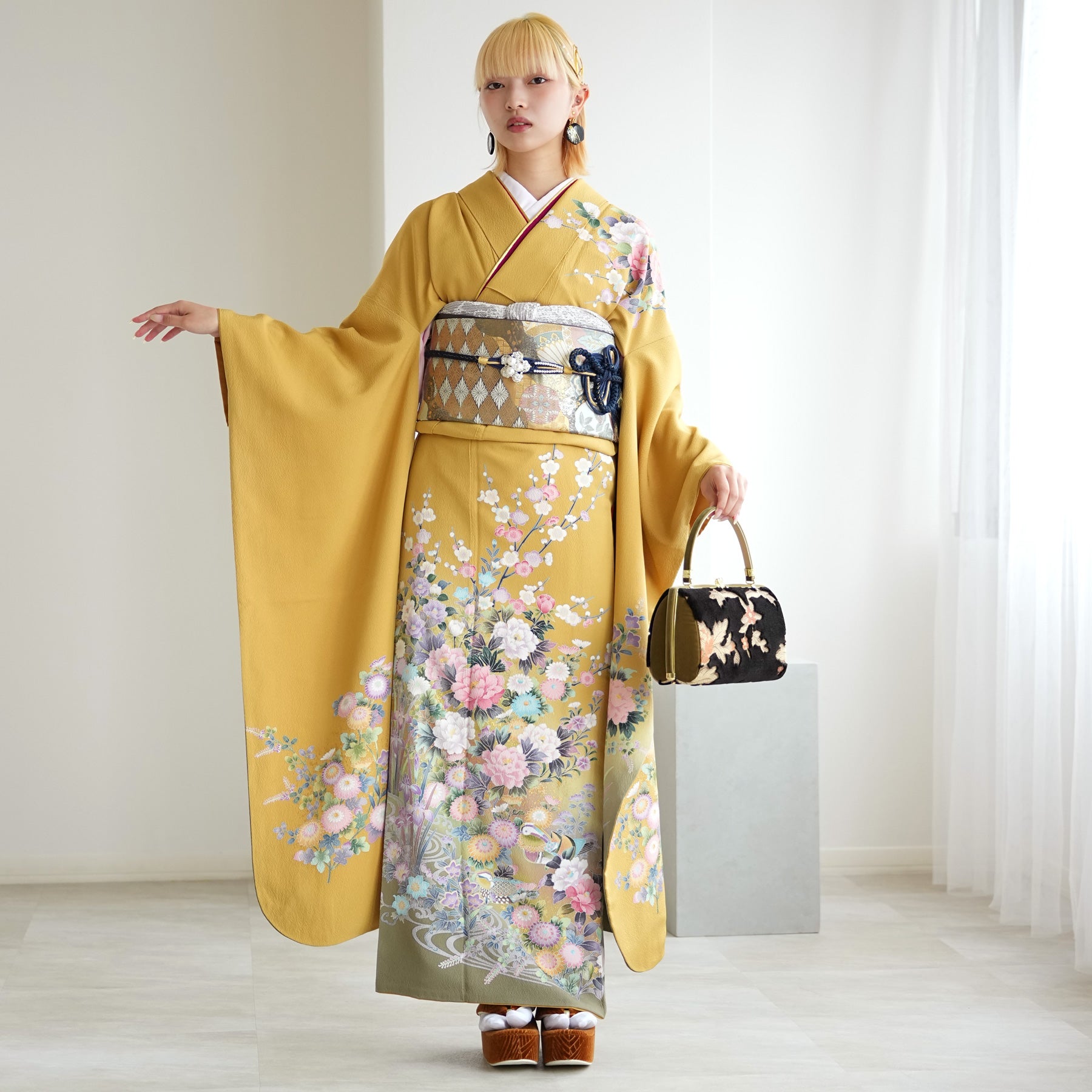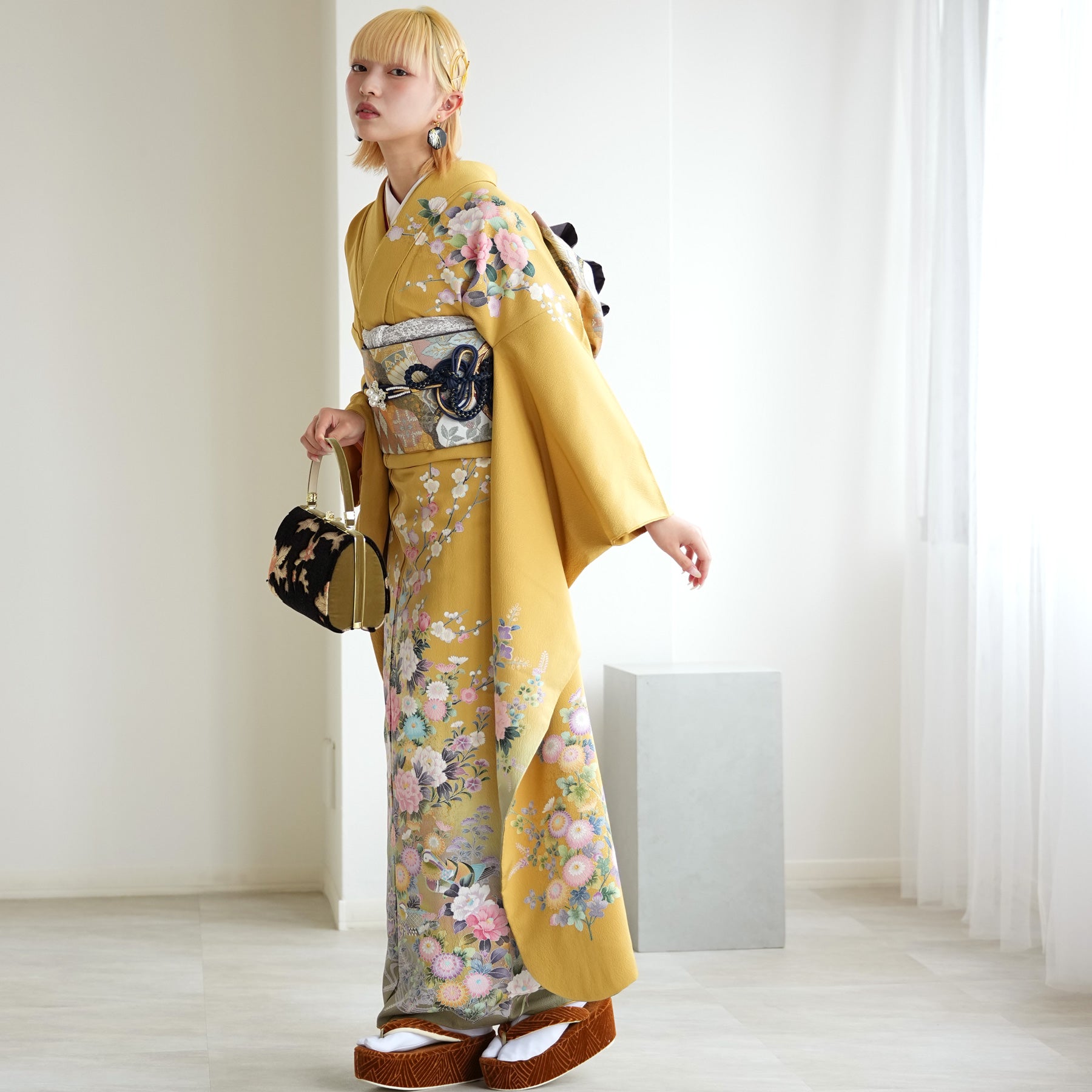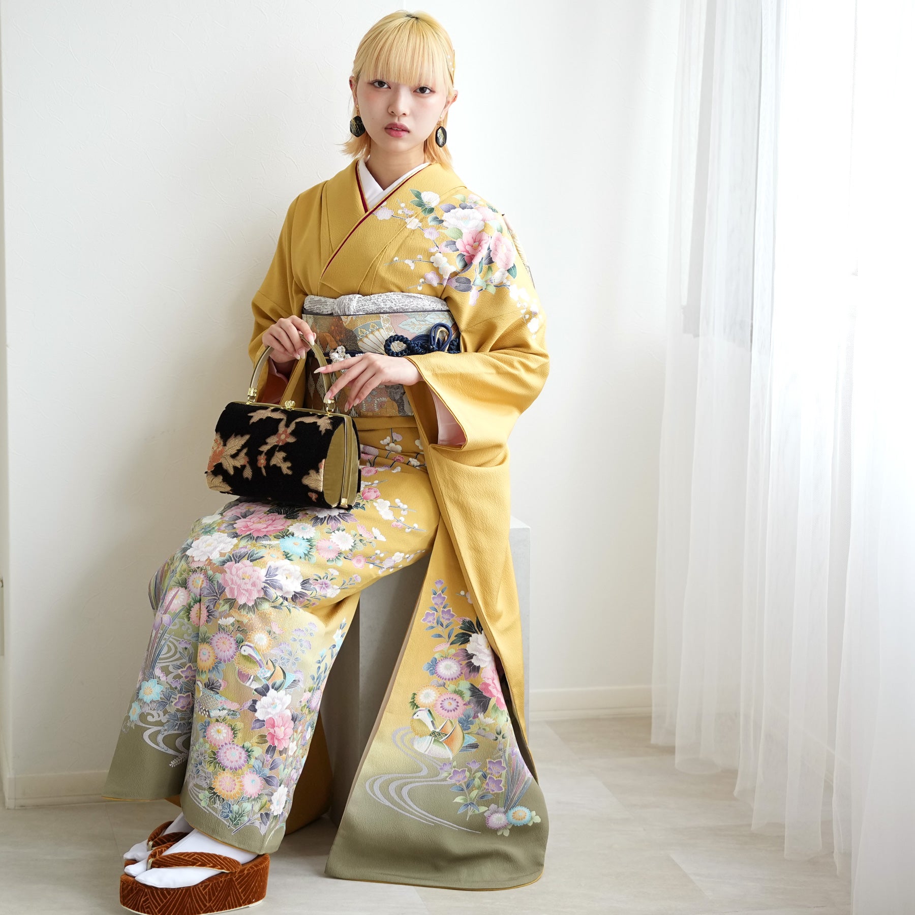 振袖・袋帯・草履・バッグ・長襦袢・帯〆・帯揚げ・重ね衿・肌襦袢・前板・着付けベルト・ウエストベルト・三重仮紐・腰ひも3本セット・帯まくら・伊達締め ・マジックベルト・衿芯・足袋(プレゼント)