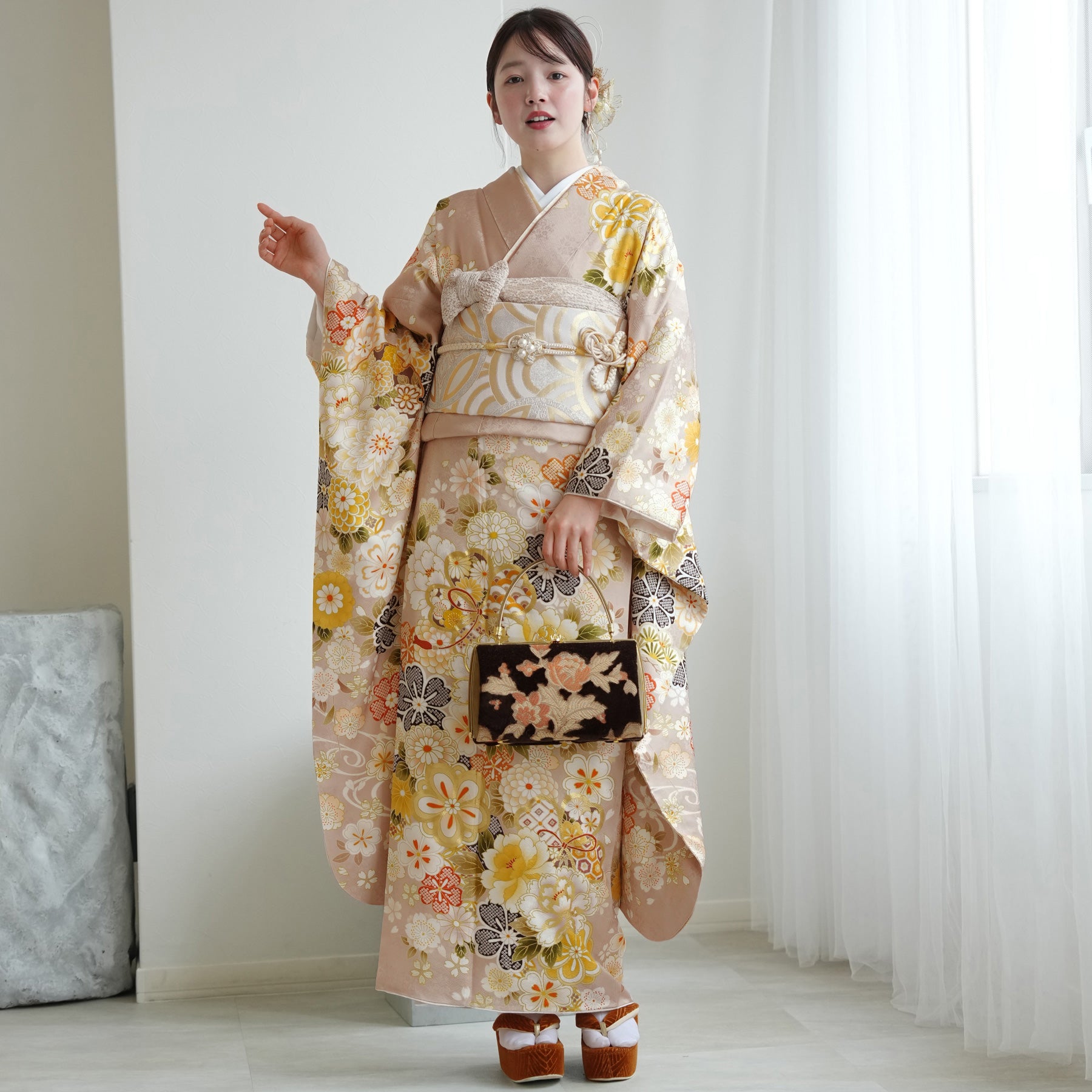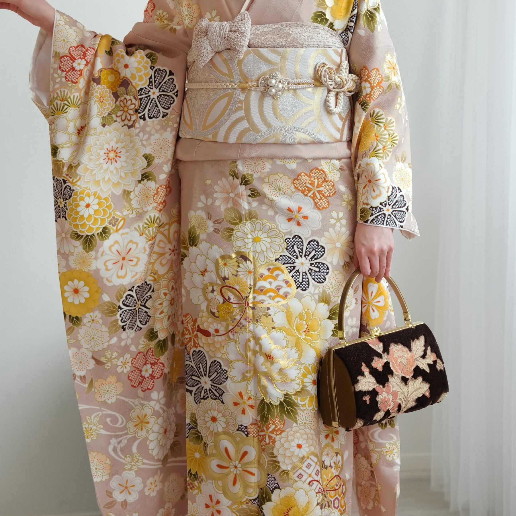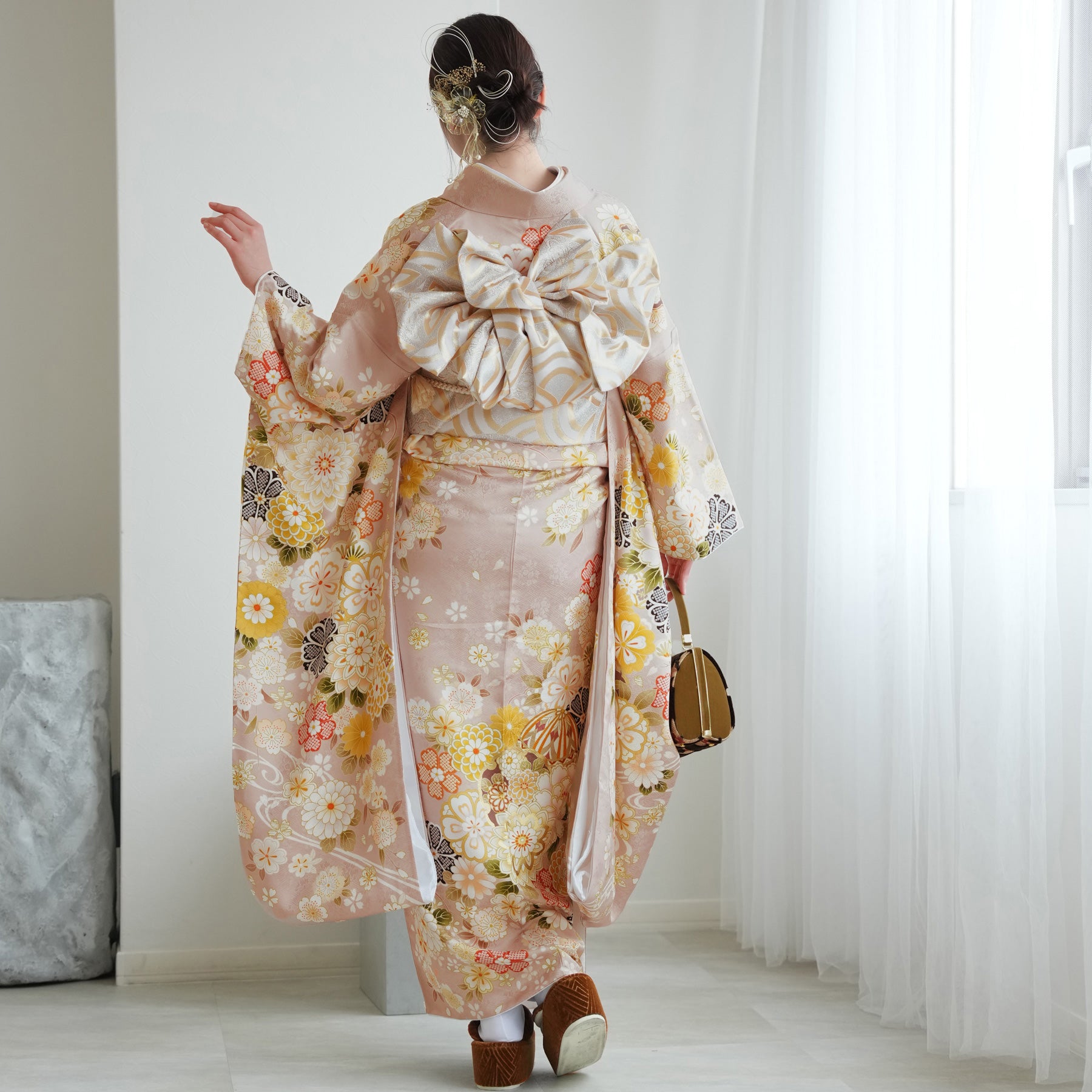 振袖・袋帯・草履・バッグ・長襦袢・帯〆・帯揚げ・重ね衿・肌襦袢・前板・着付けベルト・ウエストベルト・三重仮紐・腰ひも3本セット・帯まくら・伊達締め ・マジックベルト・衿芯・足袋(プレゼント)