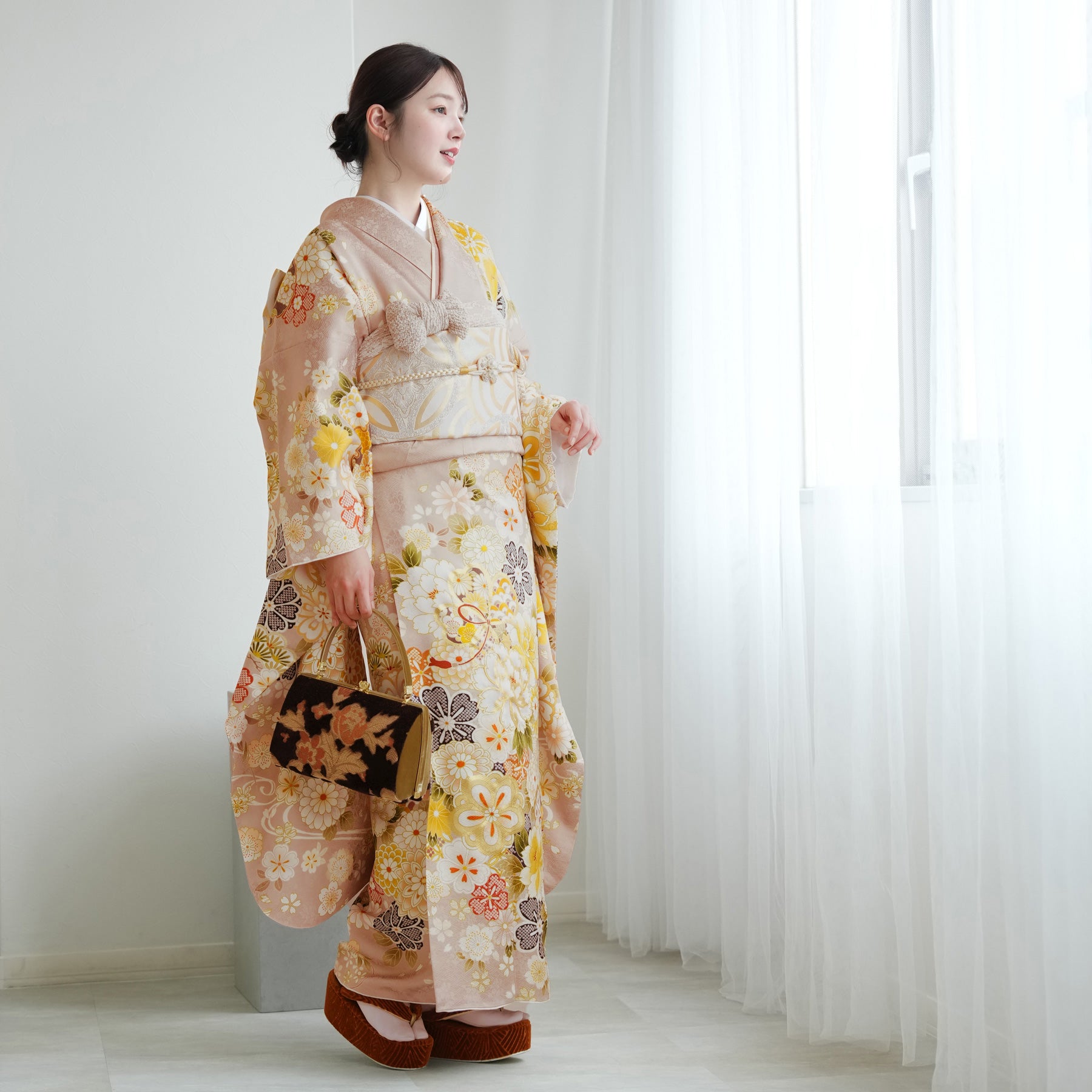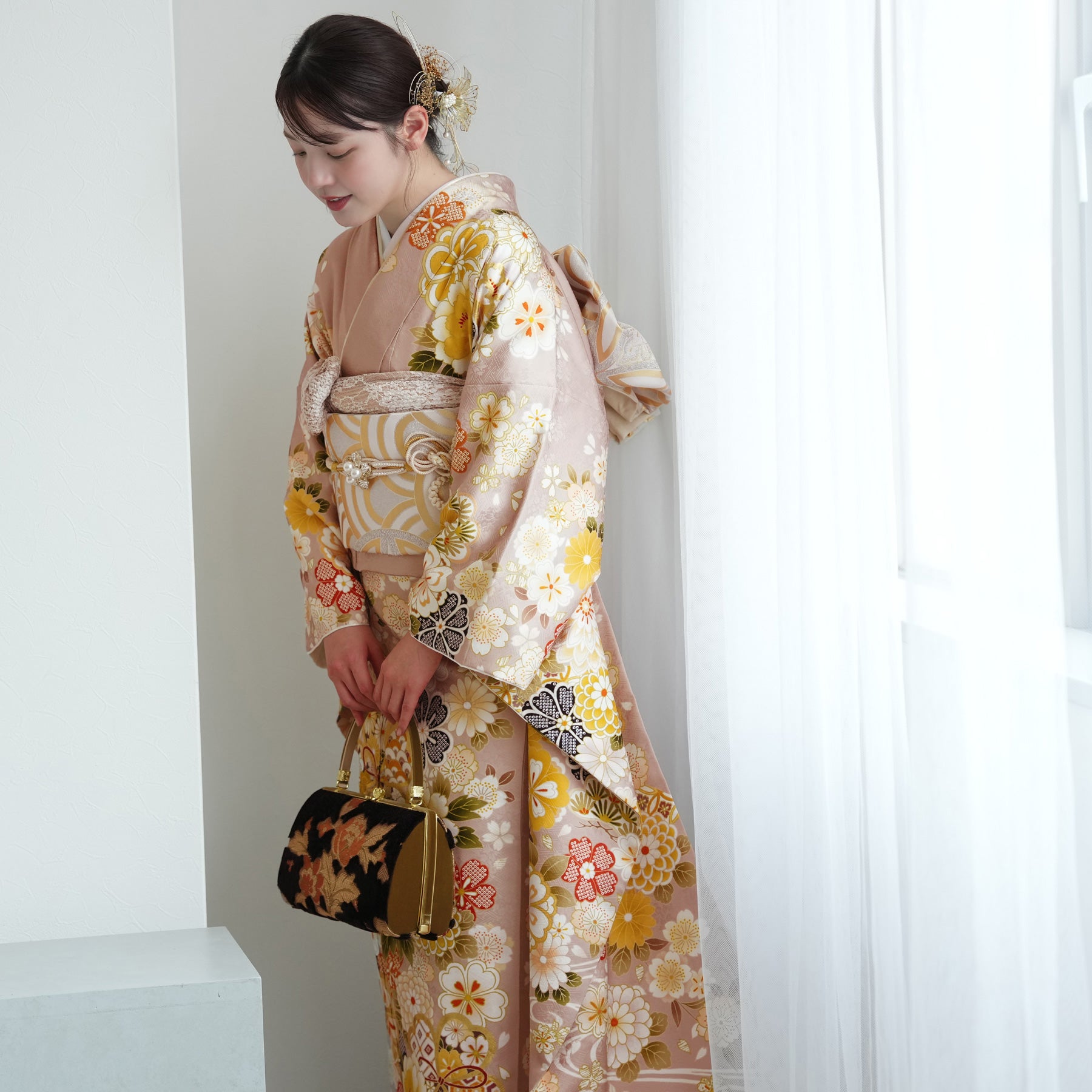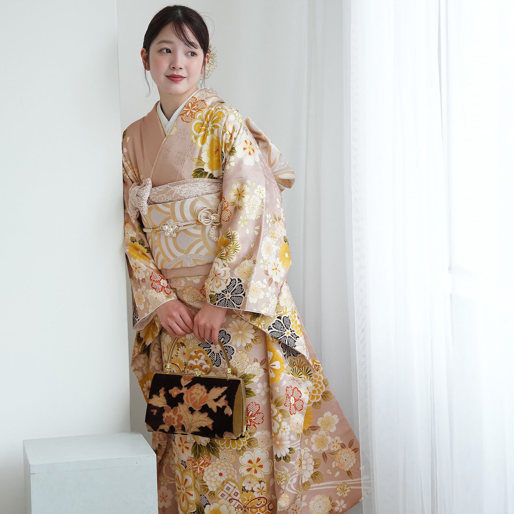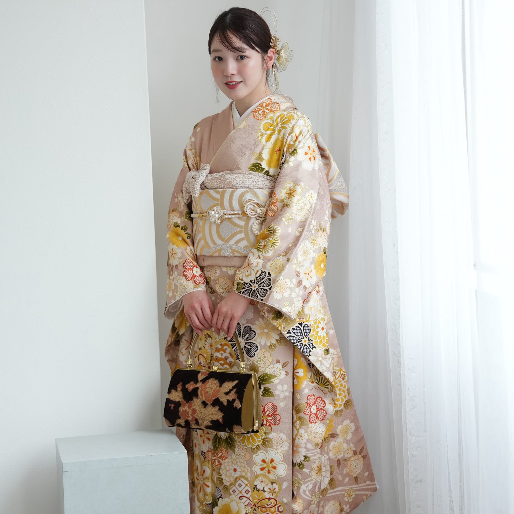 振袖・袋帯・草履・バッグ・長襦袢・帯〆・帯揚げ・重ね衿・肌襦袢・前板・着付けベルト・ウエストベルト・三重仮紐・腰ひも3本セット・帯まくら・伊達締め ・マジックベルト・衿芯・足袋(プレゼント)