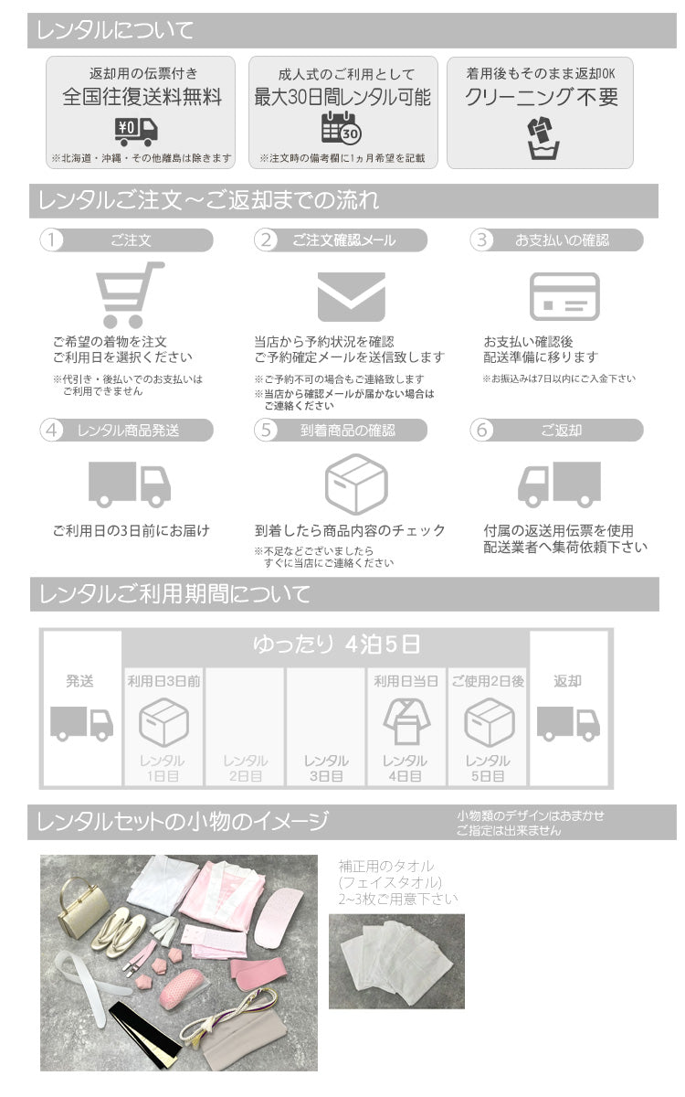 着付けに必要な小物はすべてそろっているフルセットレンタル。