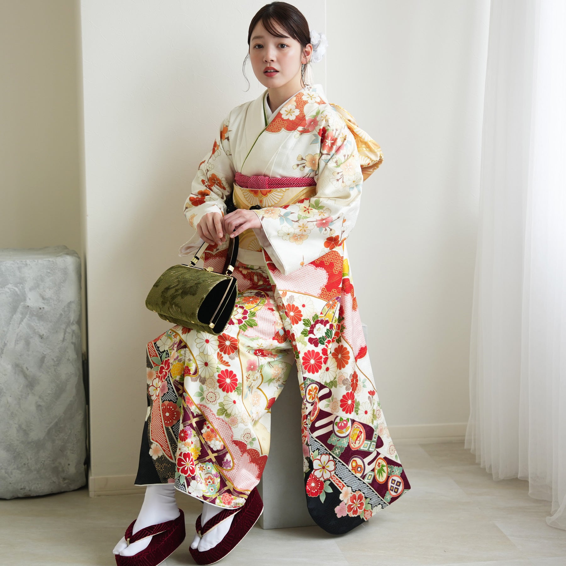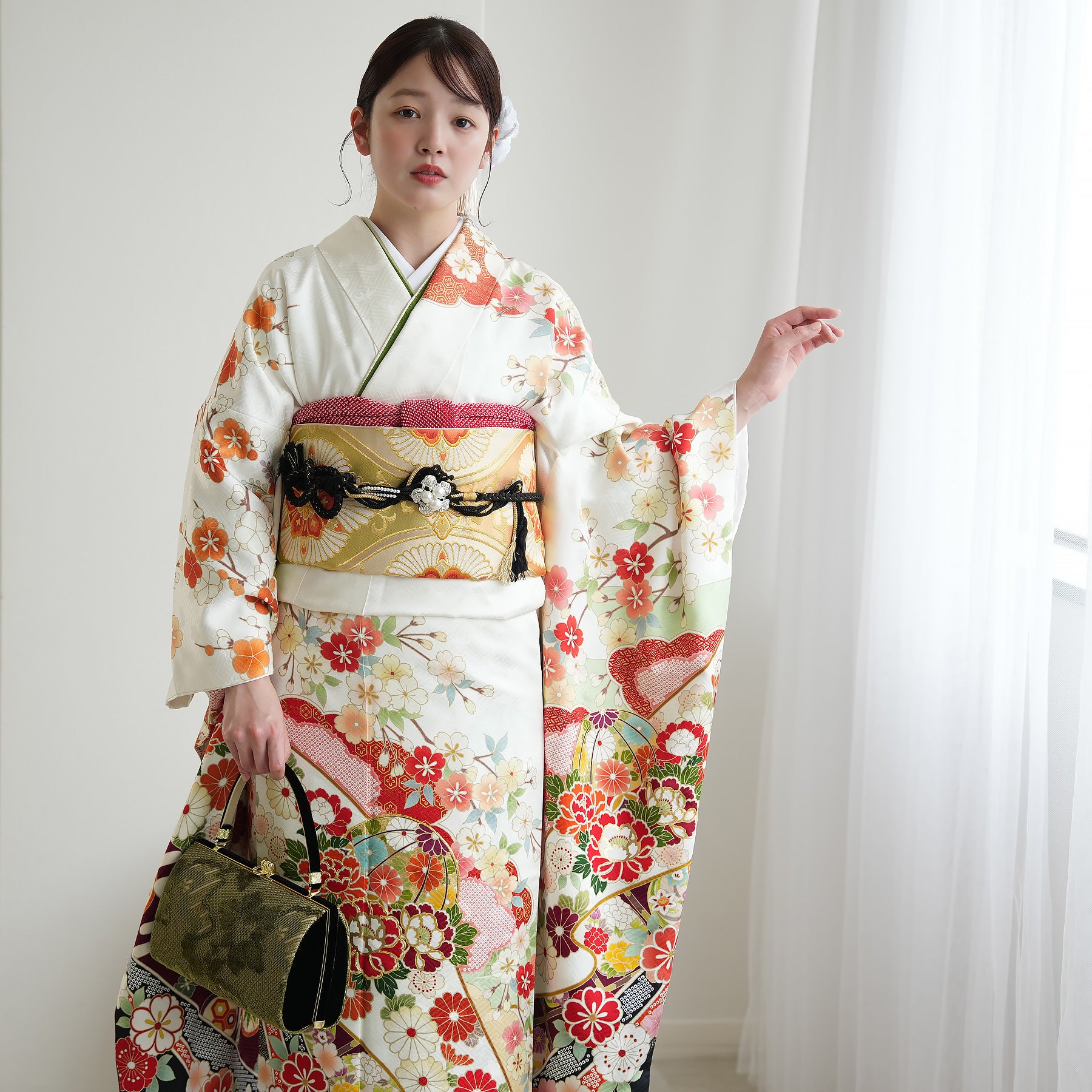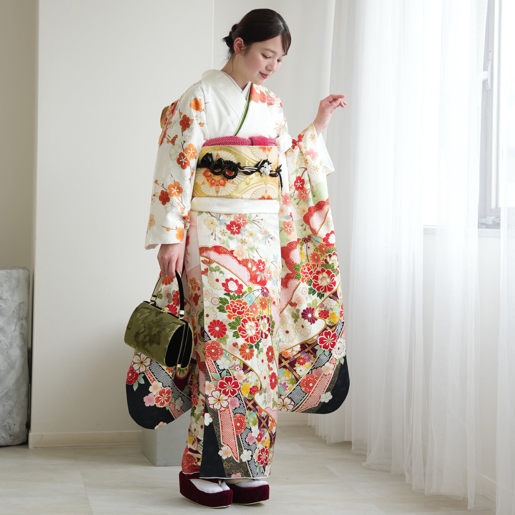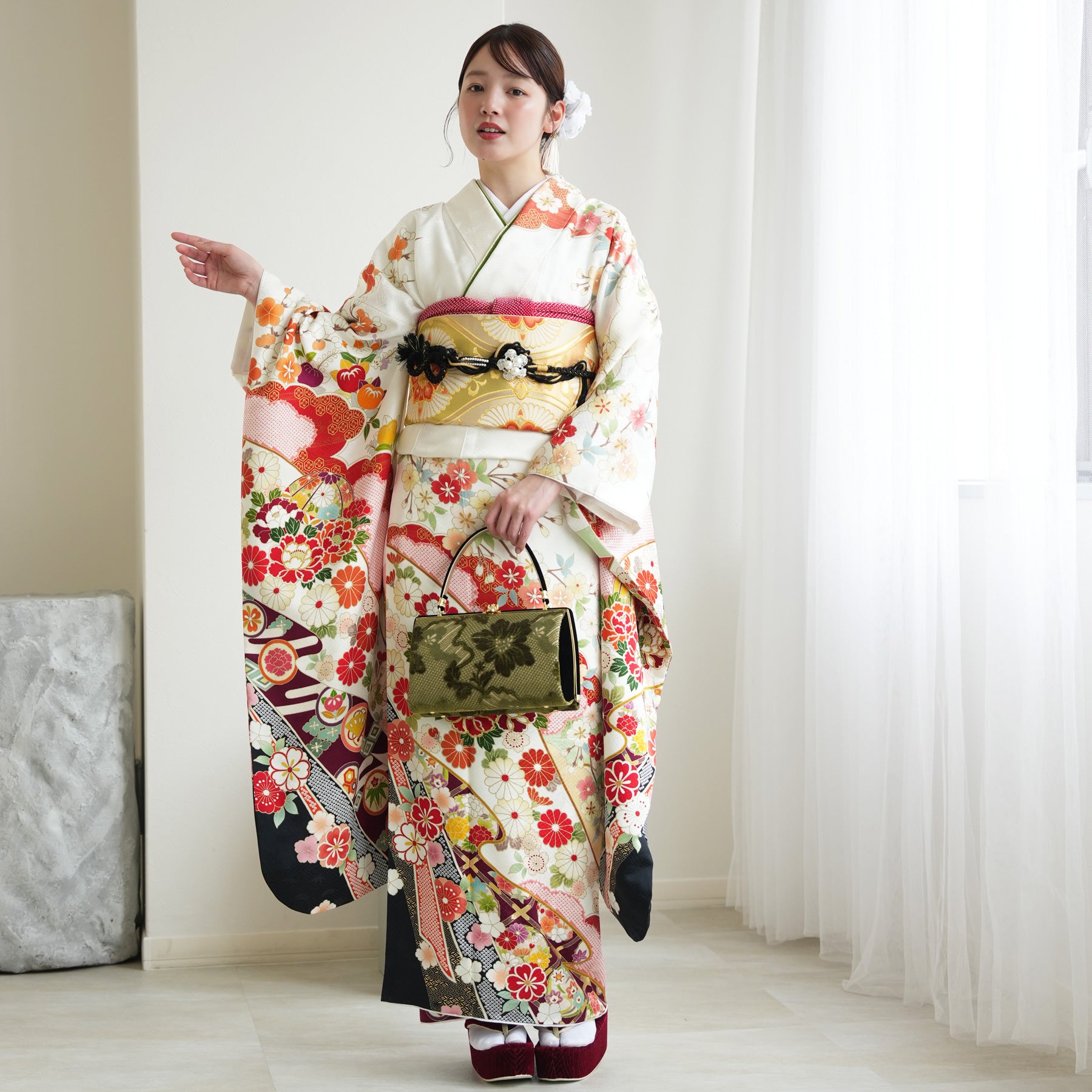 振袖・袋帯・草履・バッグ・長襦袢・帯〆・帯揚げ・重ね衿・肌襦袢・前板・着付けベルト・ウエストベルト・三重仮紐・腰ひも3本セット・帯まくら・伊達締め ・マジックベルト・衿芯・足袋(プレゼント)