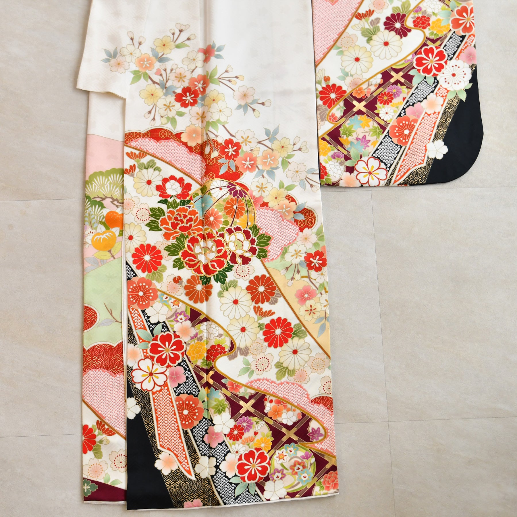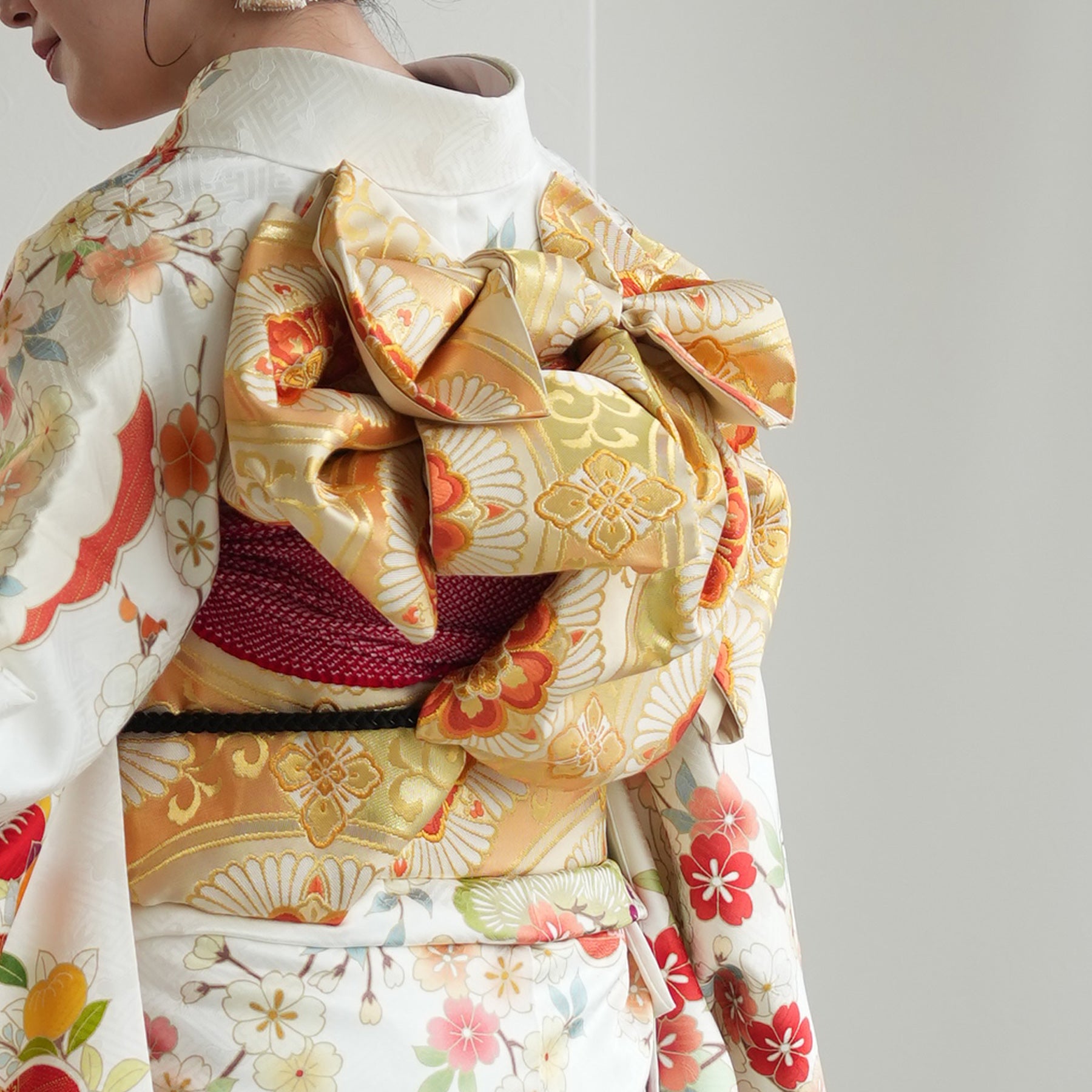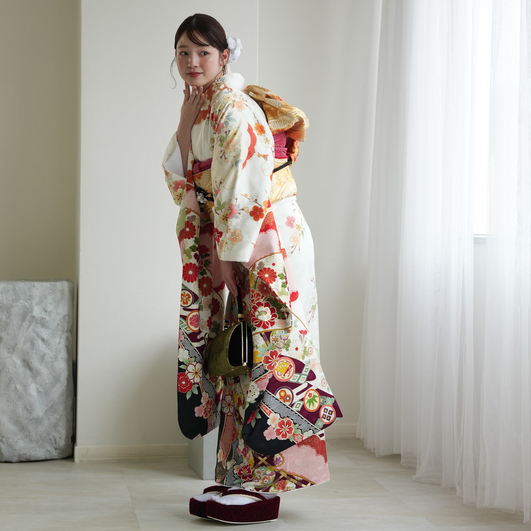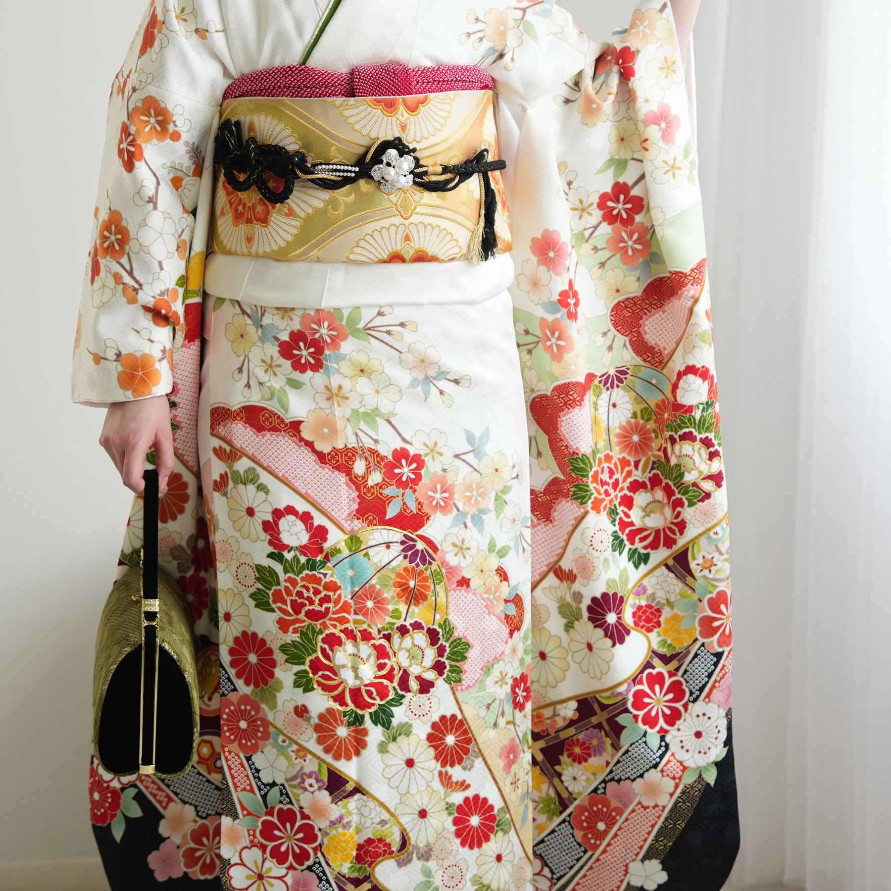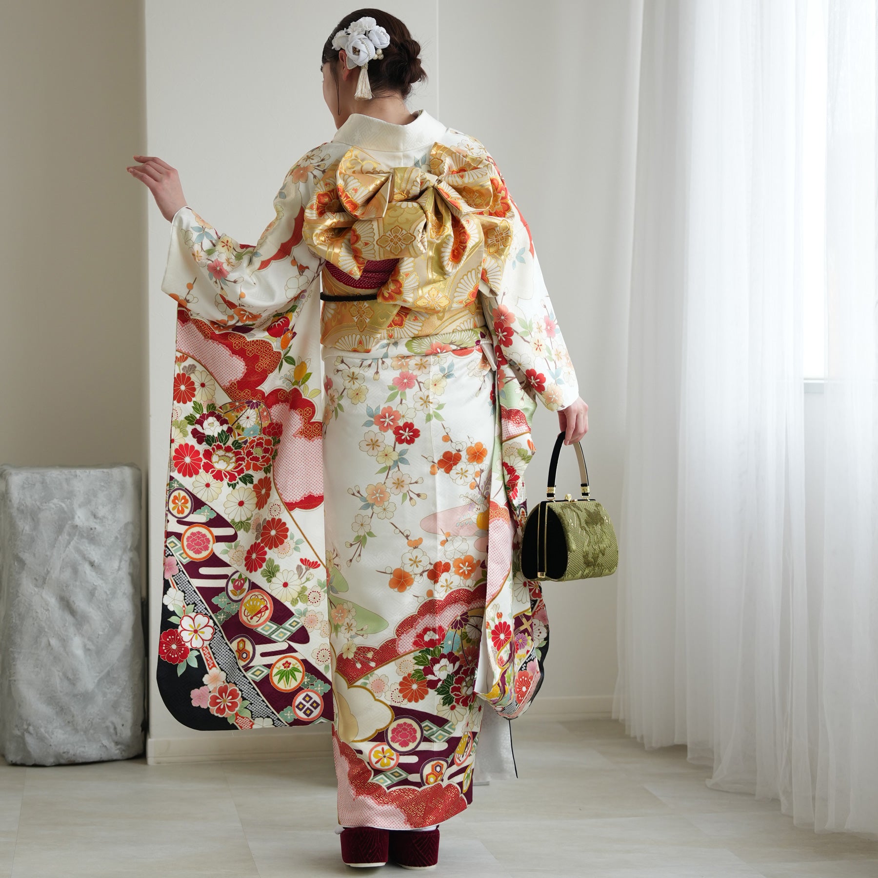 振袖・袋帯・草履・バッグ・長襦袢・帯〆・帯揚げ・重ね衿・肌襦袢・前板・着付けベルト・ウエストベルト・三重仮紐・腰ひも3本セット・帯まくら・伊達締め ・マジックベルト・衿芯・足袋(プレゼント)