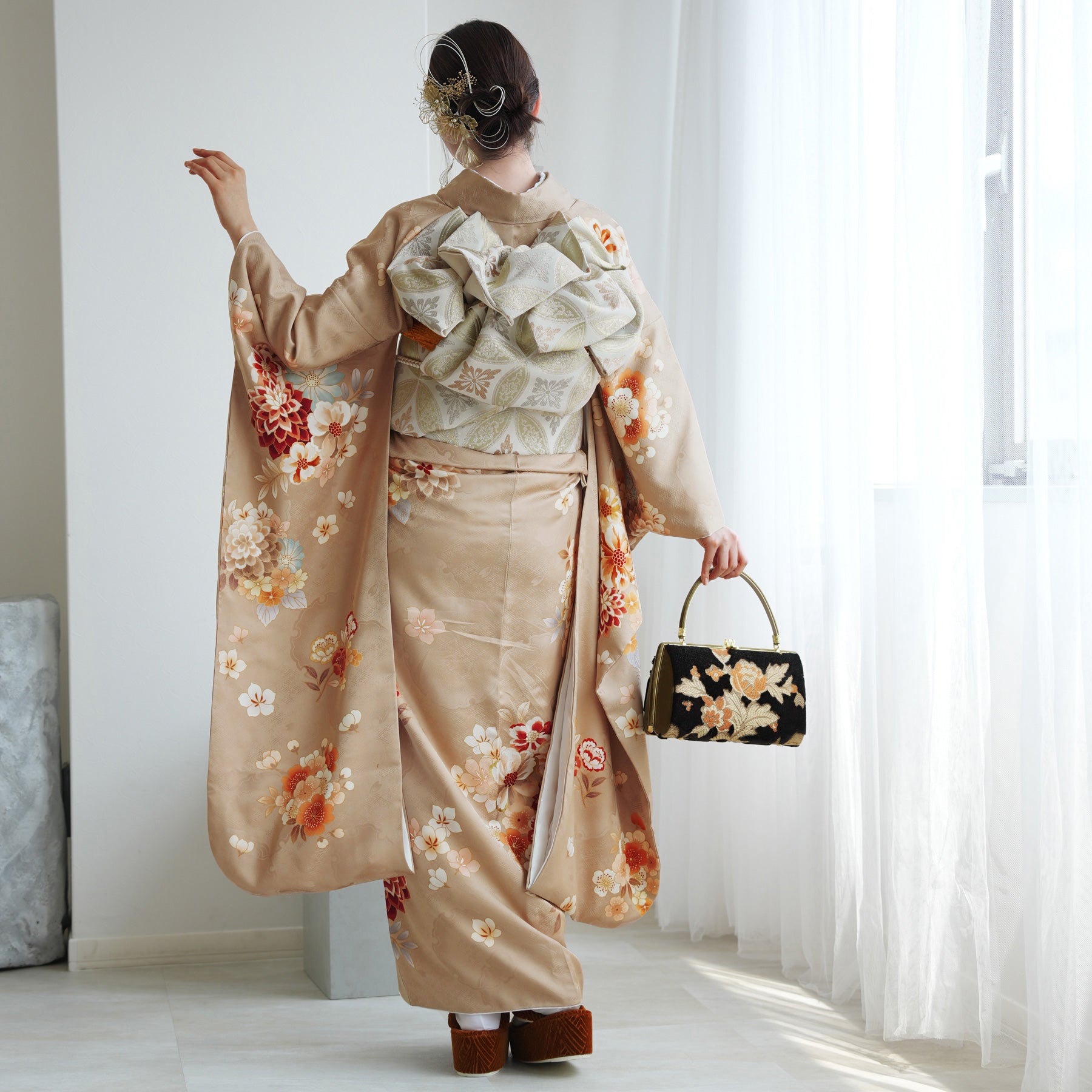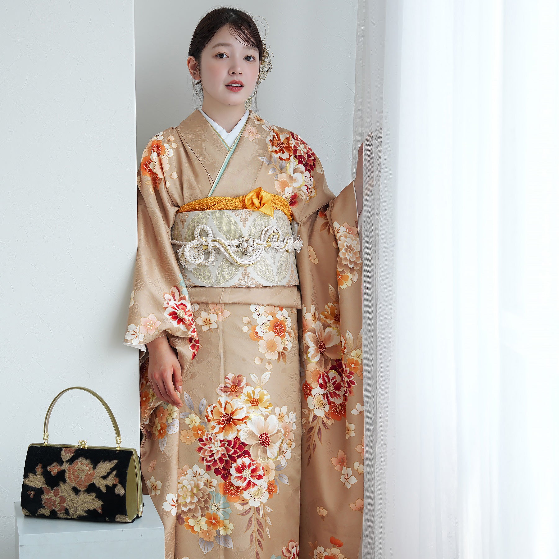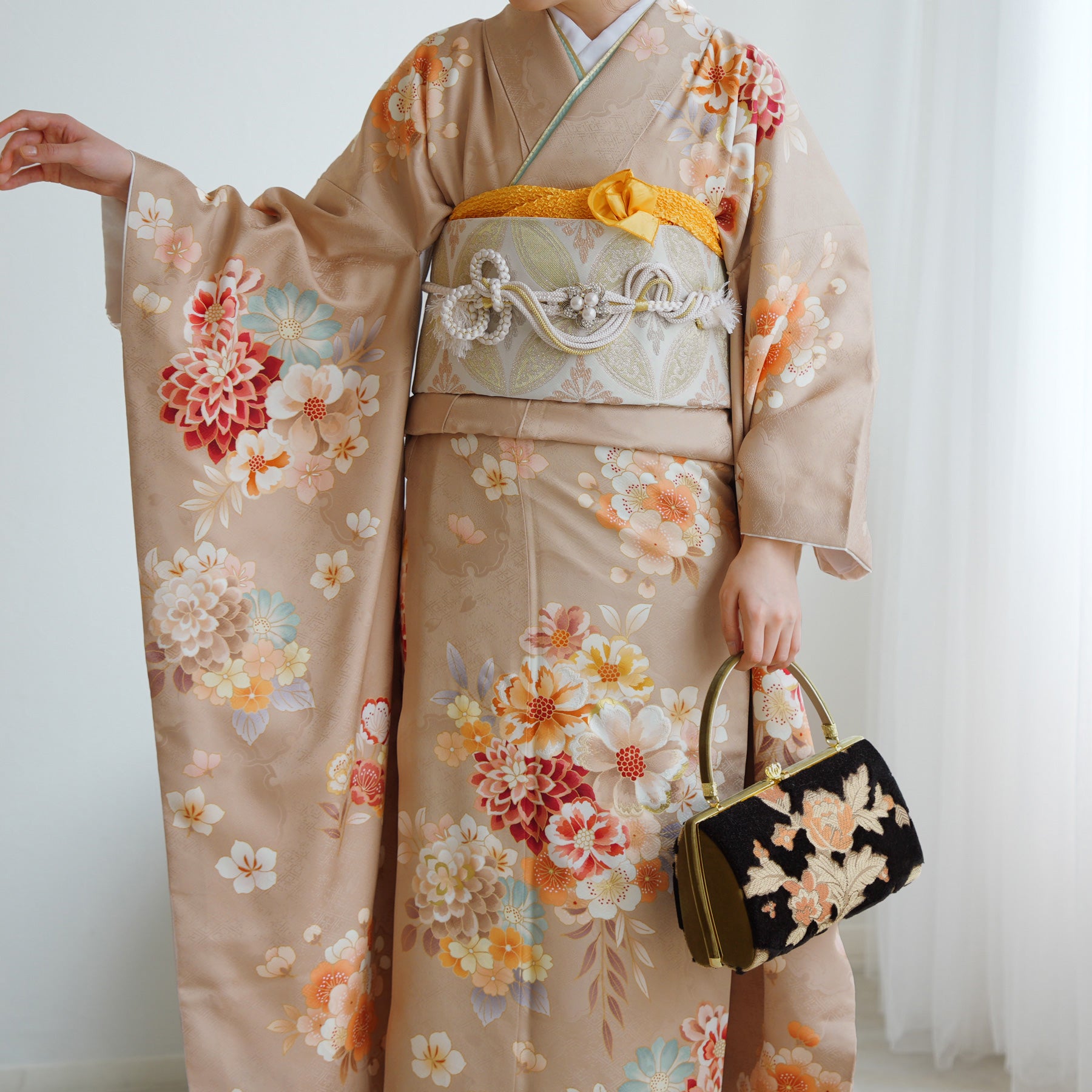 振袖・袋帯・草履・バッグ・長襦袢・帯〆・帯揚げ・重ね衿・肌襦袢・前板・着付けベルト・ウエストベルト・三重仮紐・腰ひも3本セット・帯まくら・伊達締め ・マジックベルト・衿芯・足袋(プレゼント)