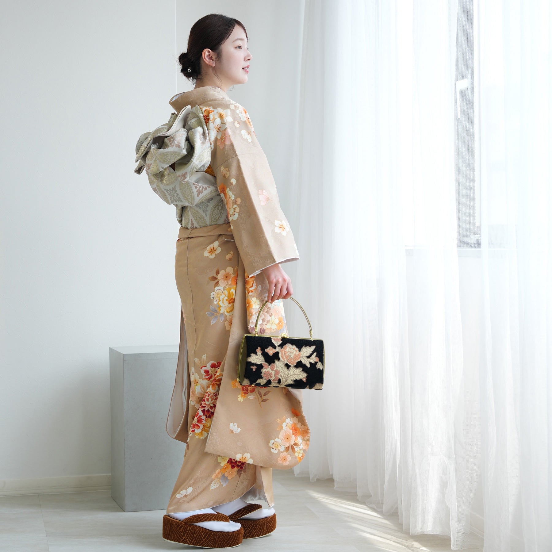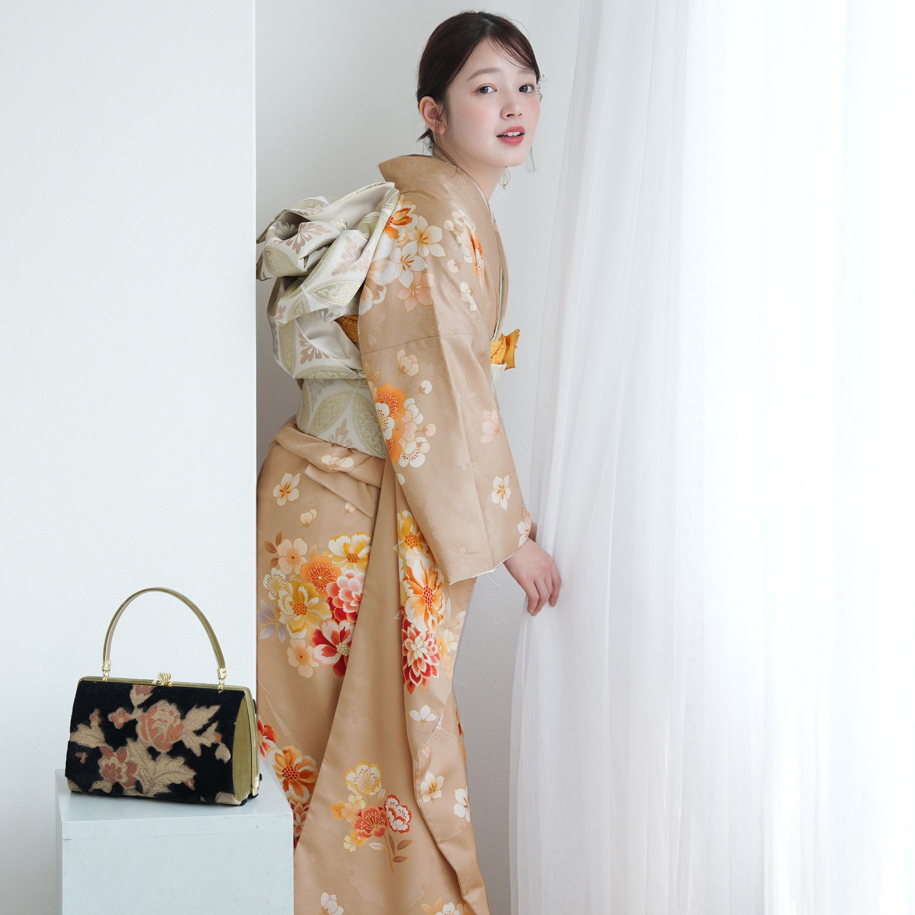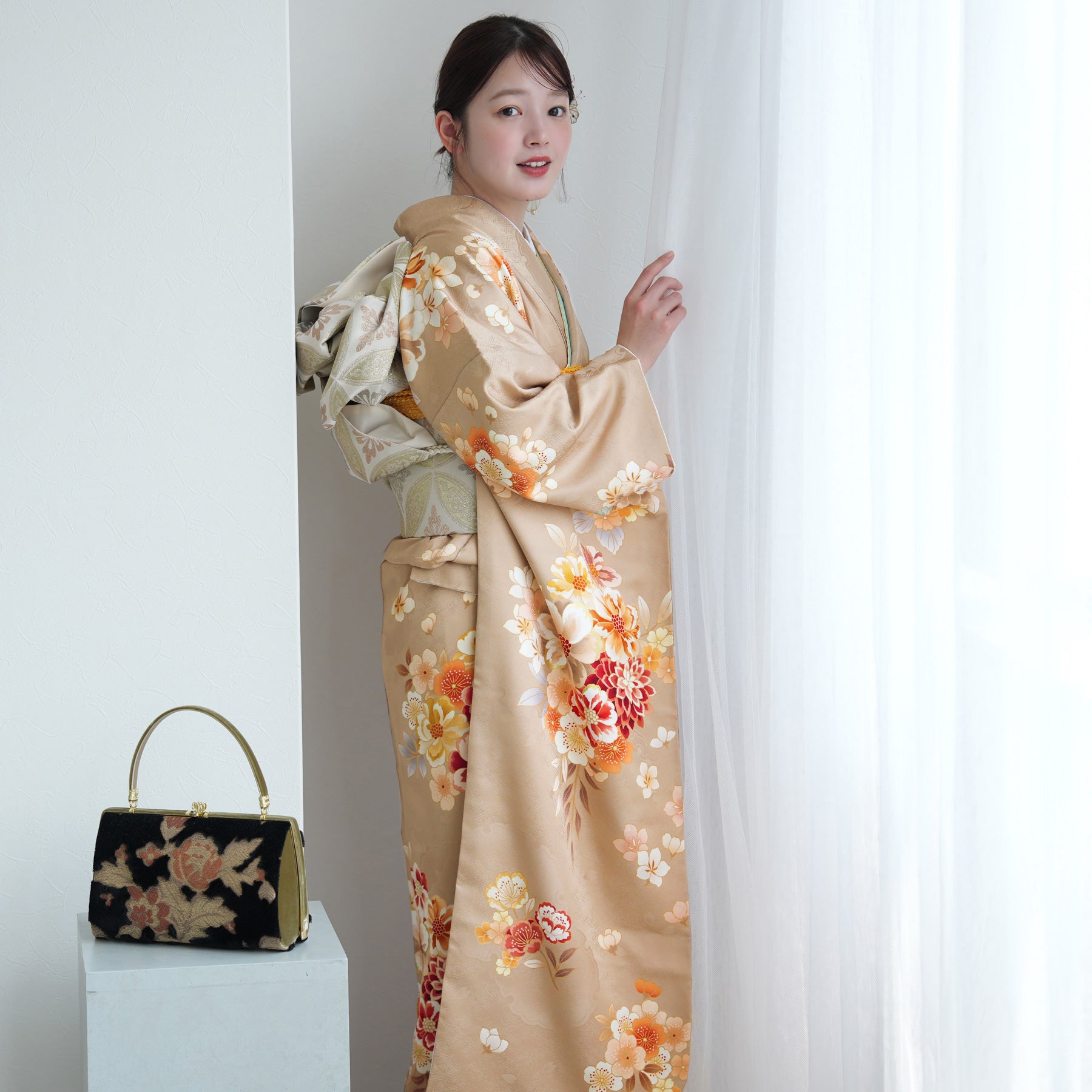 振袖・袋帯・草履・バッグ・長襦袢・帯〆・帯揚げ・重ね衿・肌襦袢・前板・着付けベルト・ウエストベルト・三重仮紐・腰ひも3本セット・帯まくら・伊達締め ・マジックベルト・衿芯・足袋(プレゼント)