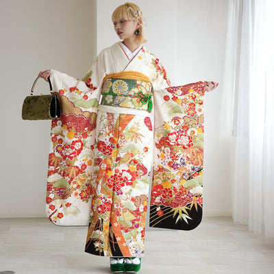 【レンタル】振袖 着物セット 正絹着物+正絹袋帯 成人式 晴れ着 記念撮影 往復送料無料 絵羽 白黒オレンジの牡丹松(1000602300)