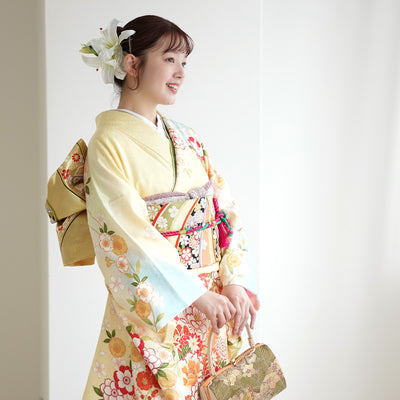 【レンタル】振袖 着物セット 正絹着物+正絹袋帯 成人式 晴れ着 記念撮影 往復送料無料 絵羽 淡いイエロー古典ぼかし(1000601600)