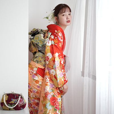 【レンタル】振袖 着物セット 正絹着物+正絹袋帯 成人式 晴れ着 記念撮影 往復送料無料 赤と黄色の古典花(1000604300)