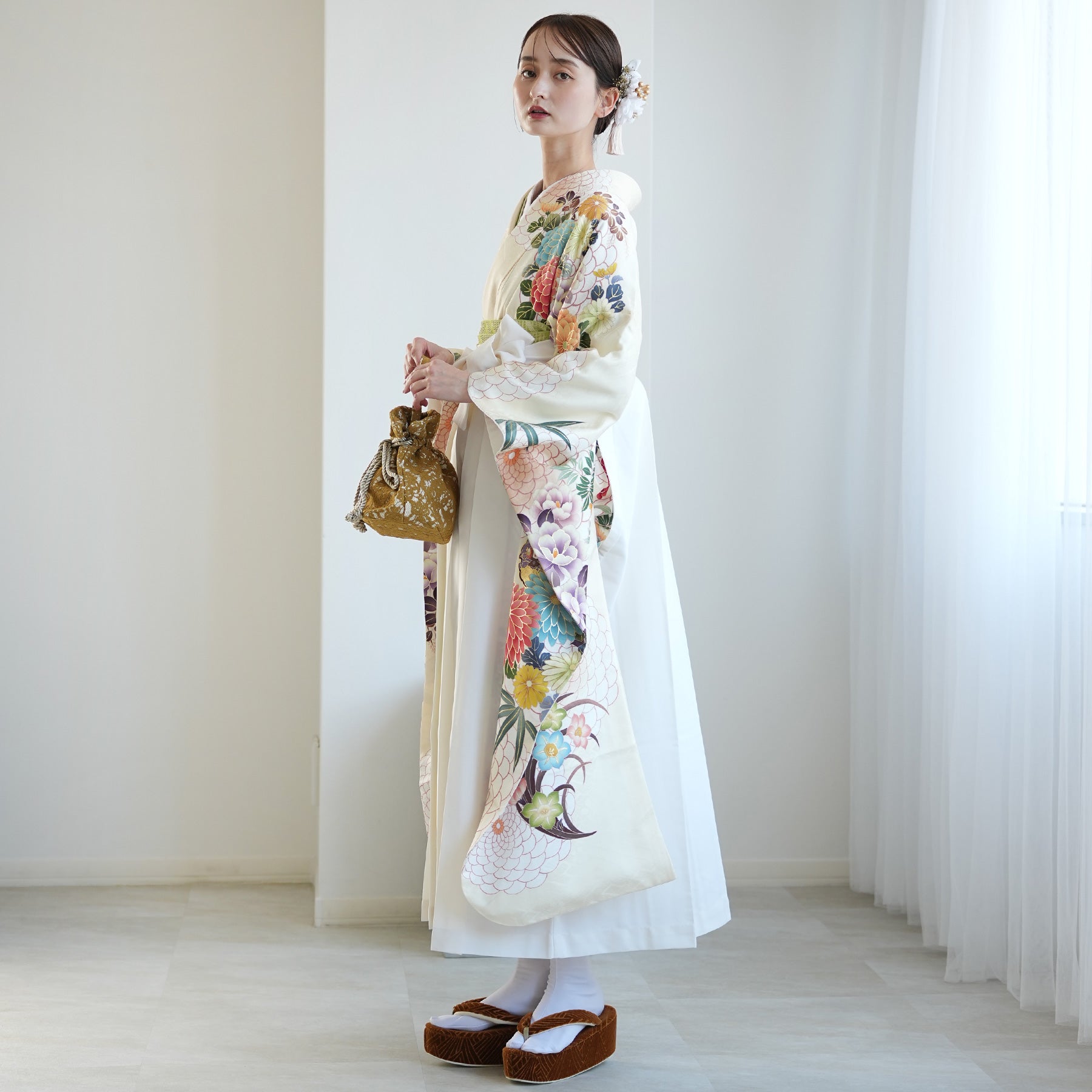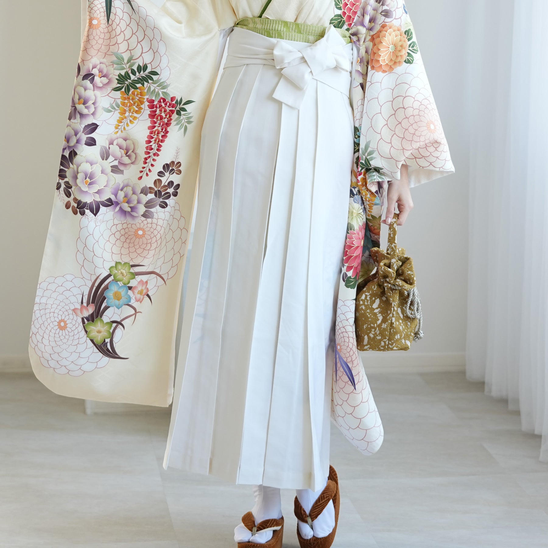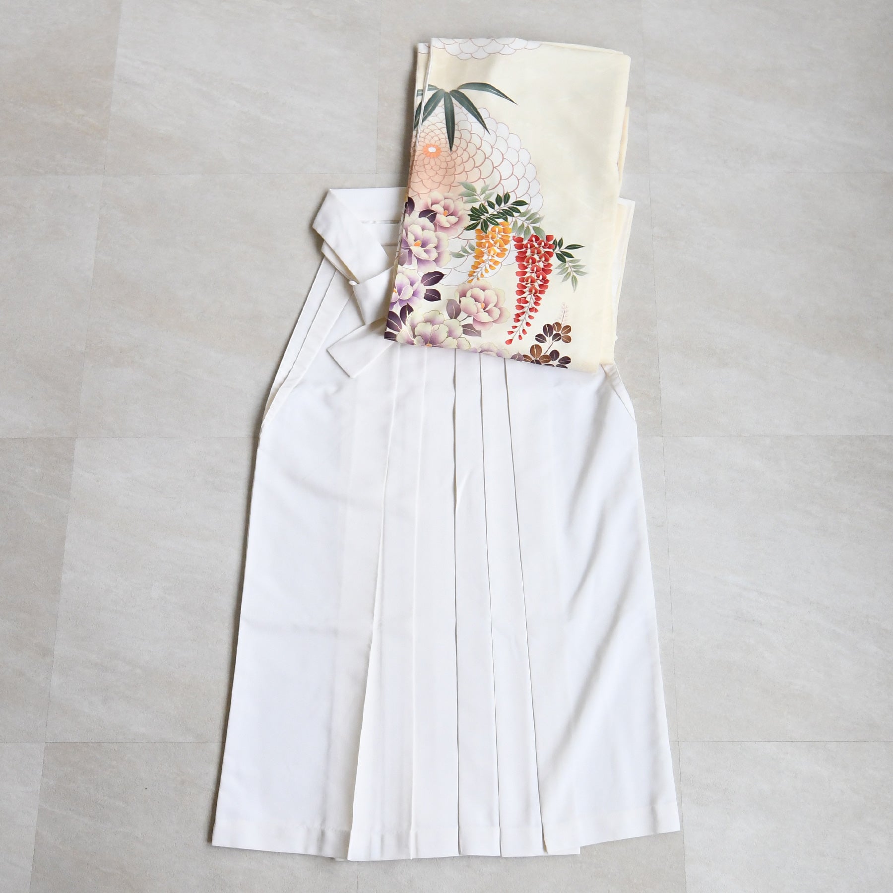 【レンタル】 袴 18点セット クリームに大きな丸菊と藤 正絹振袖着物 袴91cm(身長153-158cm) ブーツ着用時165cmまで適応  卒業式 大学生にも(1014651511)