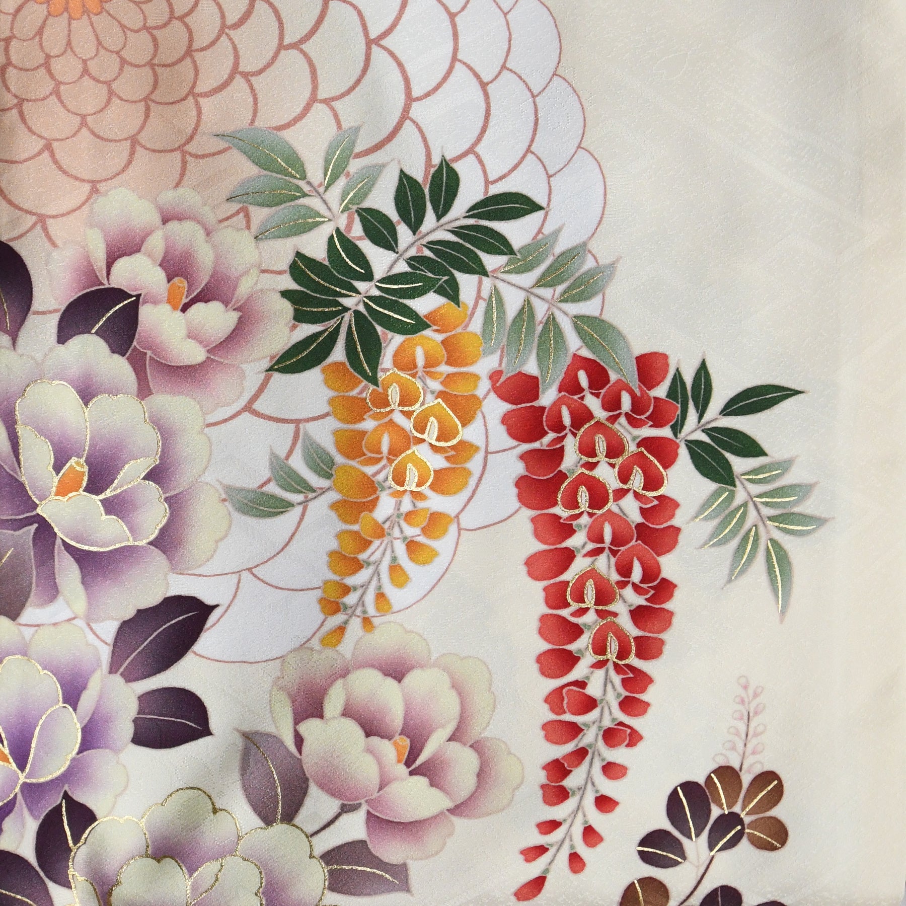 【レンタル】 袴 18点セット クリームに大きな丸菊と藤 正絹振袖着物 袴91cm(身長153-158cm) ブーツ着用時165cmまで適応 卒業式 大学生にも(1014651511)