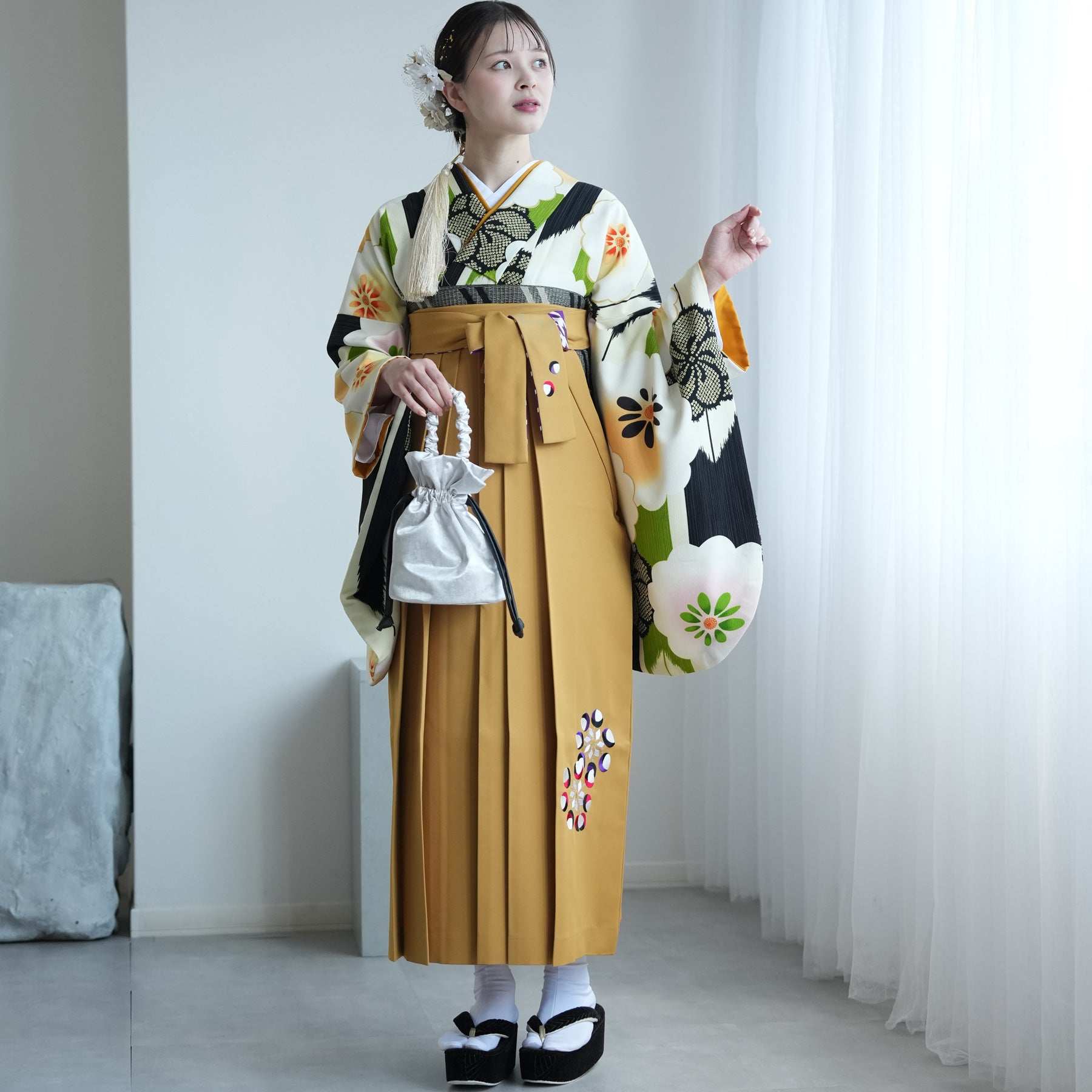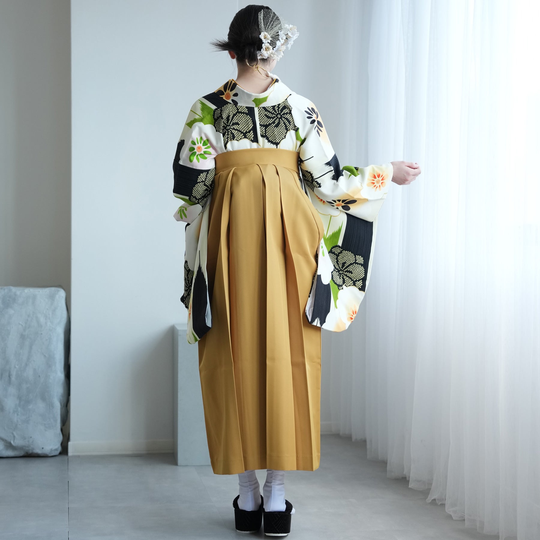 | [ 実寸サイズ ] | 着物:身丈 約108cm・袖丈 約76cm・裄丈 約68cm 袴丈91cm・95cm・99cm 足袋・草履 ワンサイズ(フリーサイズ) ※約23cm-24cm前後に対応 ※ソックスタイプストレッチ足袋 |
