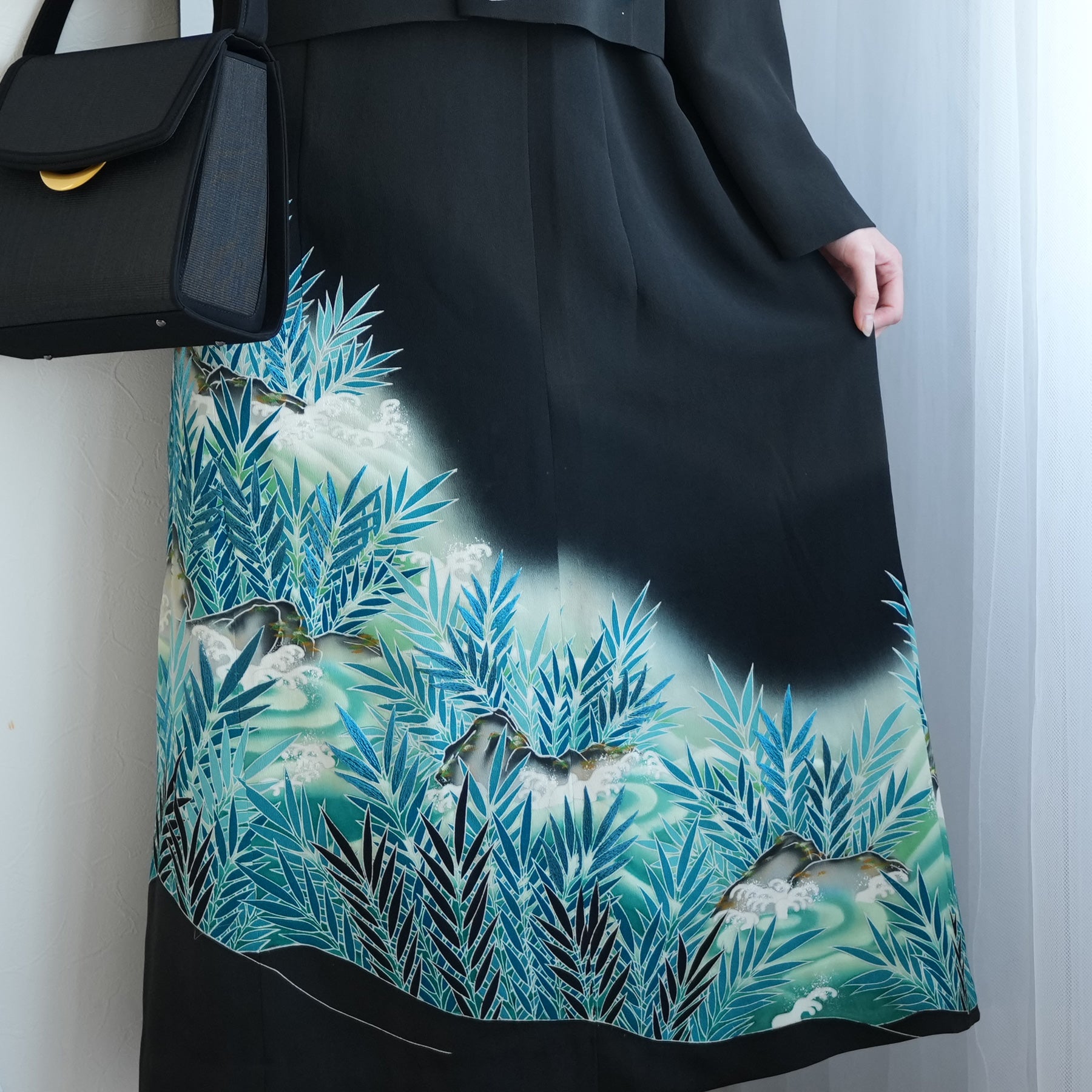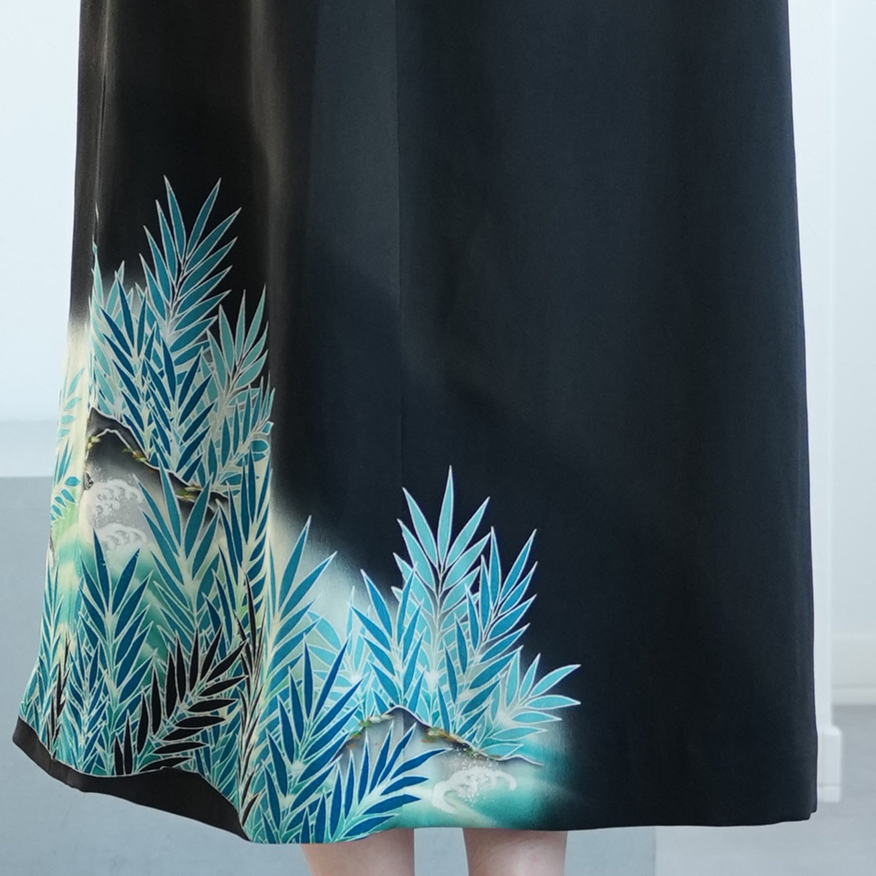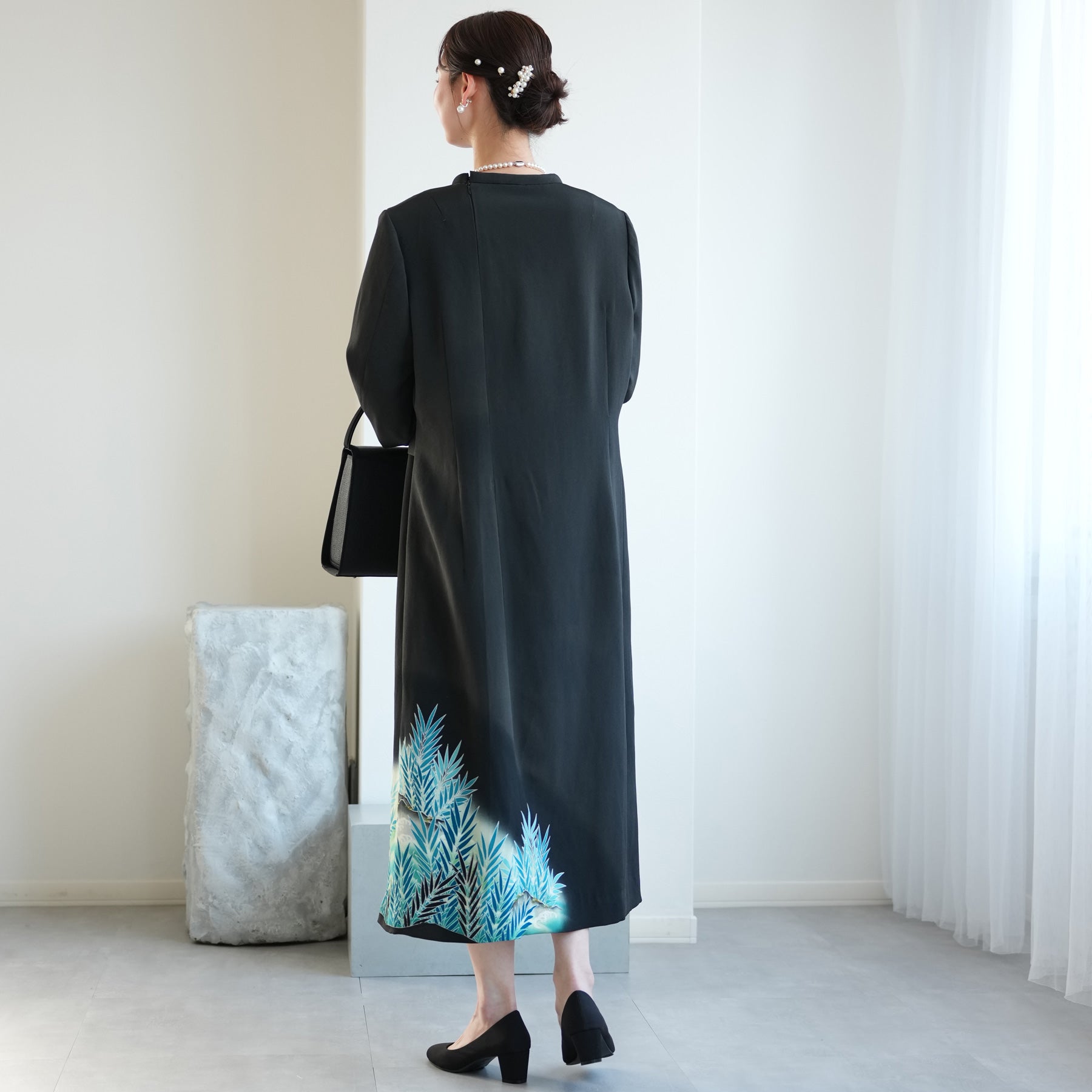 裾元に広がる絵柄は、祝いの席にふさわしい優雅な存在感を放ち、控えめながらも凛とした印象を演出します。和の伝統とドレスの洗練が調和した、特別な日のためのフォーマルウェアです。