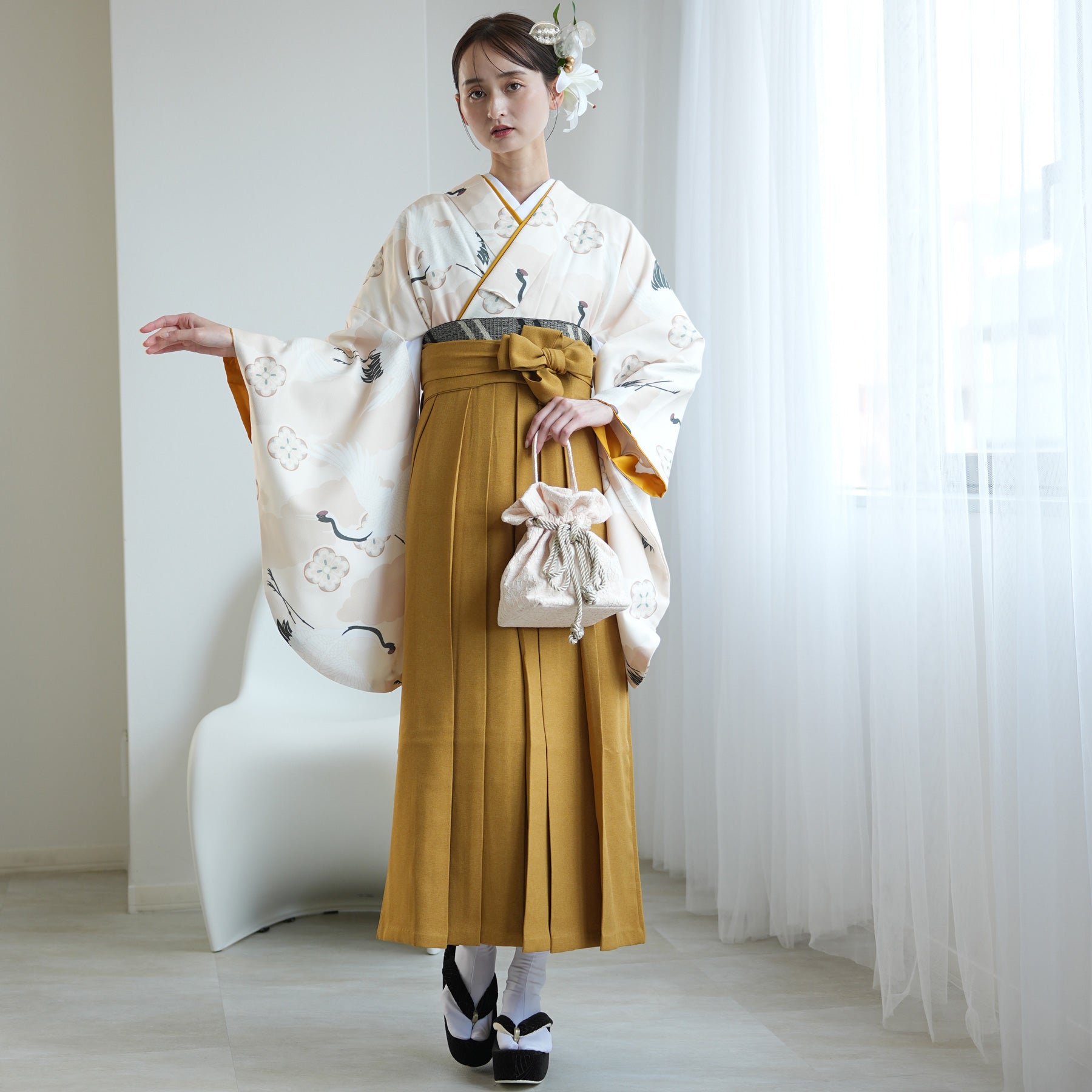 古典柄にマスタードカラーの袴がポイント。